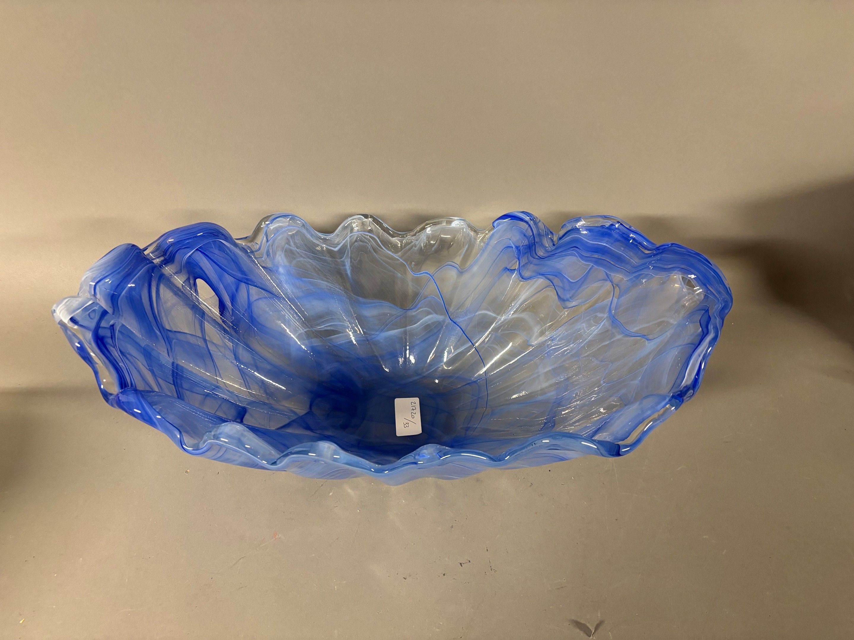 MURANO, 20th century. Blue and transparent glass bowl with contoured rim. H 20 cm x 52.5 x 27 cm. Murano label.