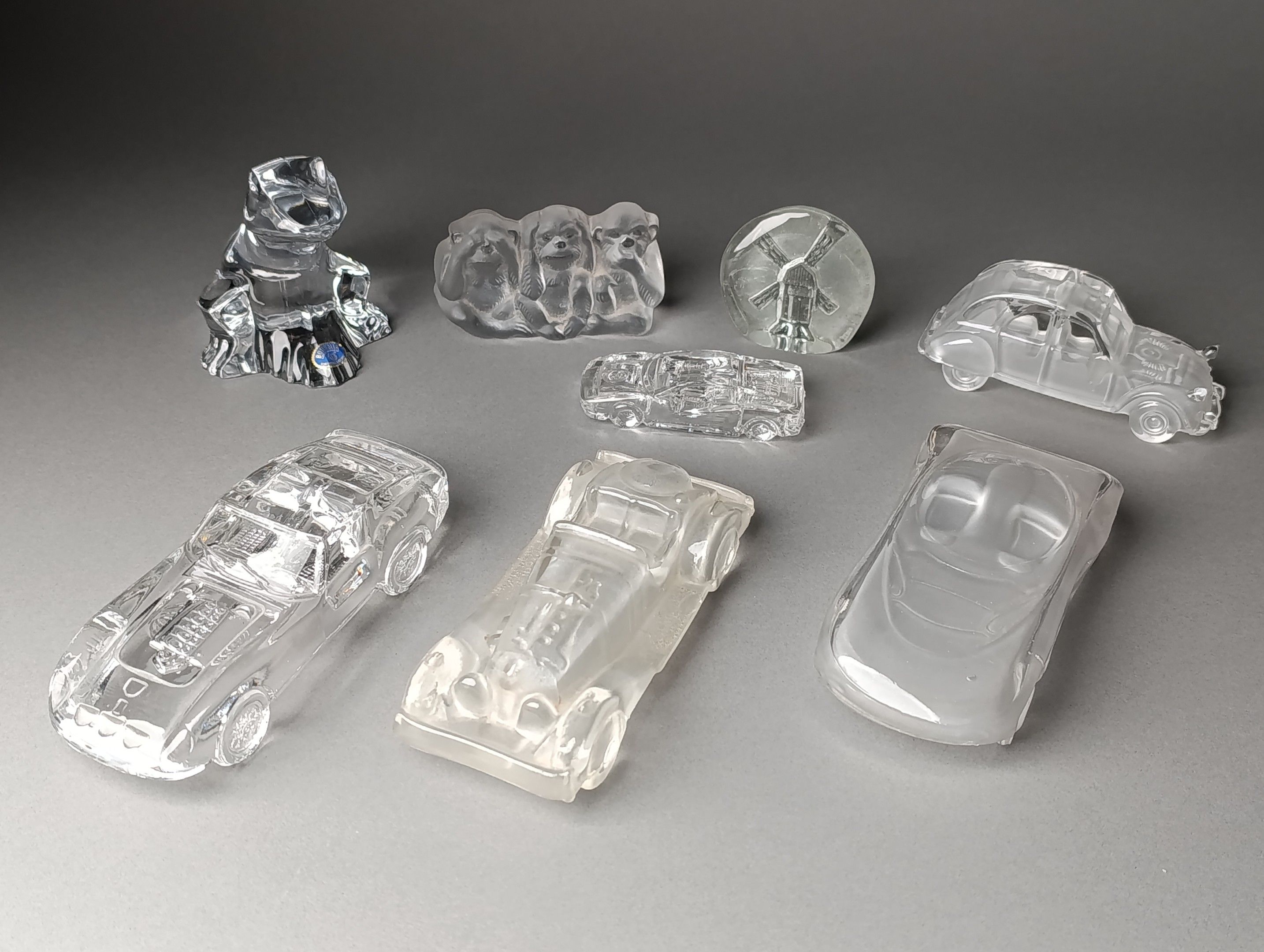 LOT OF FROSTED POLISHED OR CRYSTAL MOULDED GLASS PAPER PRINTERS depicting cars, monkeys....L. max 20 cm.