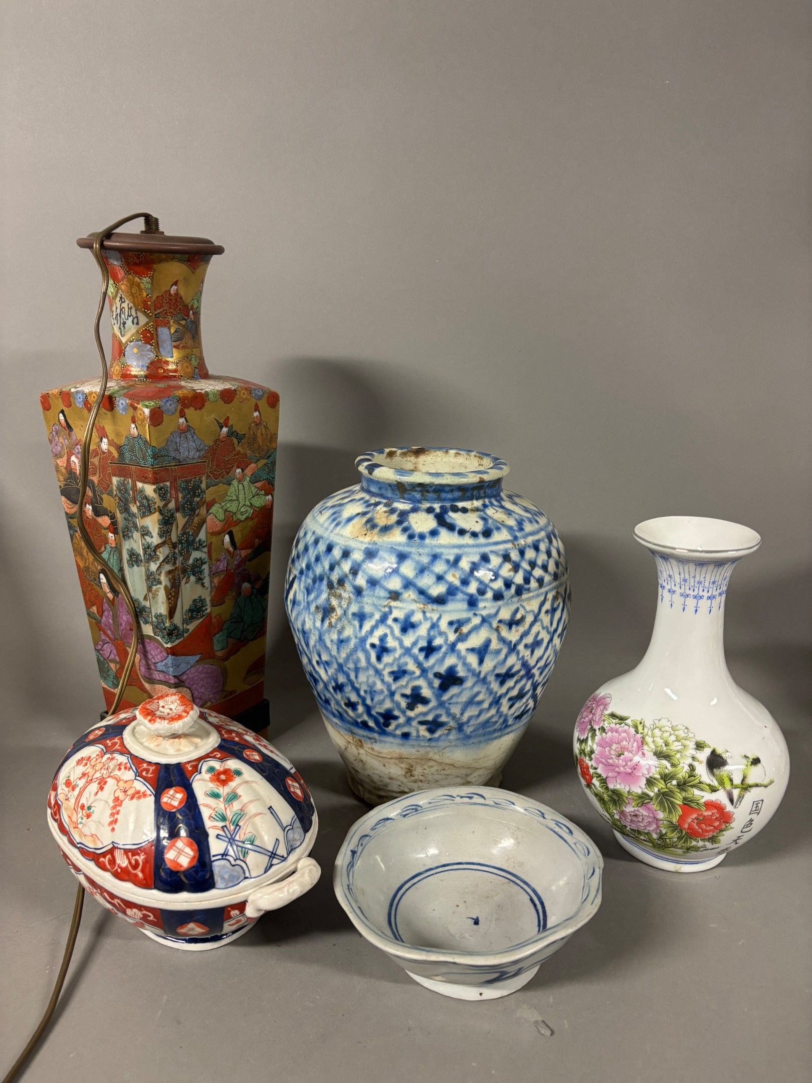 ASIA. Set consisting of a long-necked vase, an imari jardiniere, a vase, a lamp and a bowl