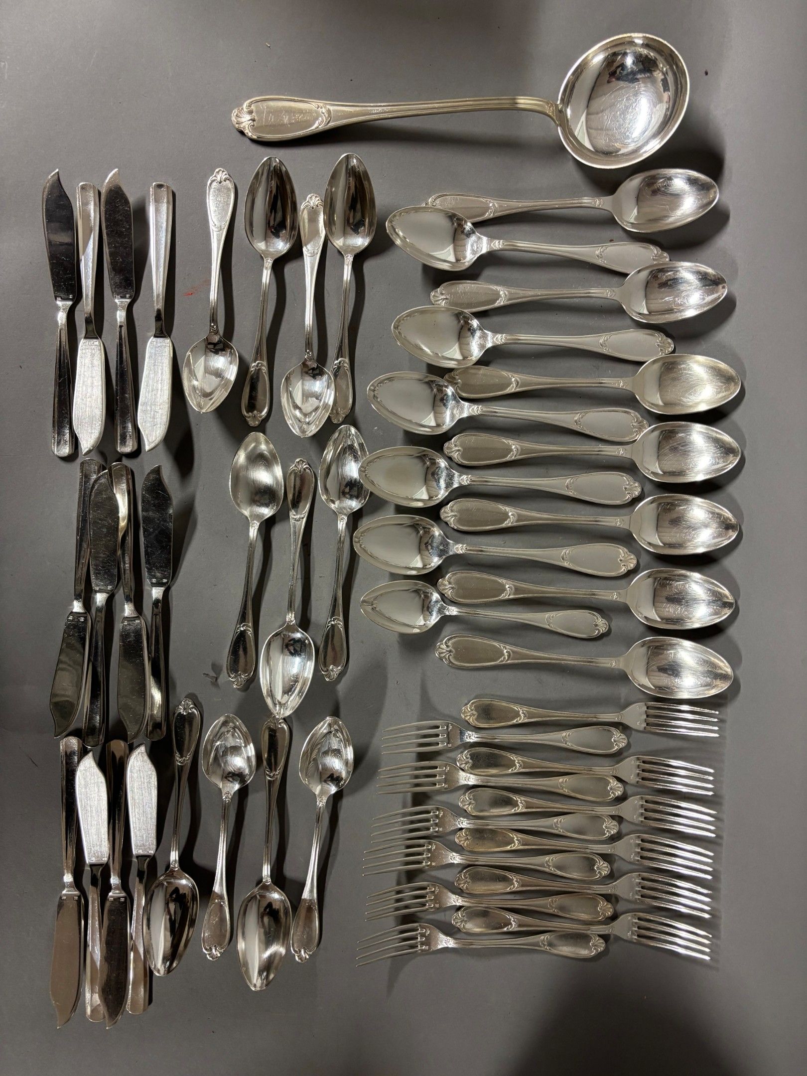 ERCUIS. Set of silver plated cutlery, 12 whisks, 12 soup spoons, 12 dessert spoons, 12 large forks, 12 small spoons, ladle.