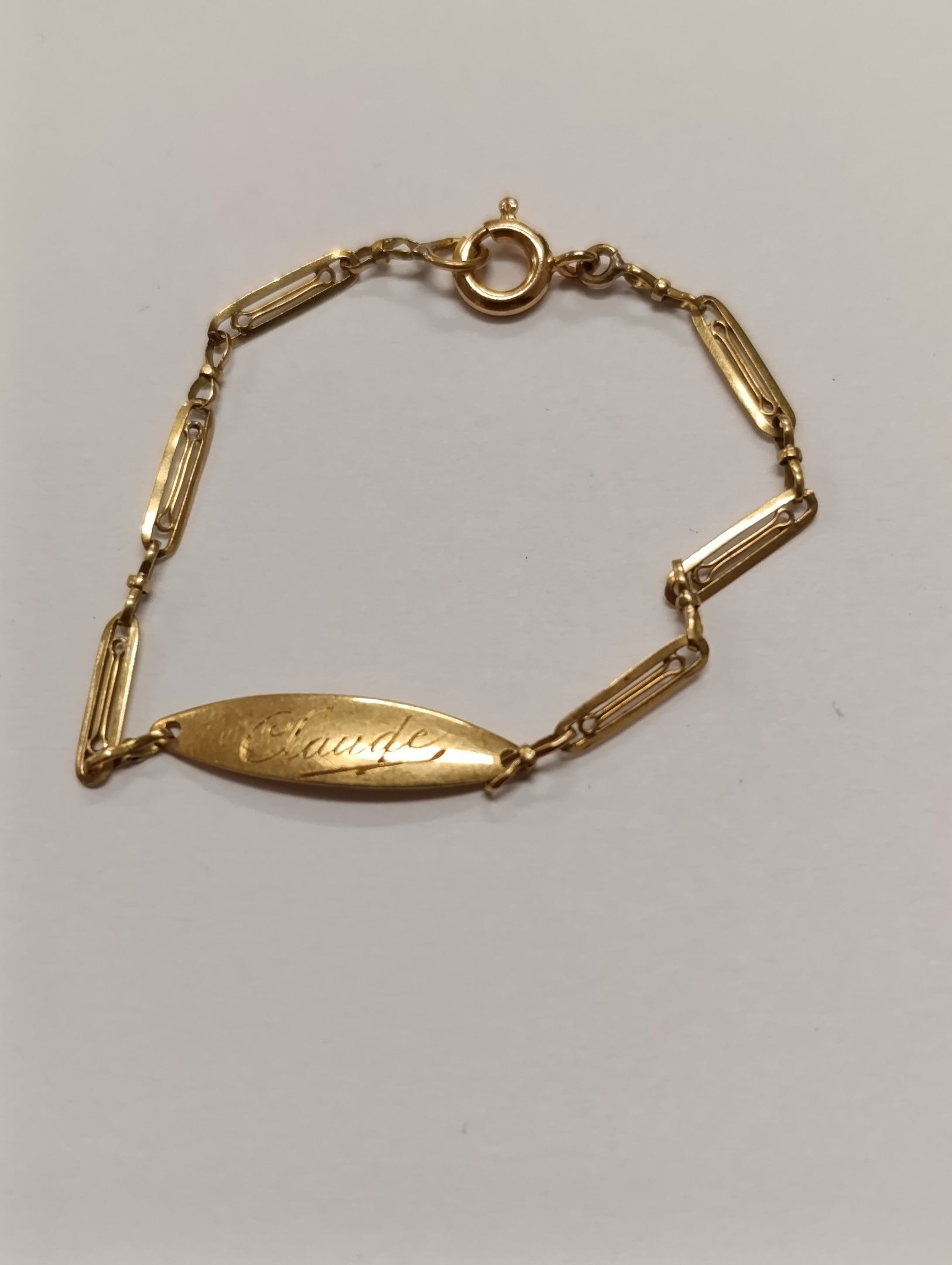 Claude" identity bracelet in 750 thousandths yellow gold. Eagle head hallmark. Net weight 1.34 g.