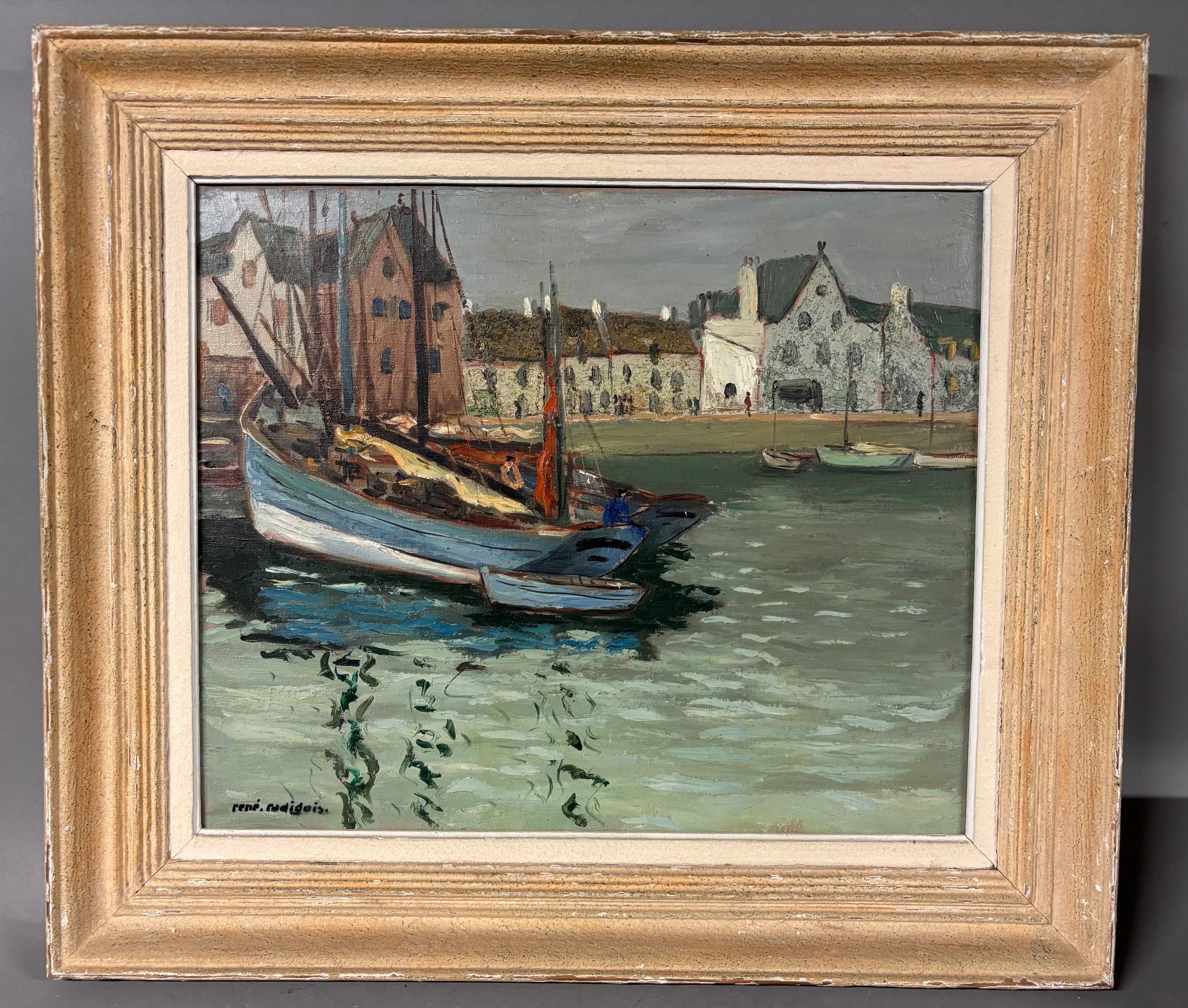 RENE RADIGOIS (XXth). Boat in the port. Oil on canvas signed lower left. 47 x55 cm. Framed.