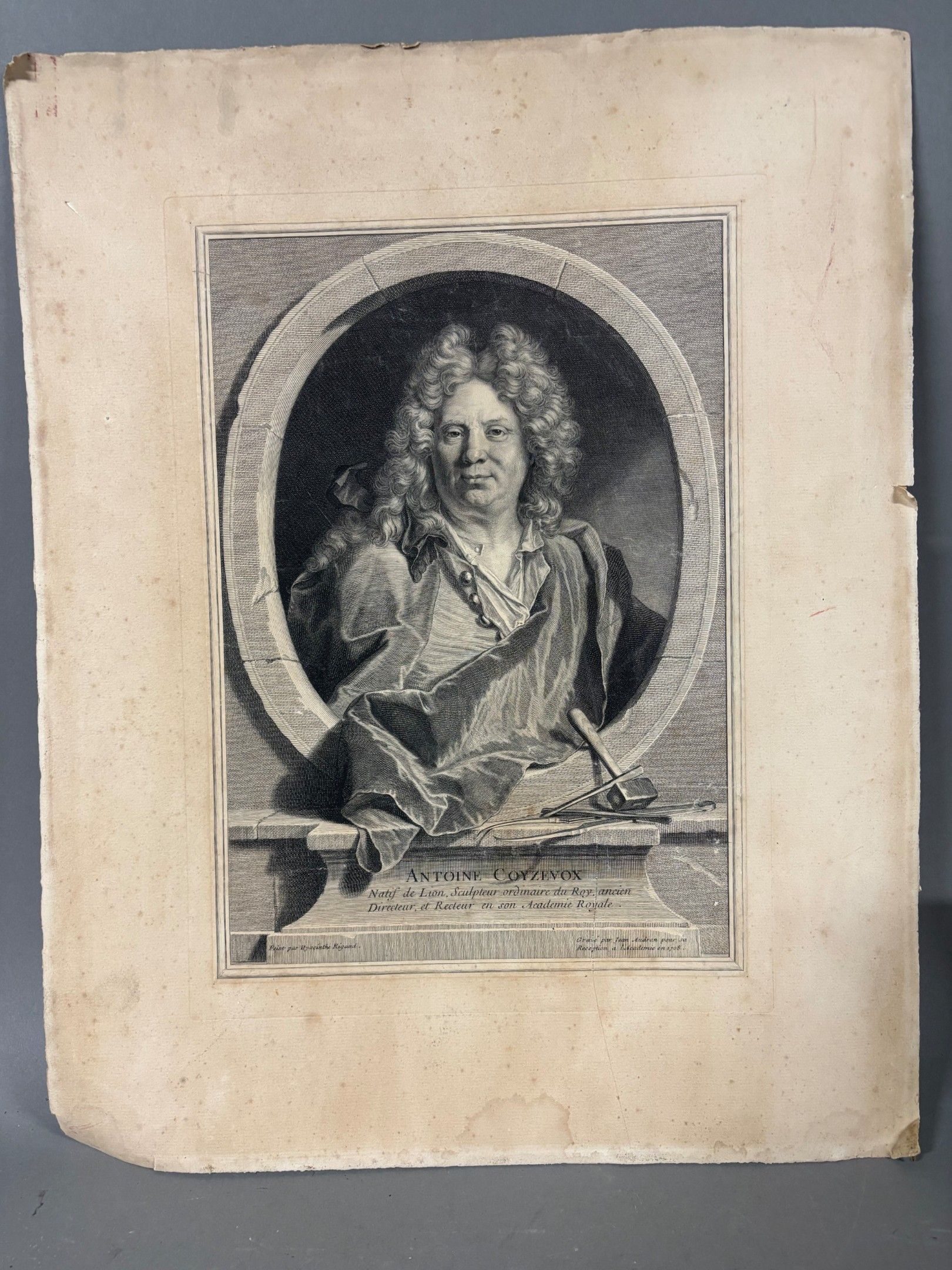 After Hyacinthe RIGAUD, engraved by Jean AUDRAN for his reception at the Academy in 1708. Portrait of Antoine COYZEVOX". Black and white engraving. 40 x 28,5 cm. Scratches, scattered foxing.