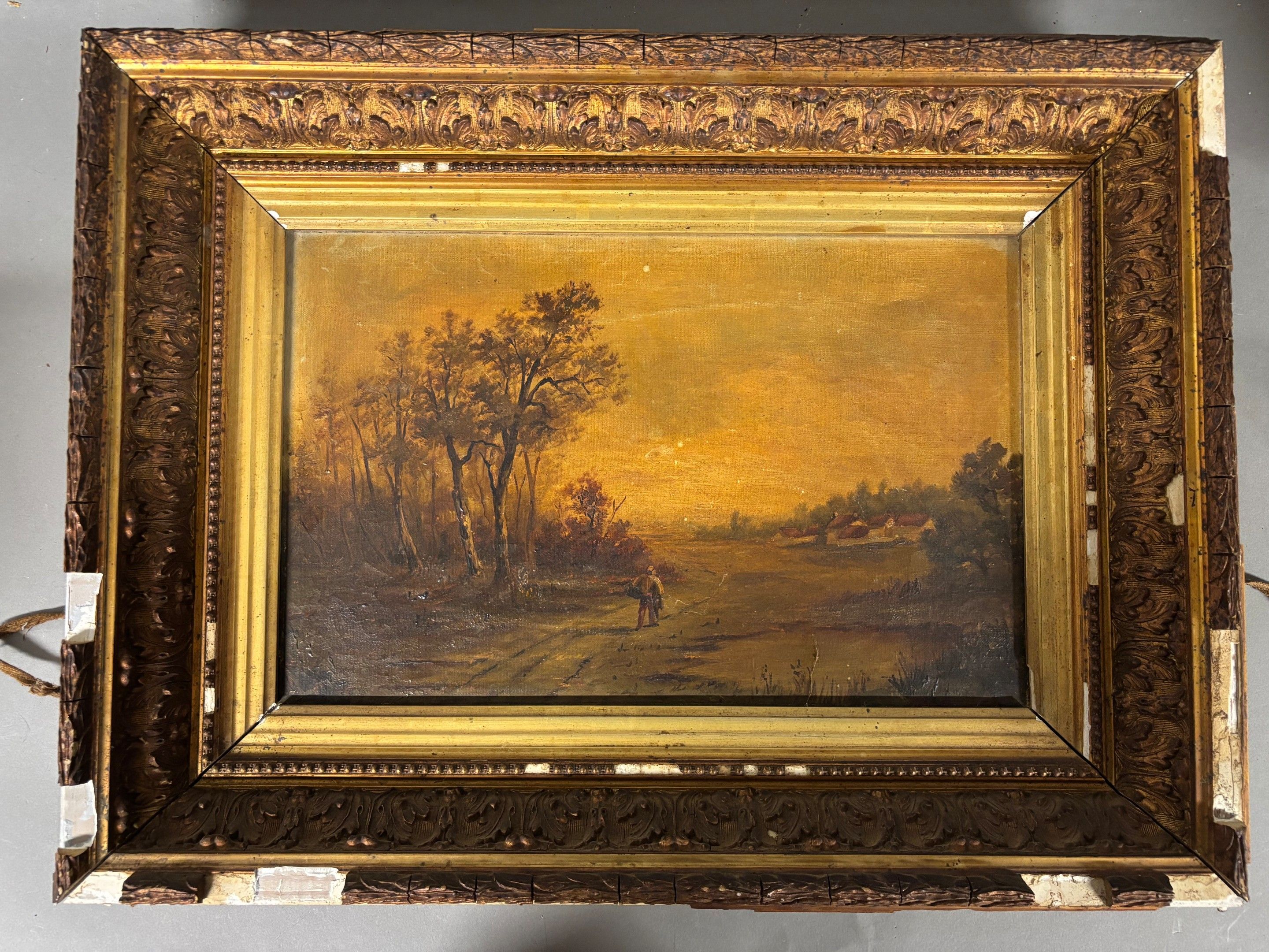 FRENCH SCHOOL.Country landscape. Oil on canvas signed lower right ( adéchiffrer). 25 x 38 cm. Gilt frame (MAnques.