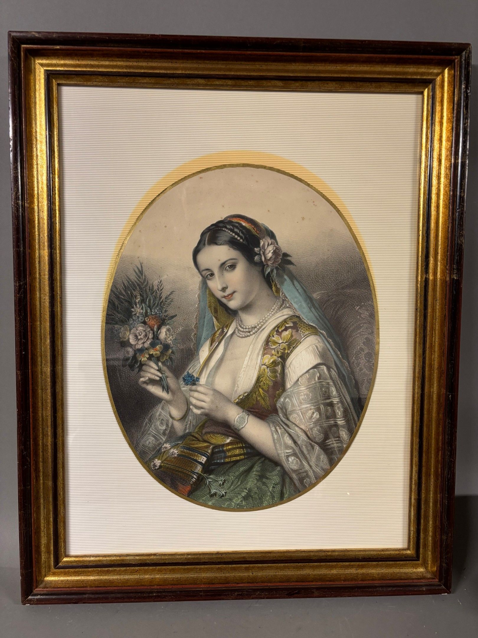 Woman with bouquet. Lithograph with oval view, enhanced in colours. Work of the 19th century. Frame under glass, slightly detached (traces of glue). Height 47 cm.