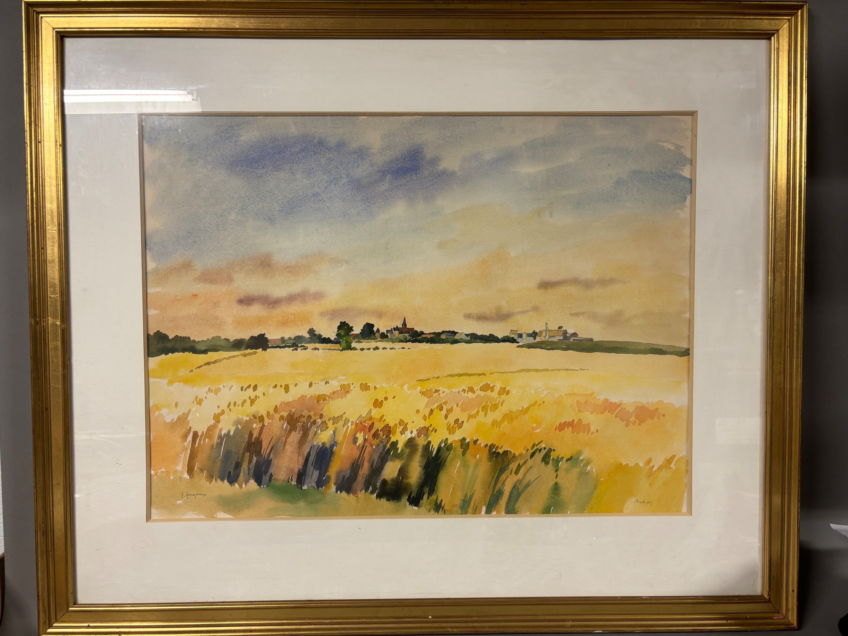 Jean FEUGEREUX (1923-1992). Landscape on a field. Watercolour on paper signed lower left, titled and dated 85 lower right. 52 x 70.5 cm. Framed under glass.