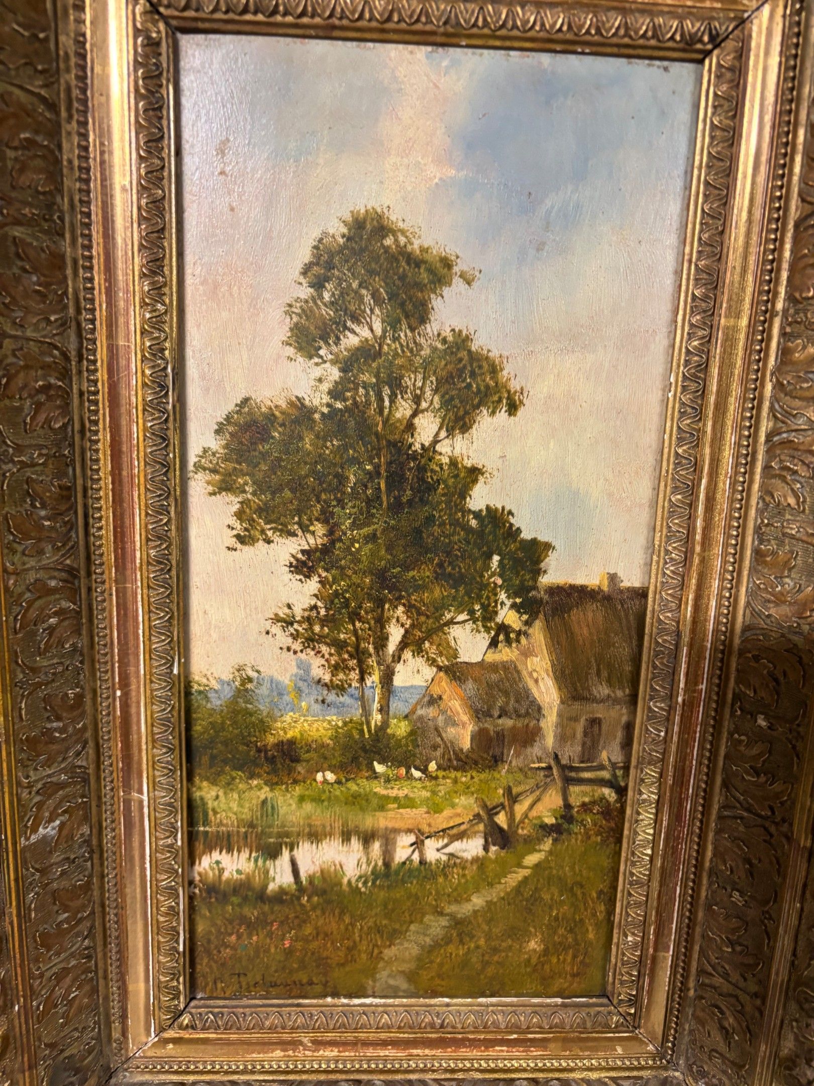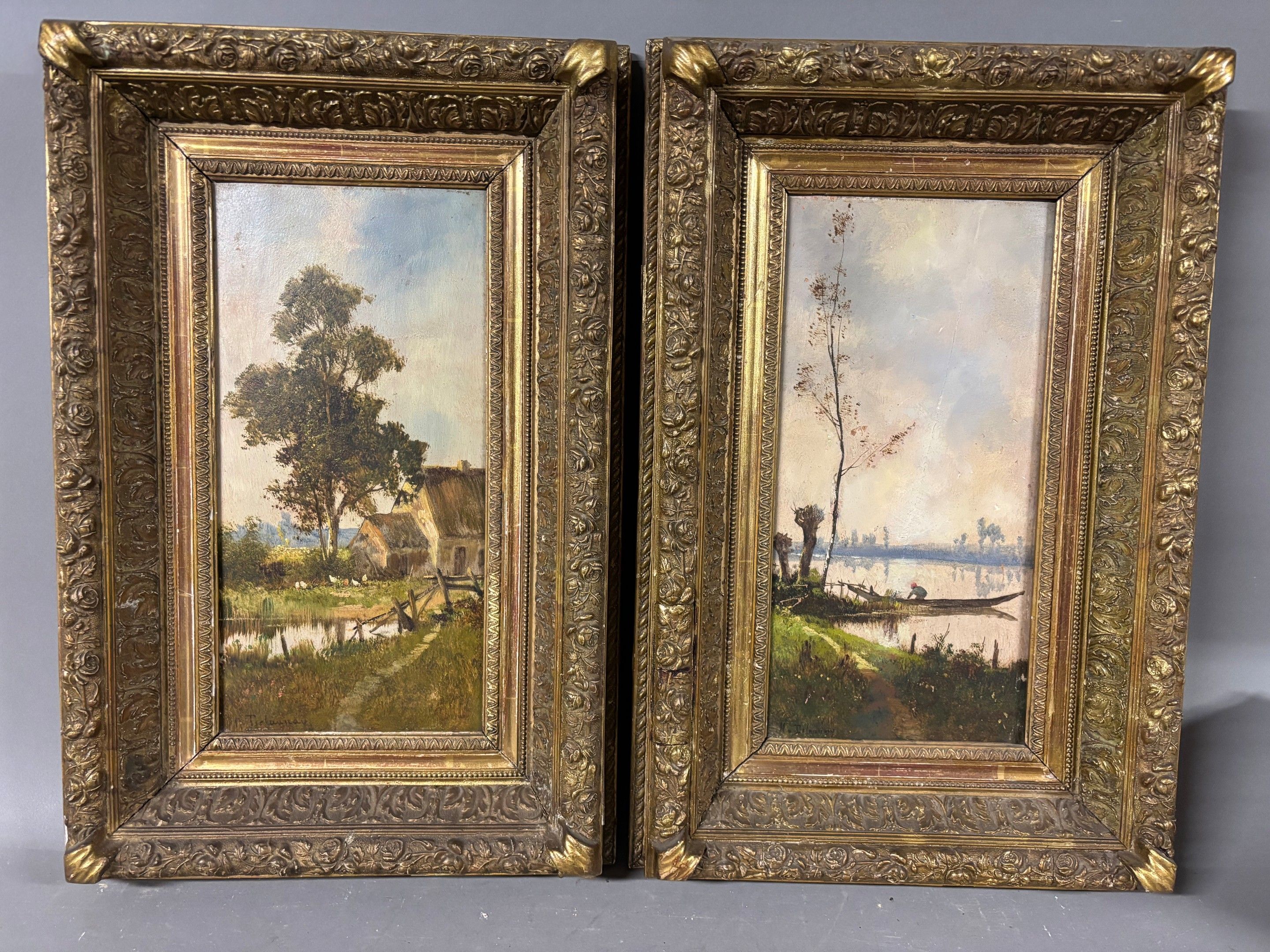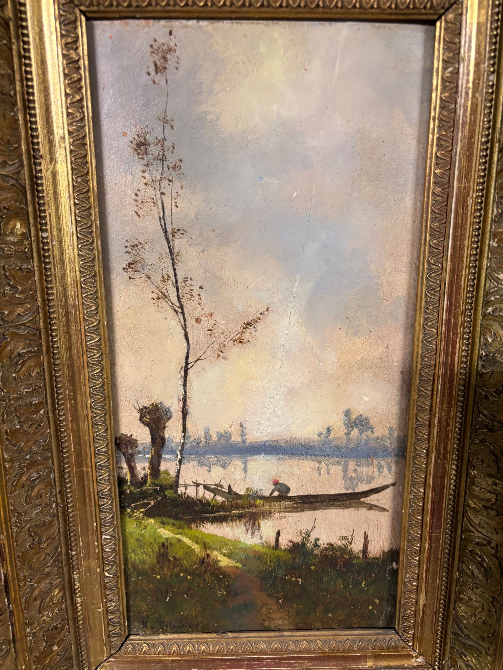 DELAUNAY (XXth). Pair of oils on panels signed lower left. Low court - boat with fisherman. 34 x 17 cm. Gilt frame. Crack in one oil restored.