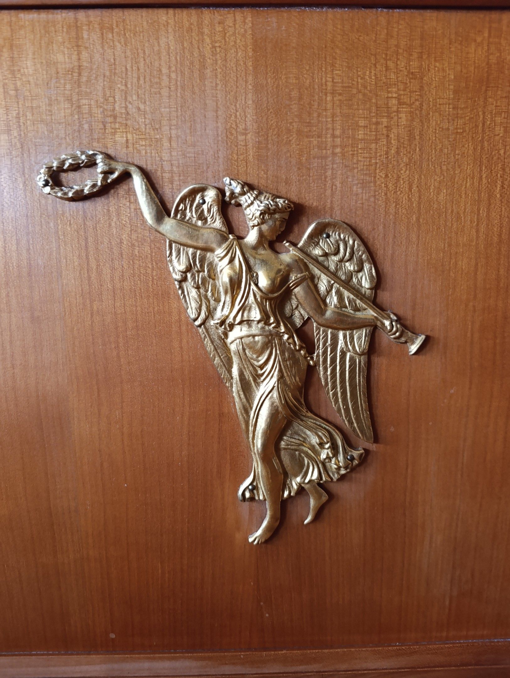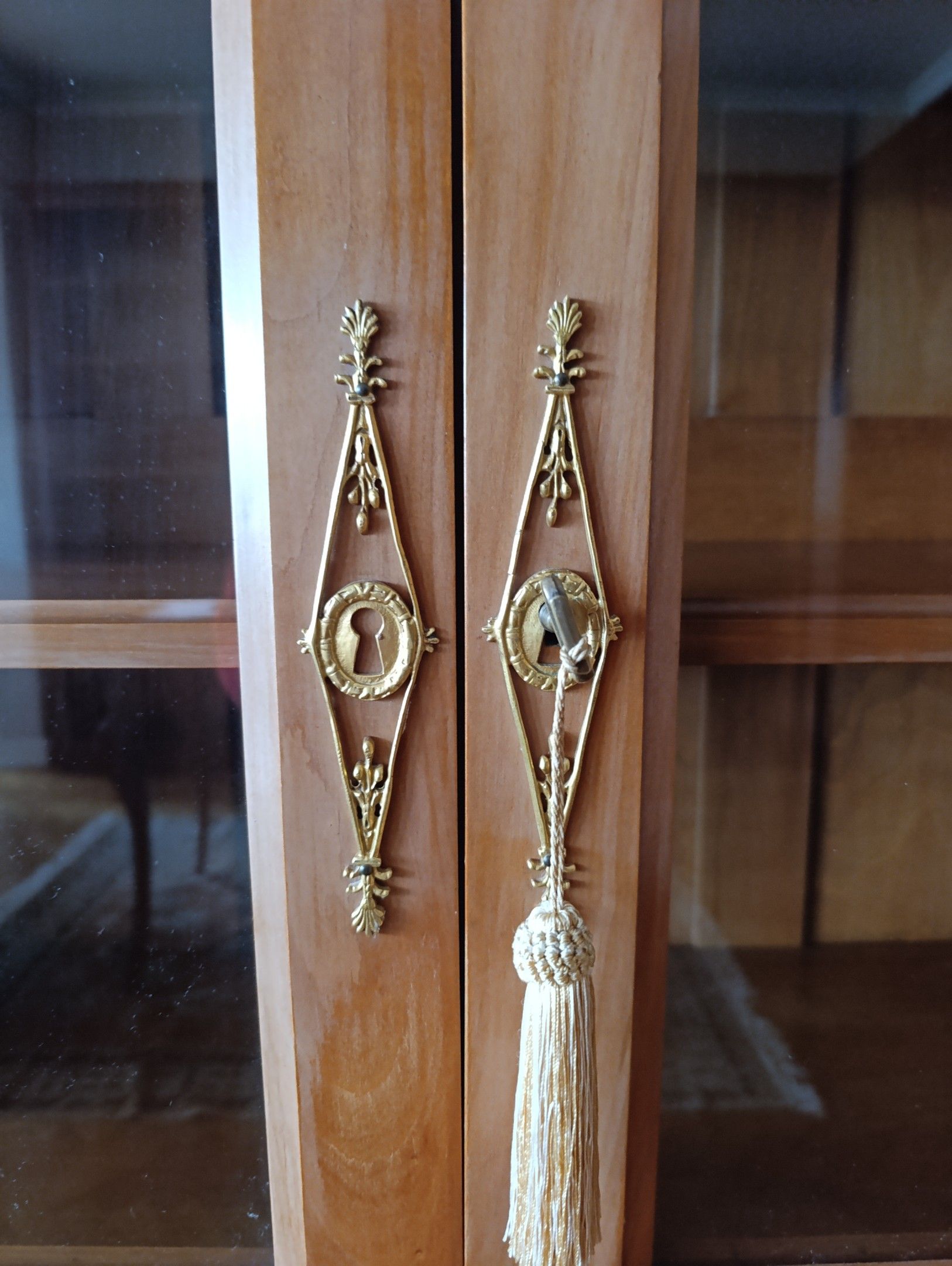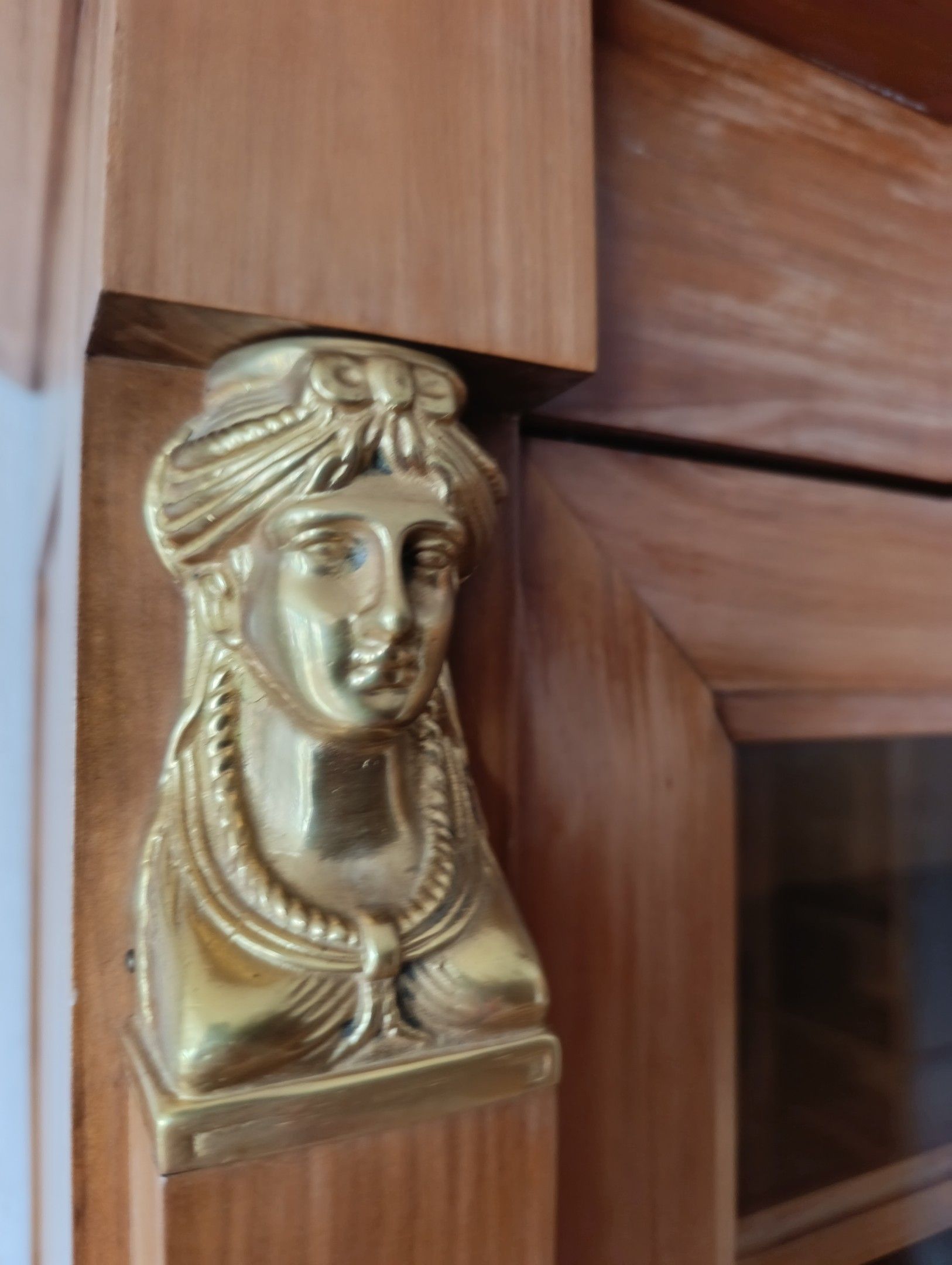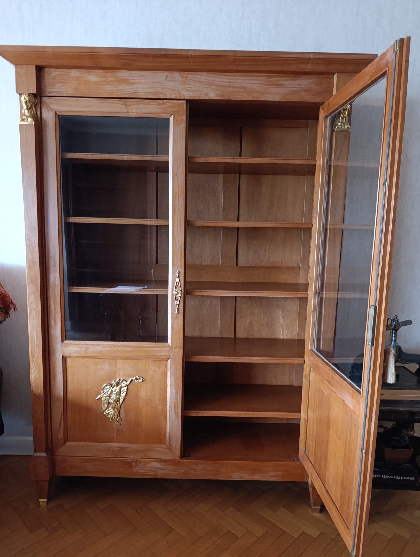 LIBRARY in natural wood, with two glass doors, framed by detached half-columns surmounted by busts of women. Key. Return from Egypt style, 20th century. 190 x 140 x 46 cm.