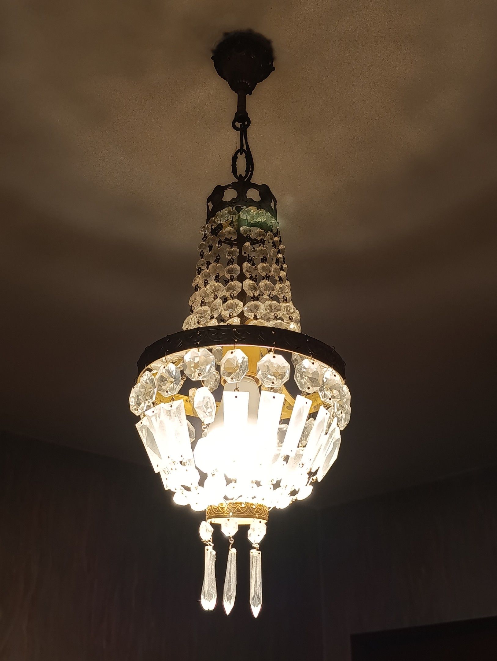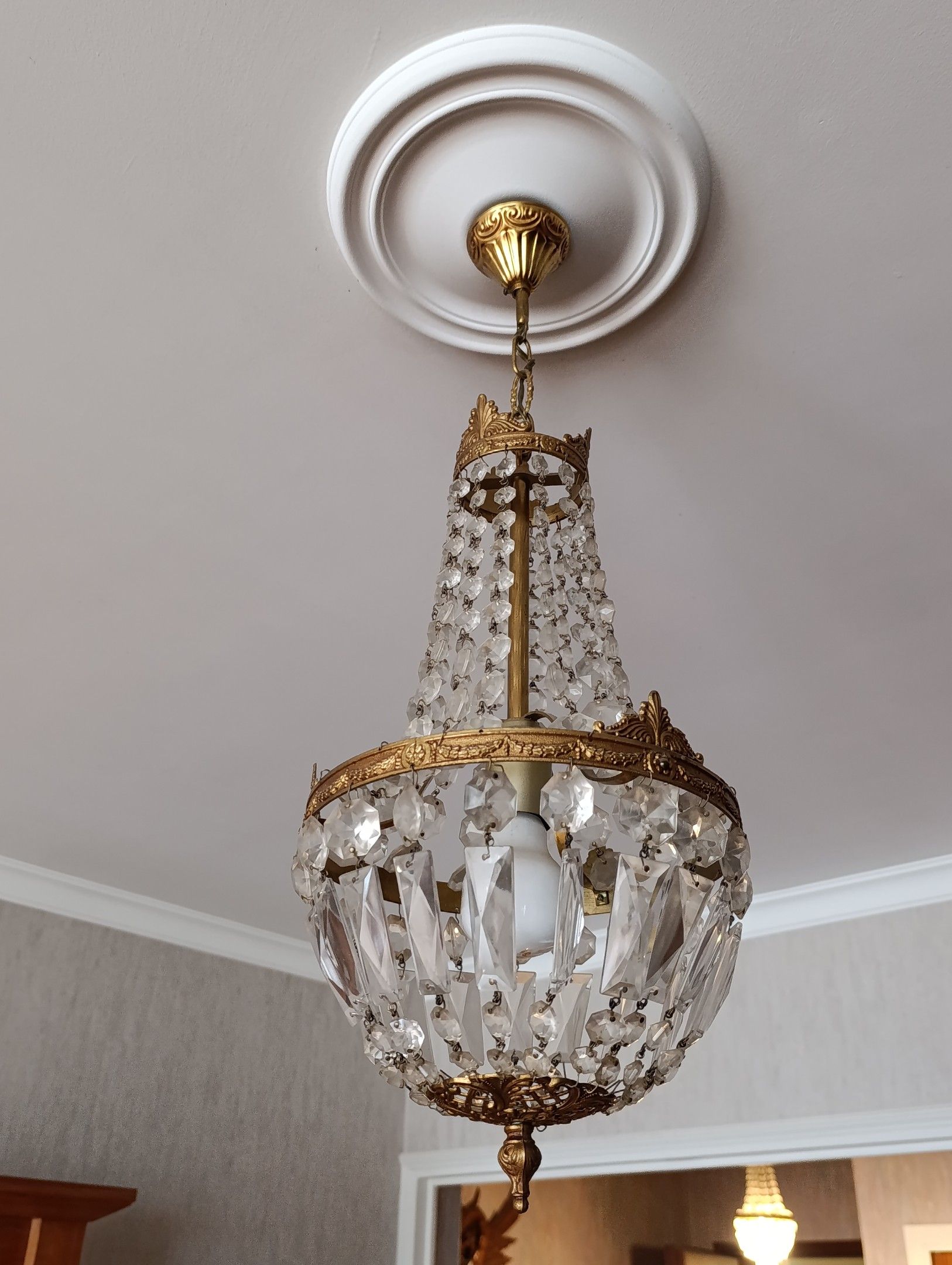 TWO MONGOLFIERE LUSTERS with pendants. 85 x 22 cm. Misses.