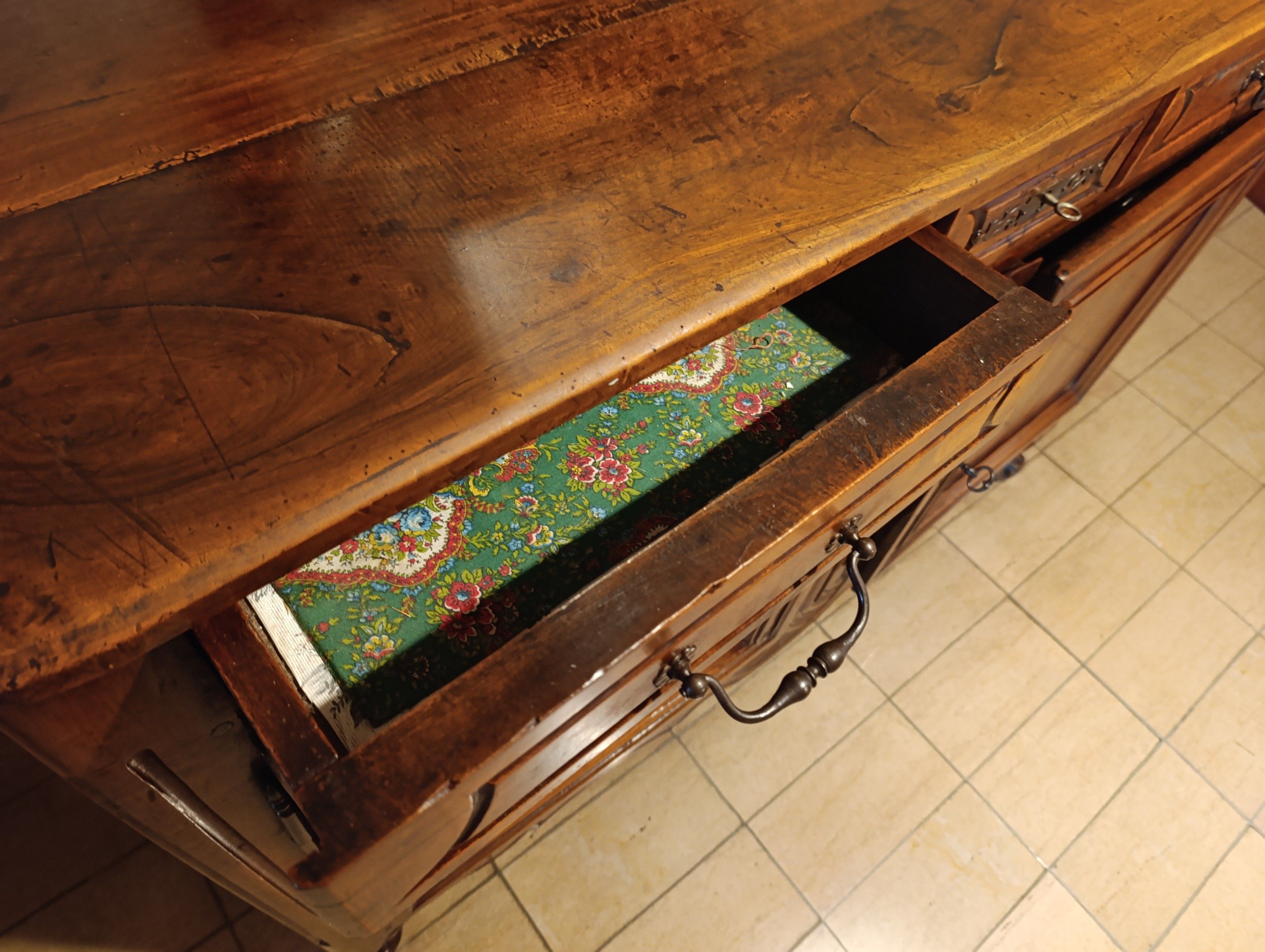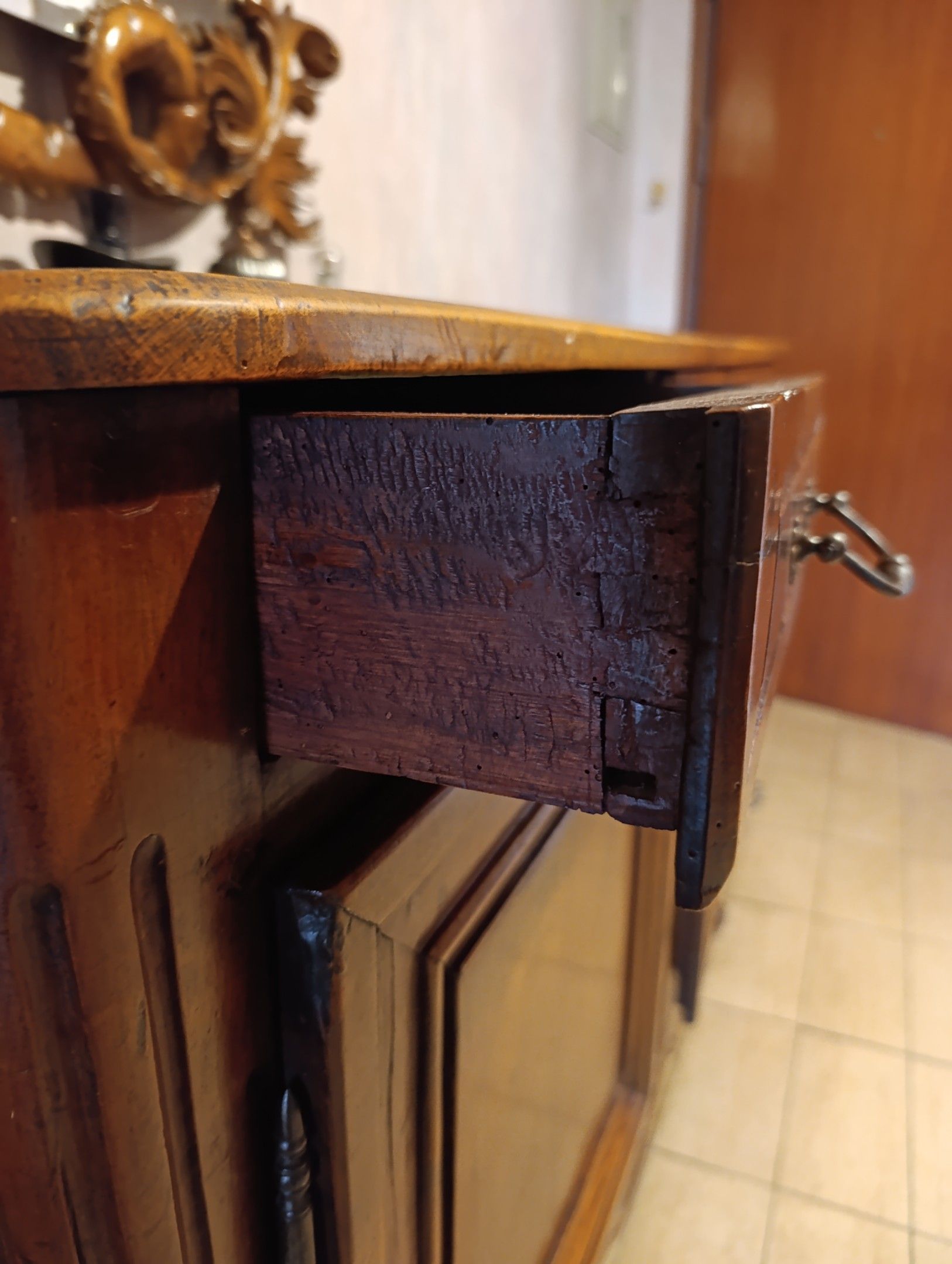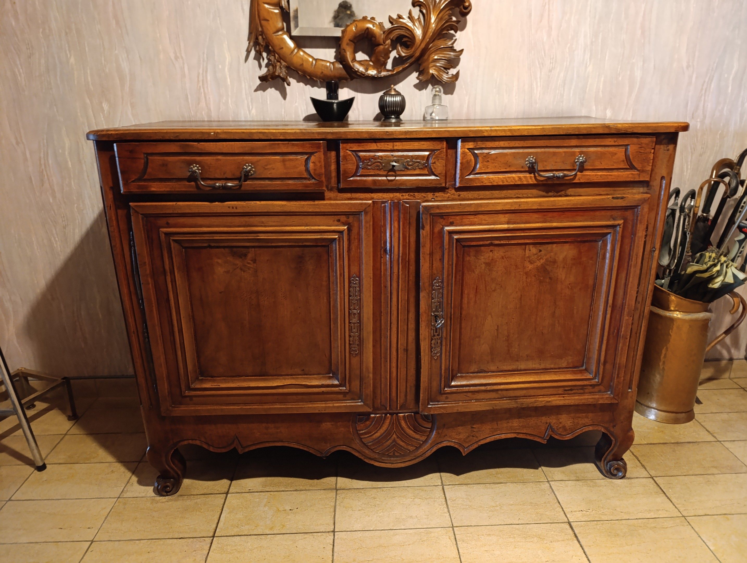 Low carved wooden sideboard opening on two doors and three drawers. 98 x 135 x 57 cm. Cracks.