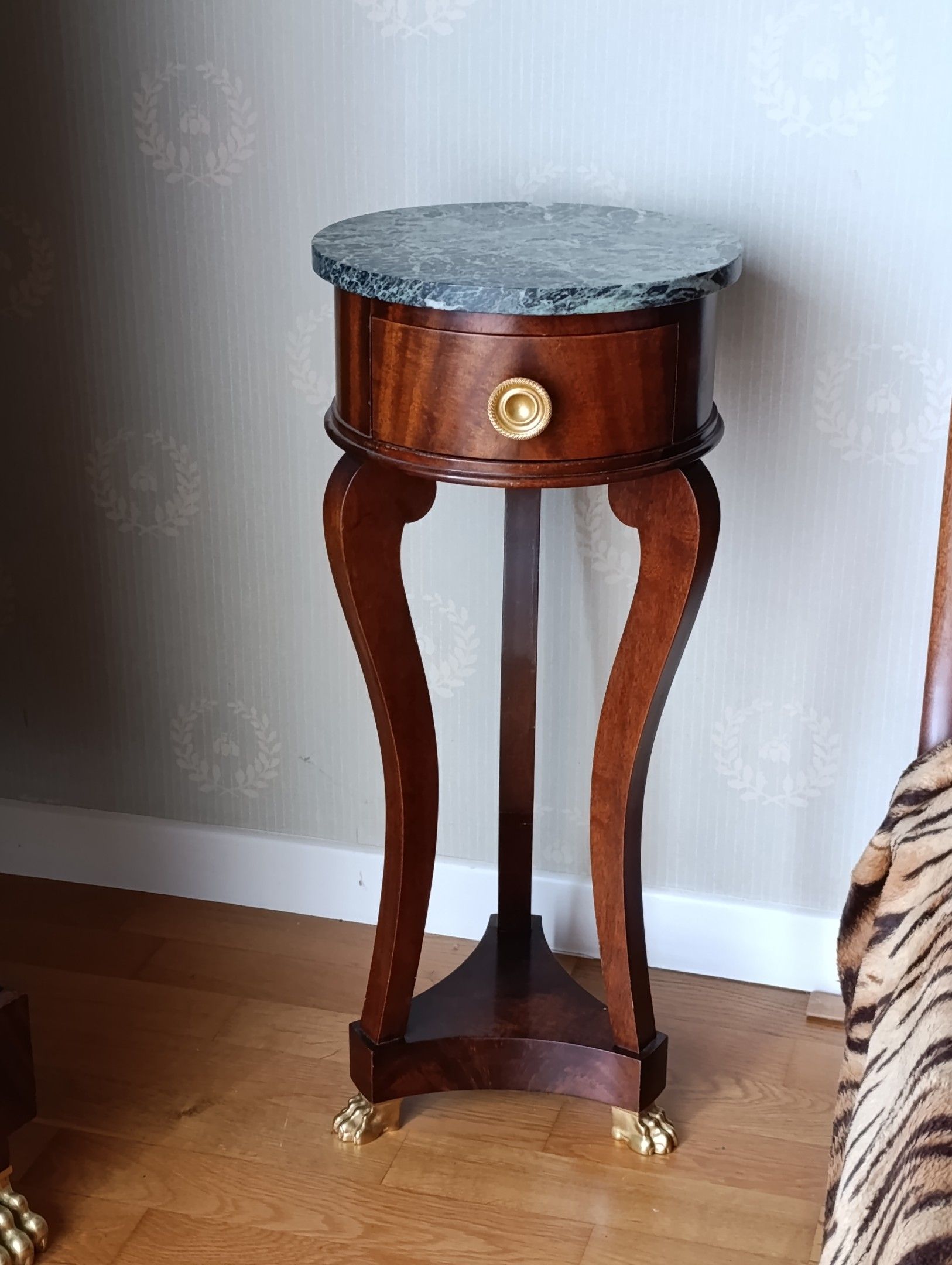 TWO mahogany NIGHT TABLES on tripod legs with claw feet, circular top in green marble, drawer in the waist. Empire style. 65 x 28 cm.