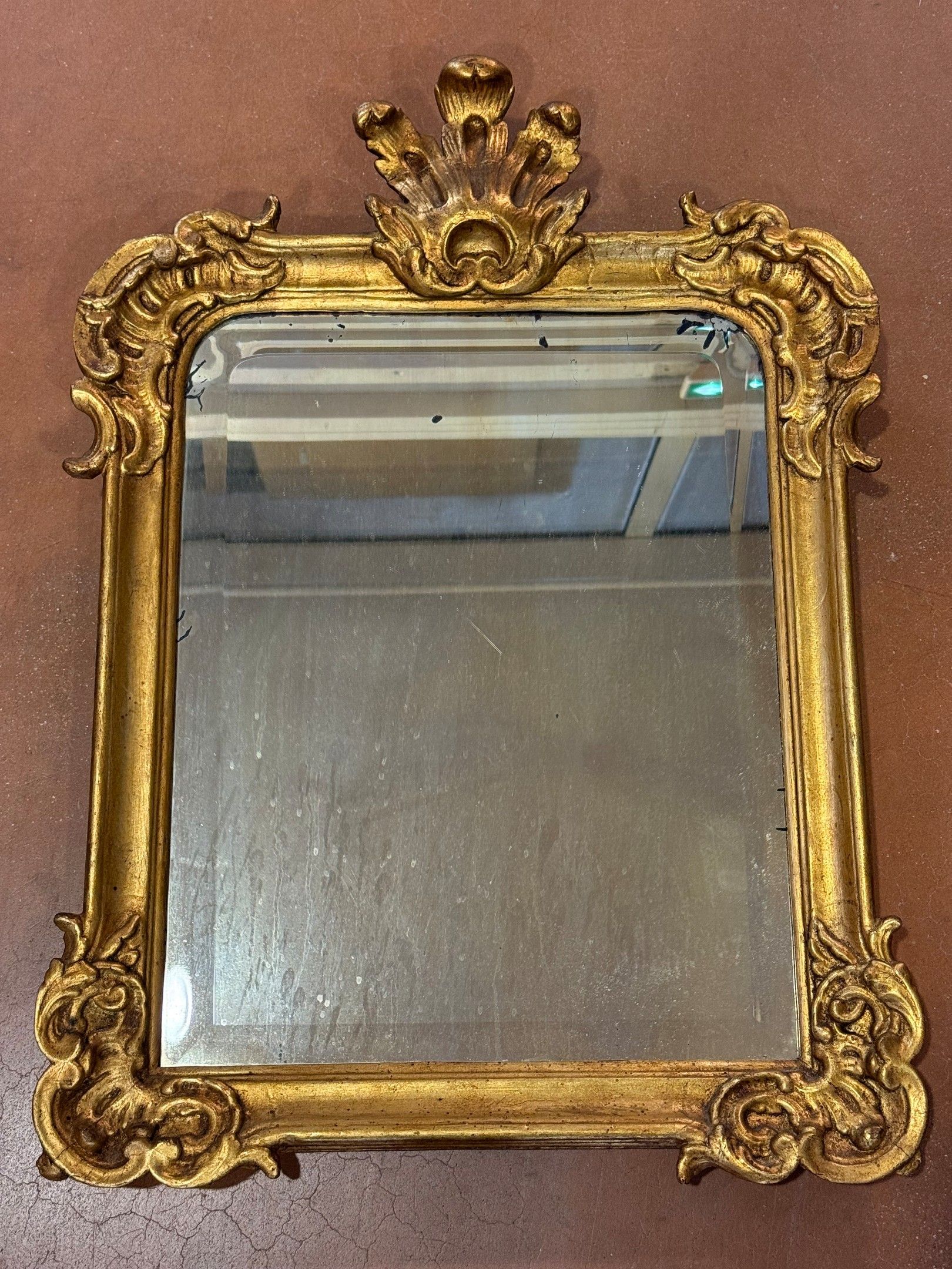 Wood and gilded stucco MIRROR with carved decoration in light relief. Restoration. 75 x 51 cm.