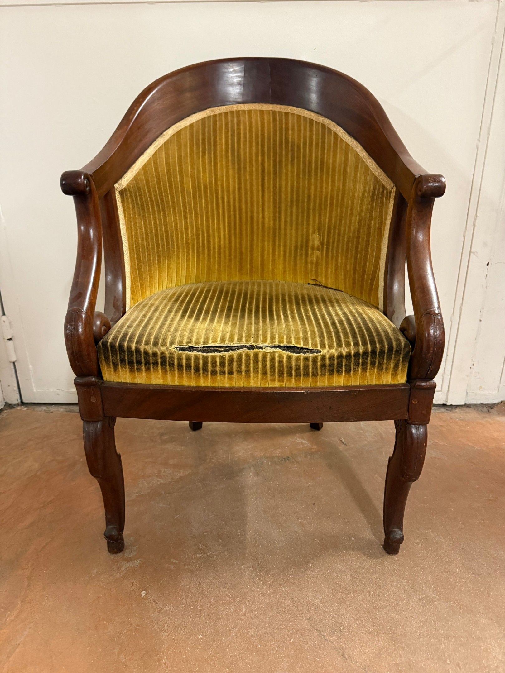 GONDOLA CHAIR in moulded wood. Scrolled arm console. Front hocked legs and rear sabre legs. Height 86 cm. Louis Philippe period. Damage to the upholstery. Some restorations. Ref 332