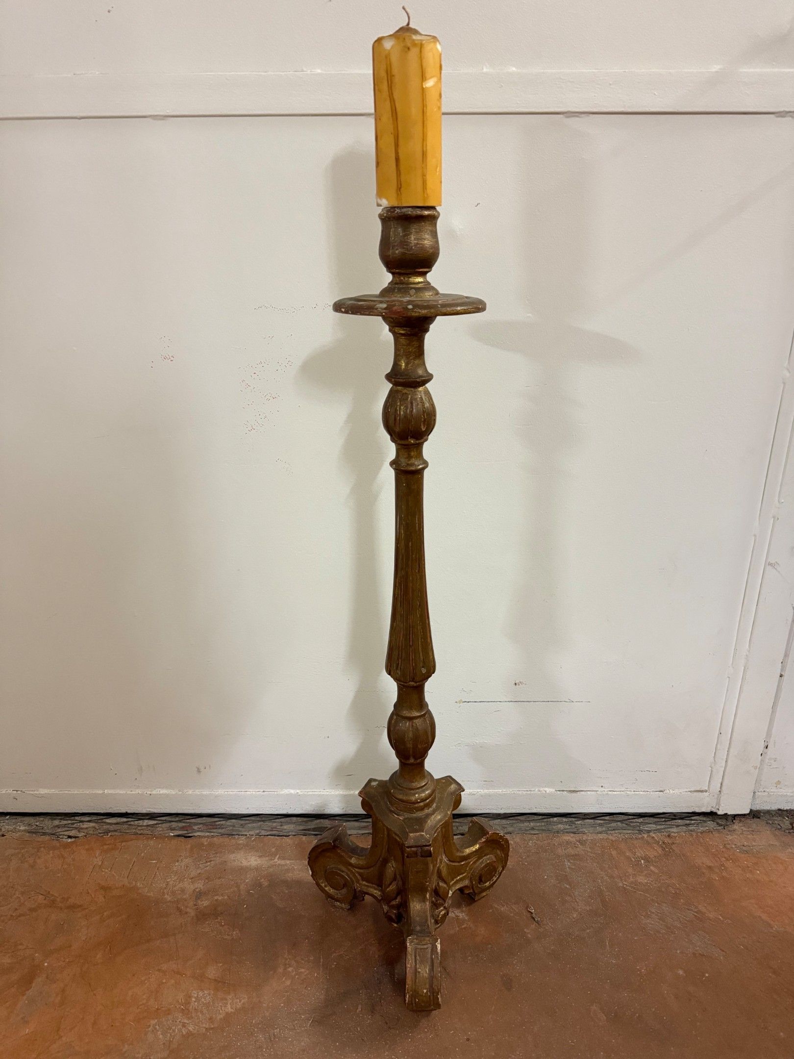 Moulded and gilded wooden PIQUE-CIERGE. Tripod base. Height 89 cm. Wear and tear.