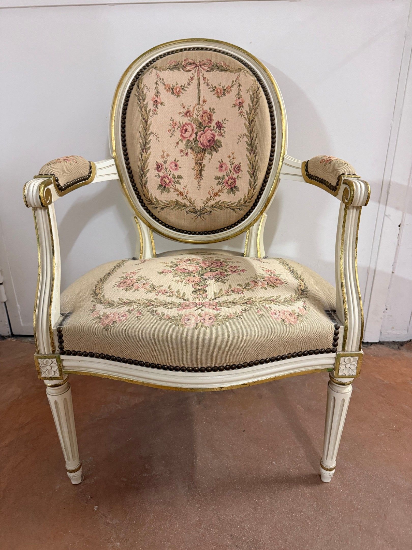 Lacquered wood armchair with medallion back and armrests. Louis XVI style. Rose bouquet decoration.
