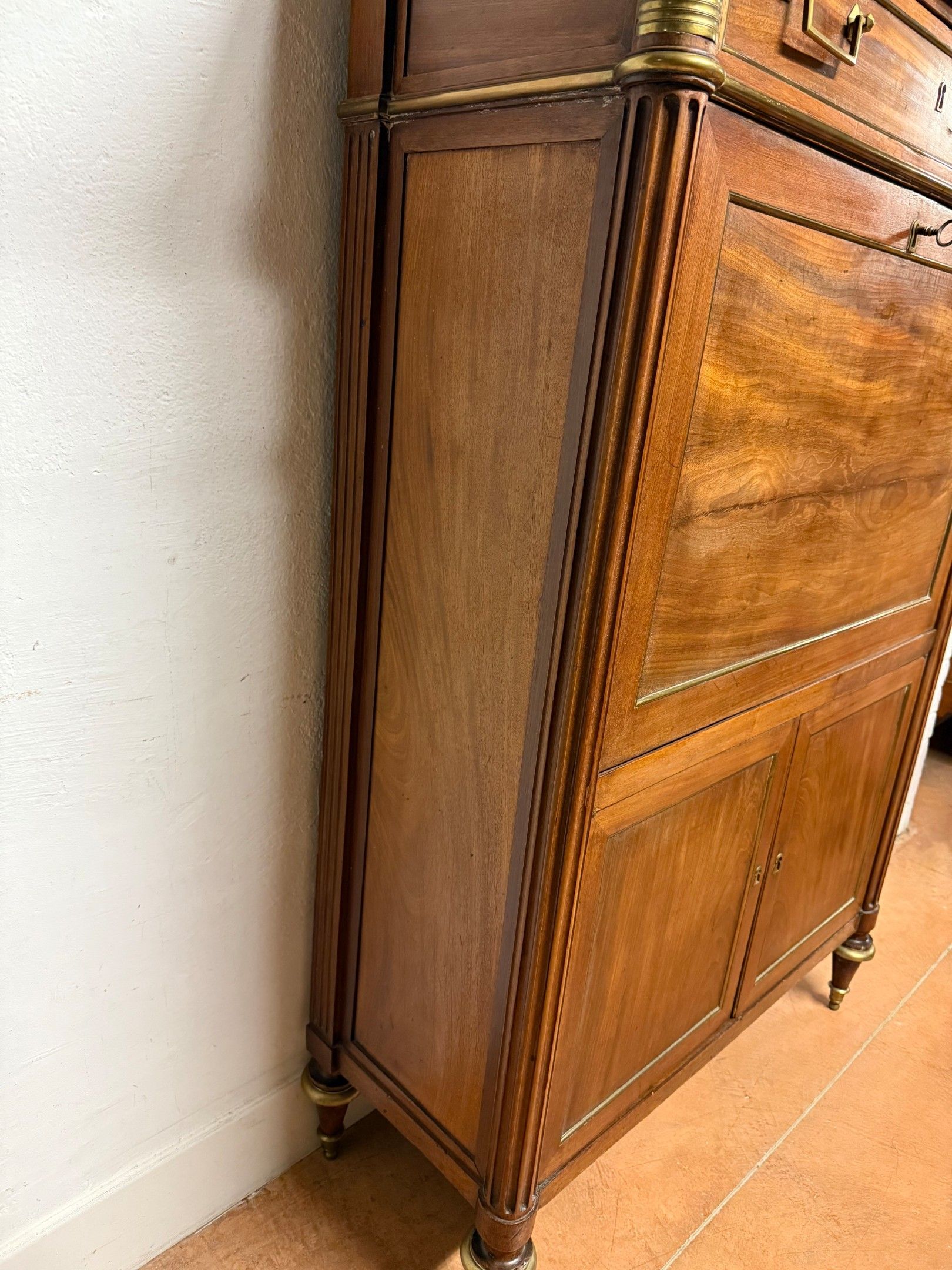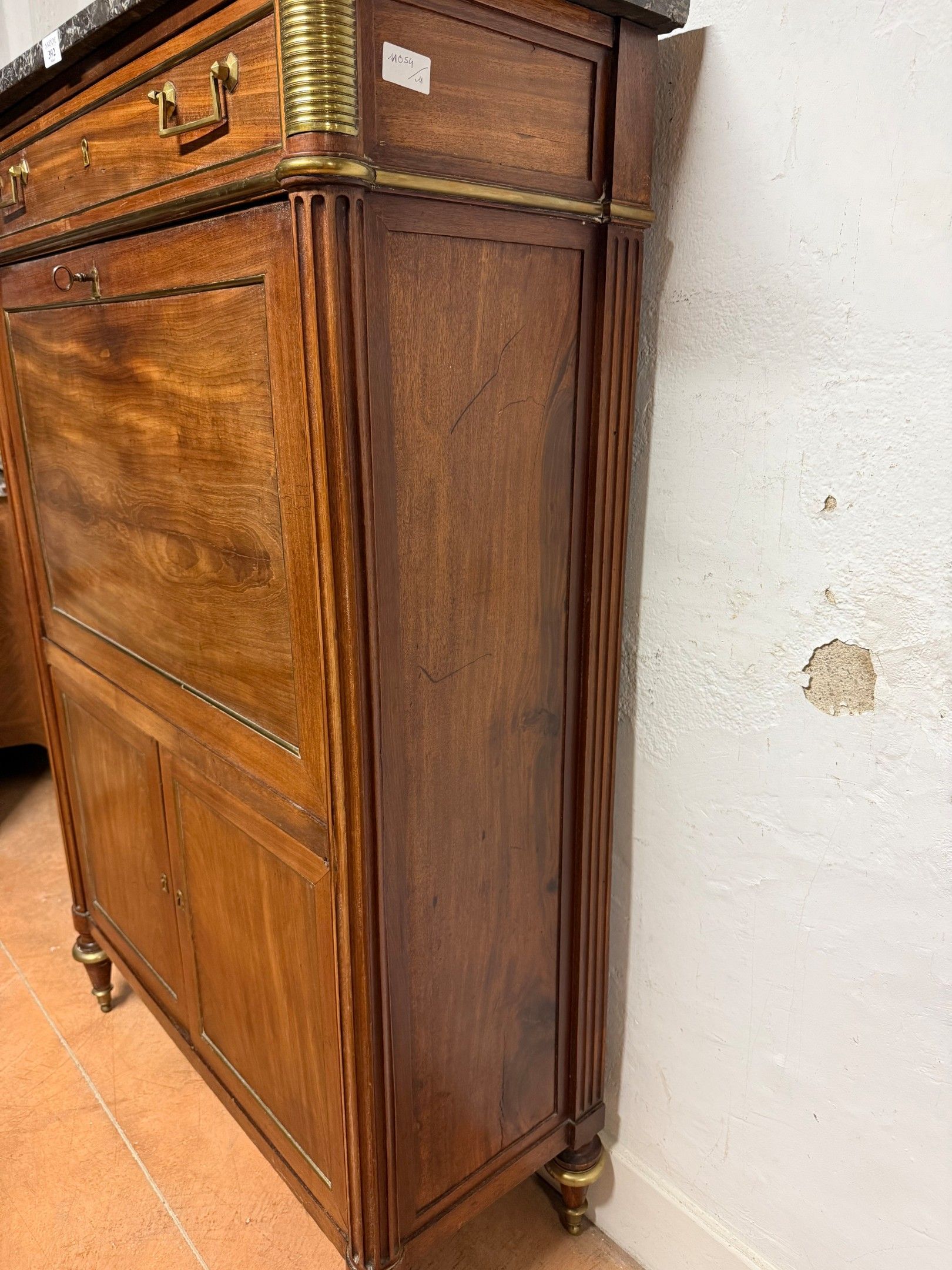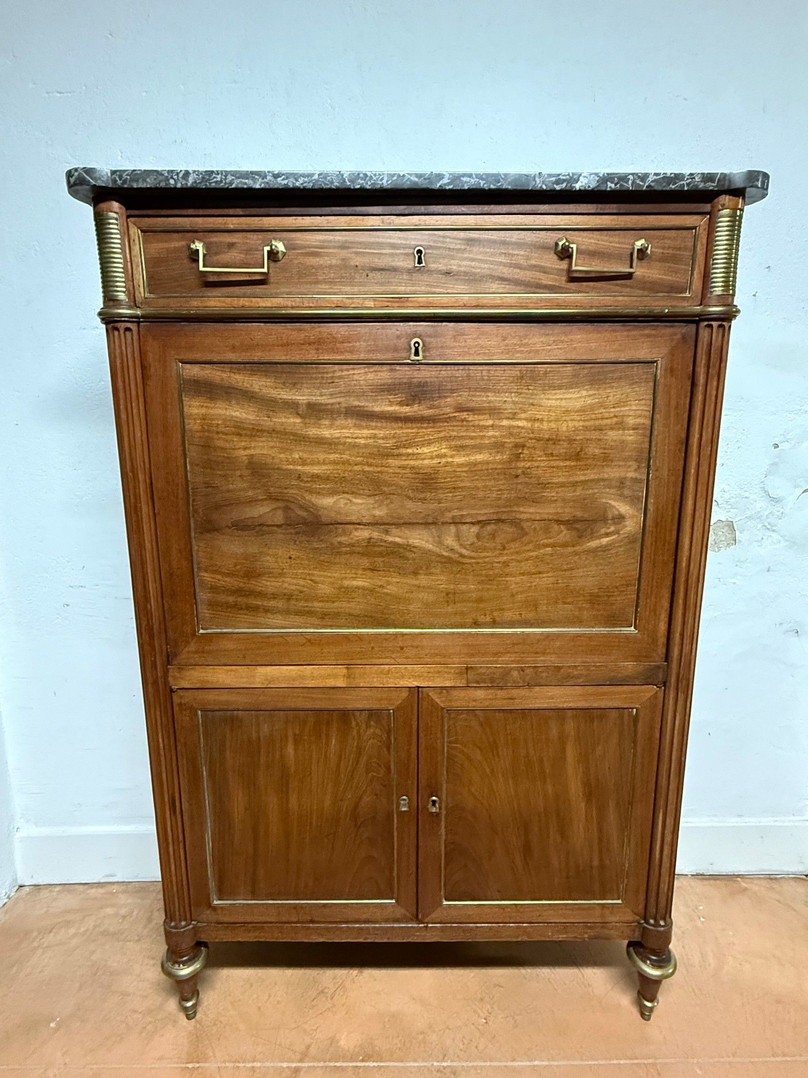 Wood veneer SECRETARY with flap. Opening with a flap revealing 8 drawers with 3 compartments. One drawer at the top. Two leaves at the bottom. Two engaged columns on the front. Brass trim. 19th century. H 144 x 94.5 x 40 cm. Grey marble. Slight wear.