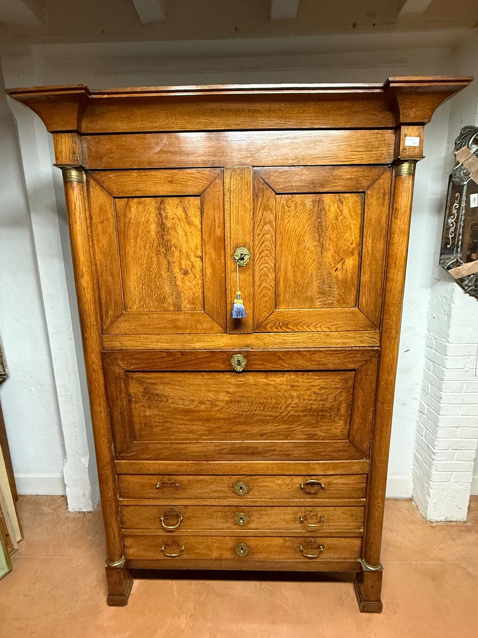 Oak scriban unit. It opens with two doors at the top, a flap in the centre revealing compartments and drawers, and three drawers at the bottom. Half-columned uprights. 200 x 13 x 53 cm.