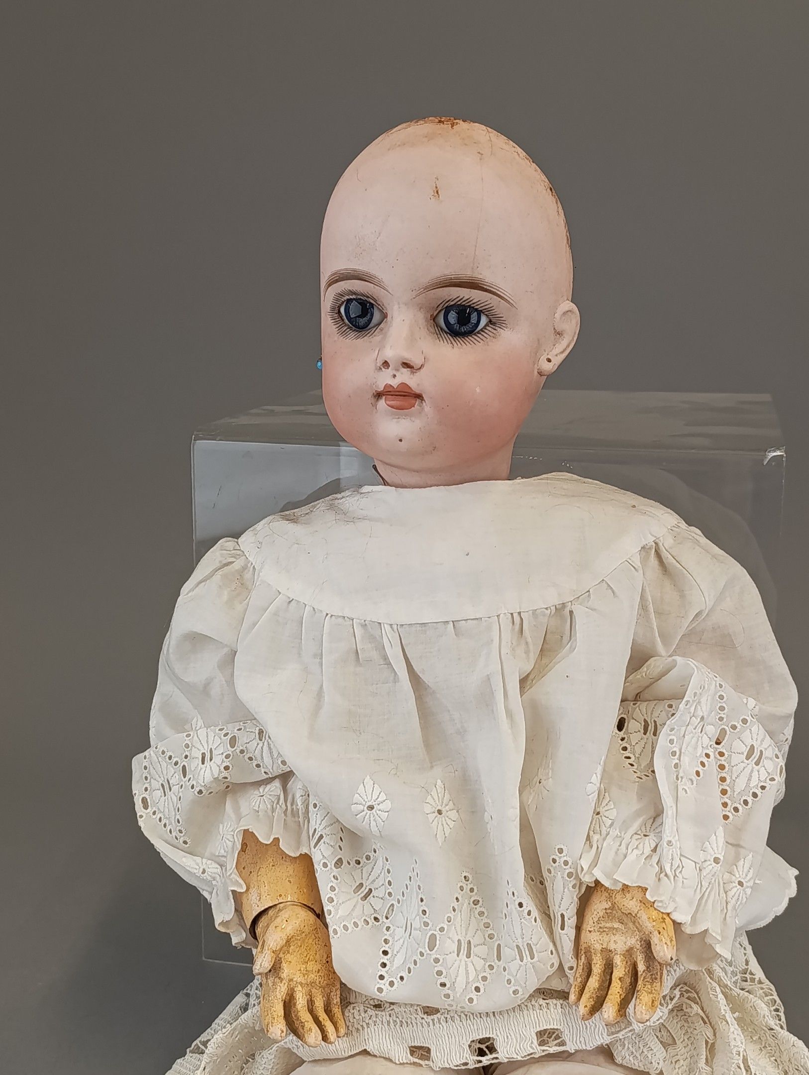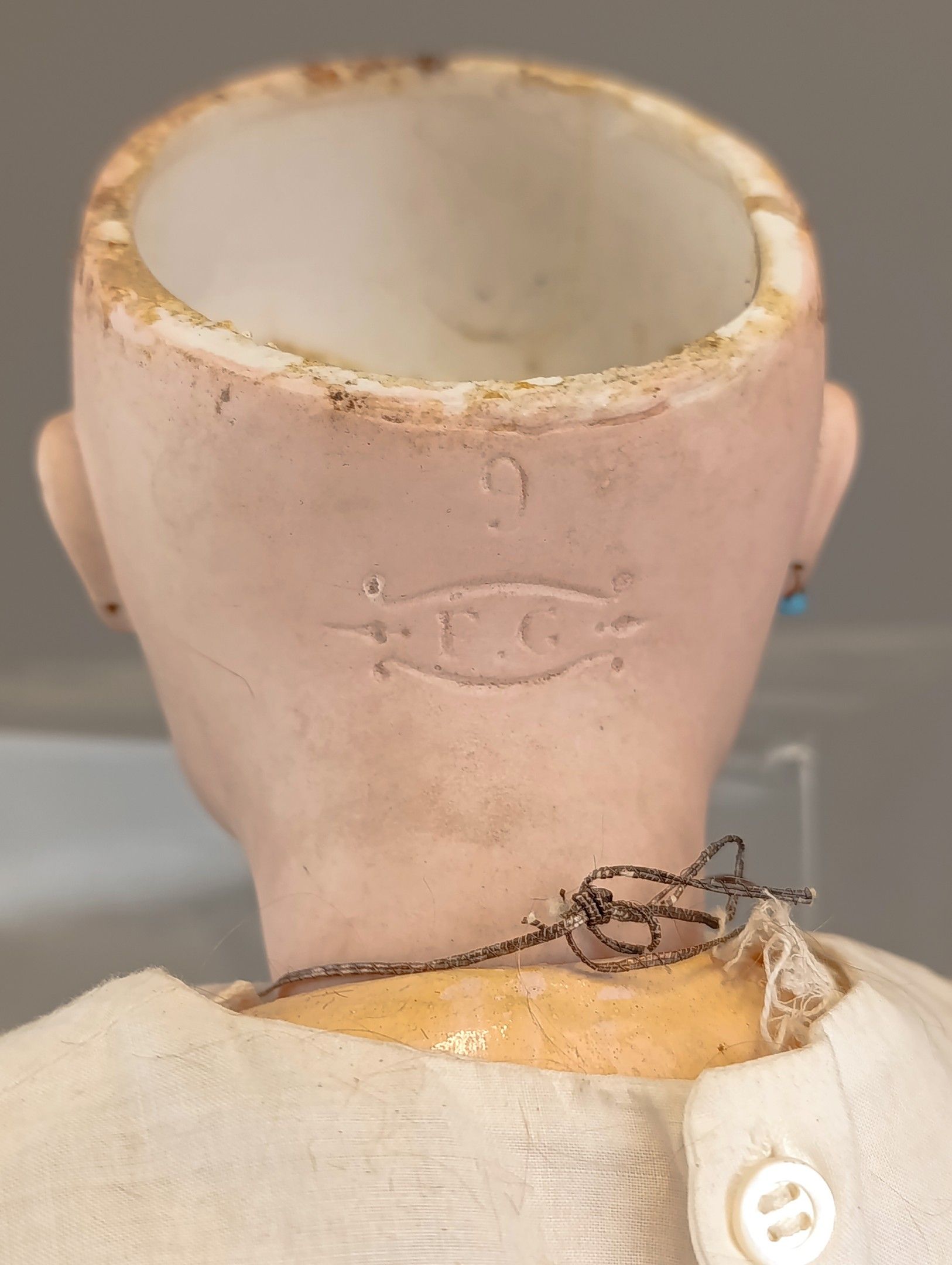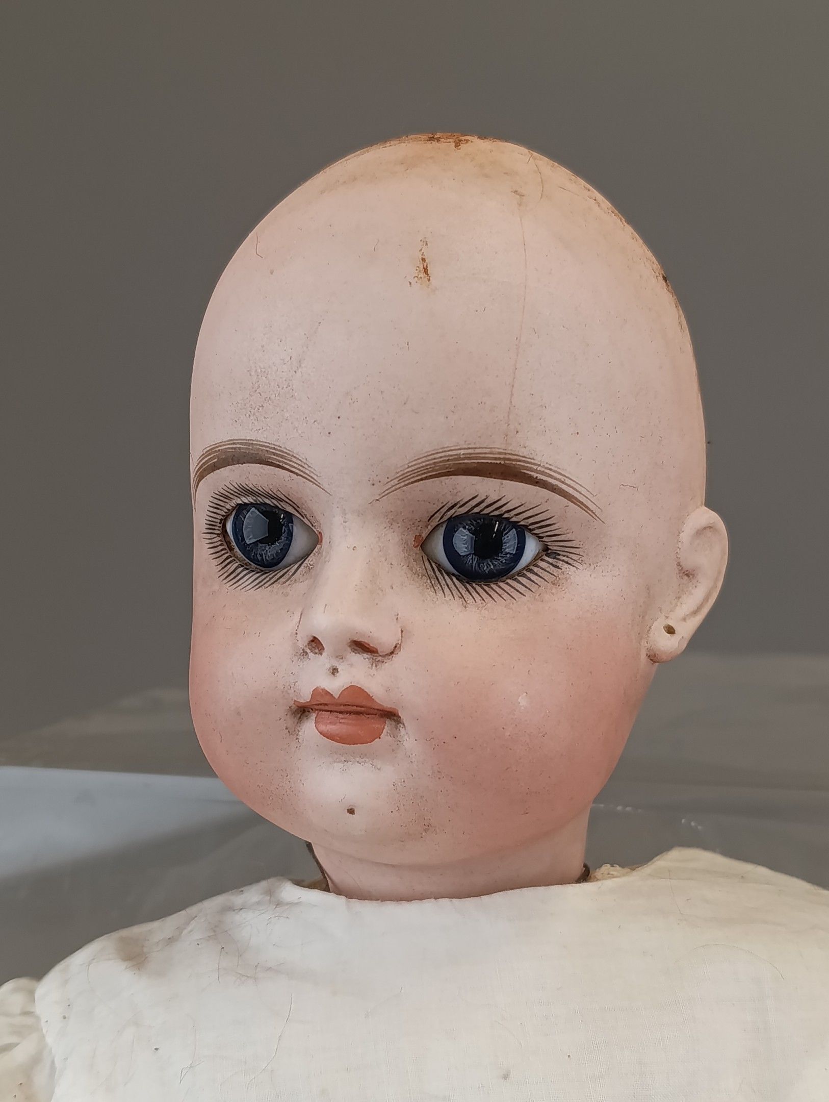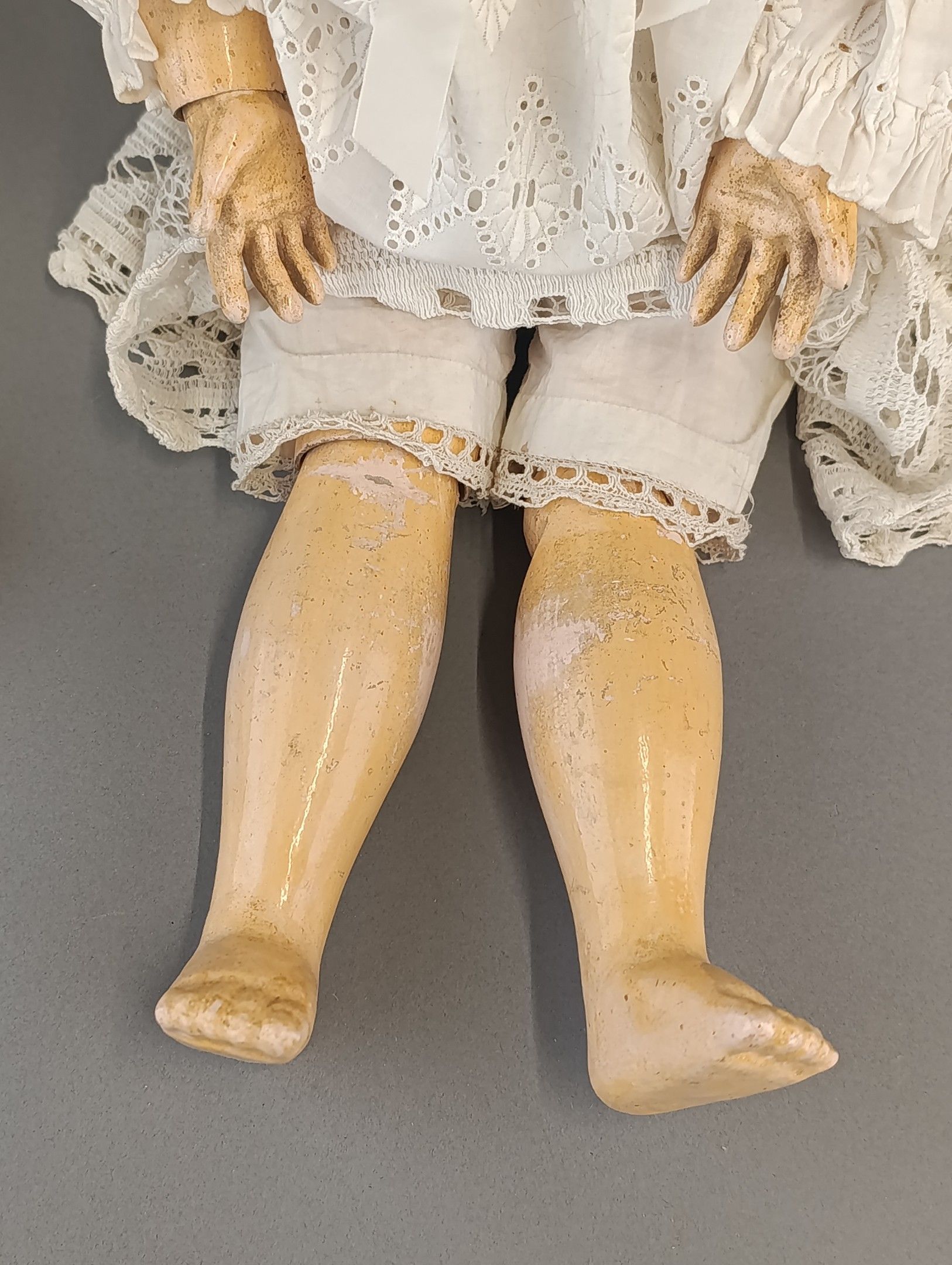 FRANCOIS GAULTIER (active between 1860-1895). Porcelain head doll, blue eyes, closed mouth, pierced ears, neck marked FG, size 9 on painted wooden body with ball joints. Dressed in old clothes and attached clothes. Height 60 cm. Large through crack from the forehead to the right eye, paint wear, wear and tear on the surface of the eyes.
