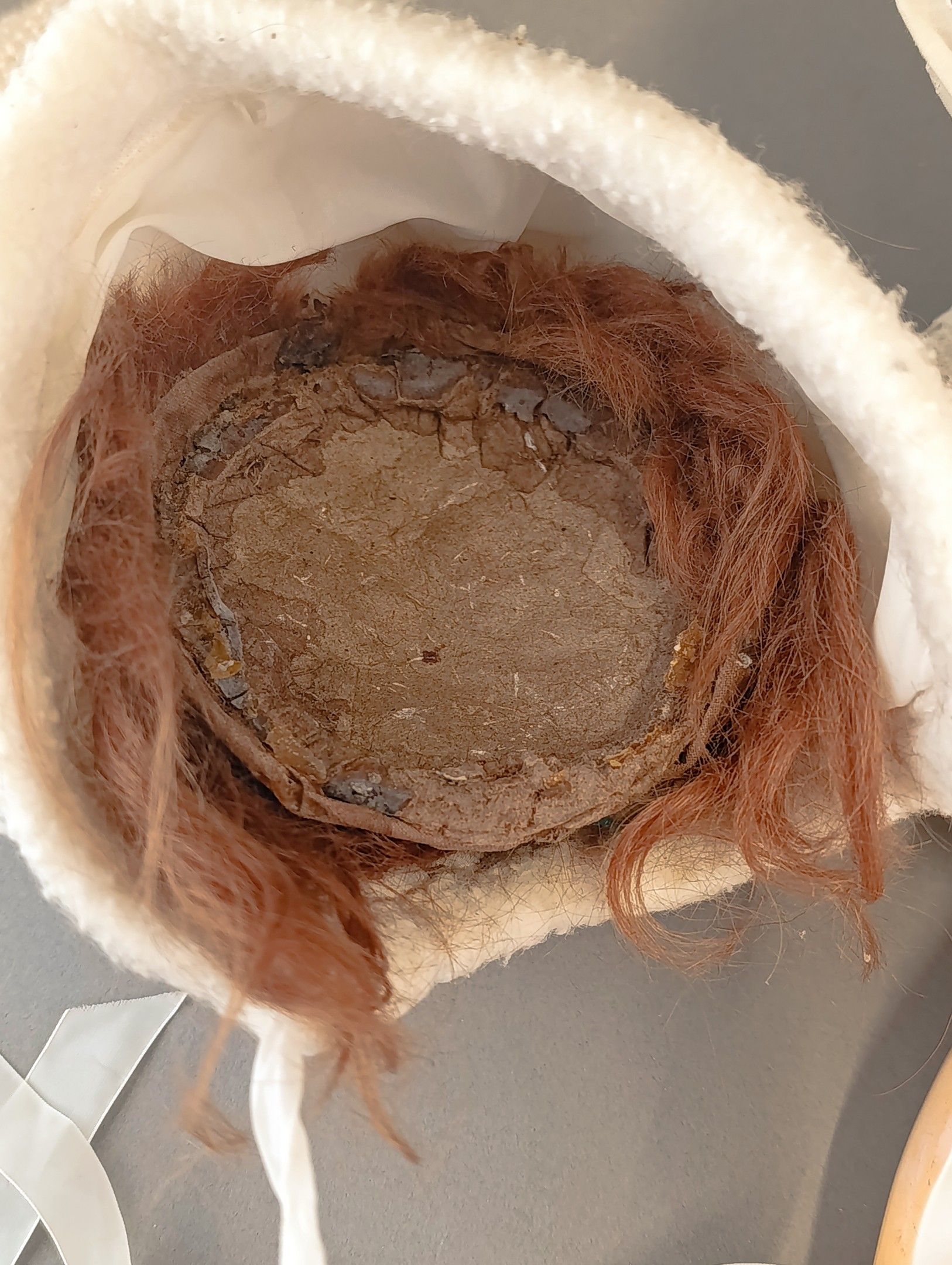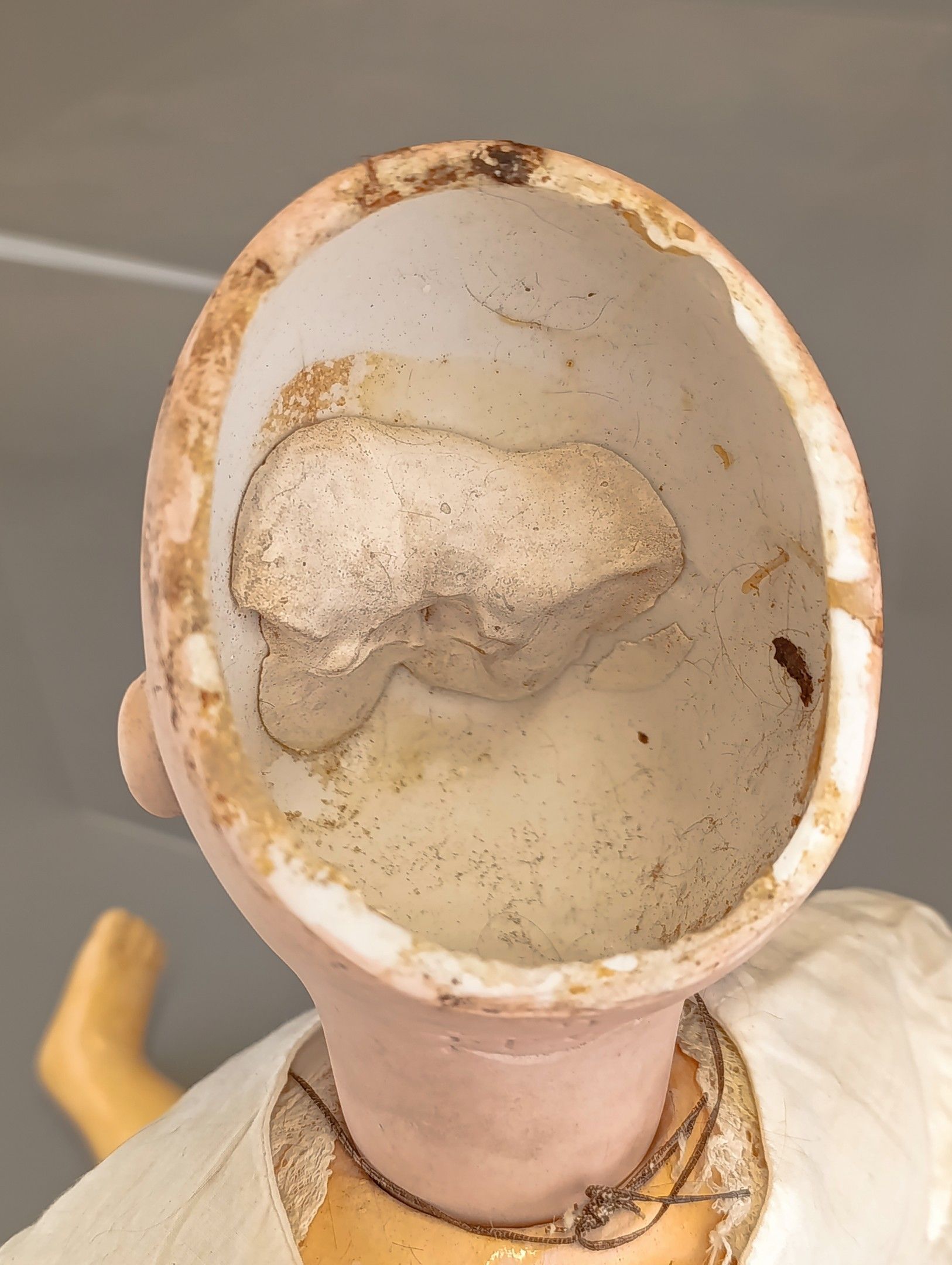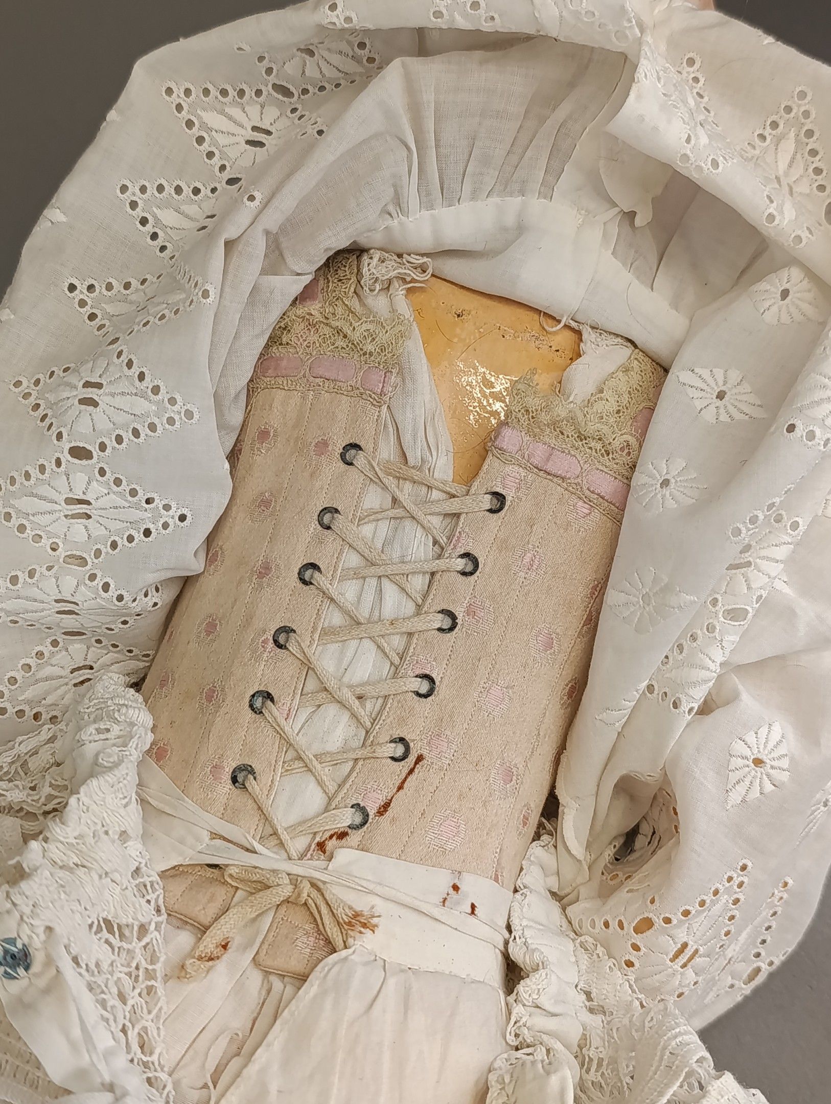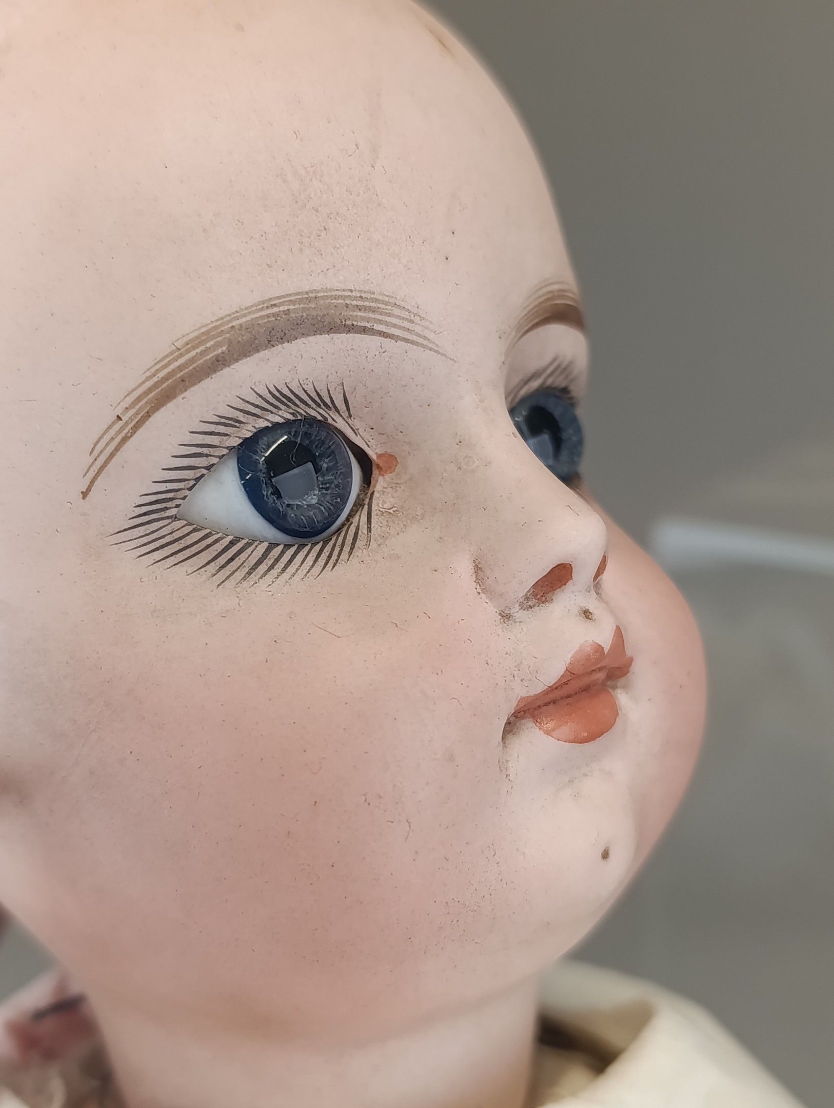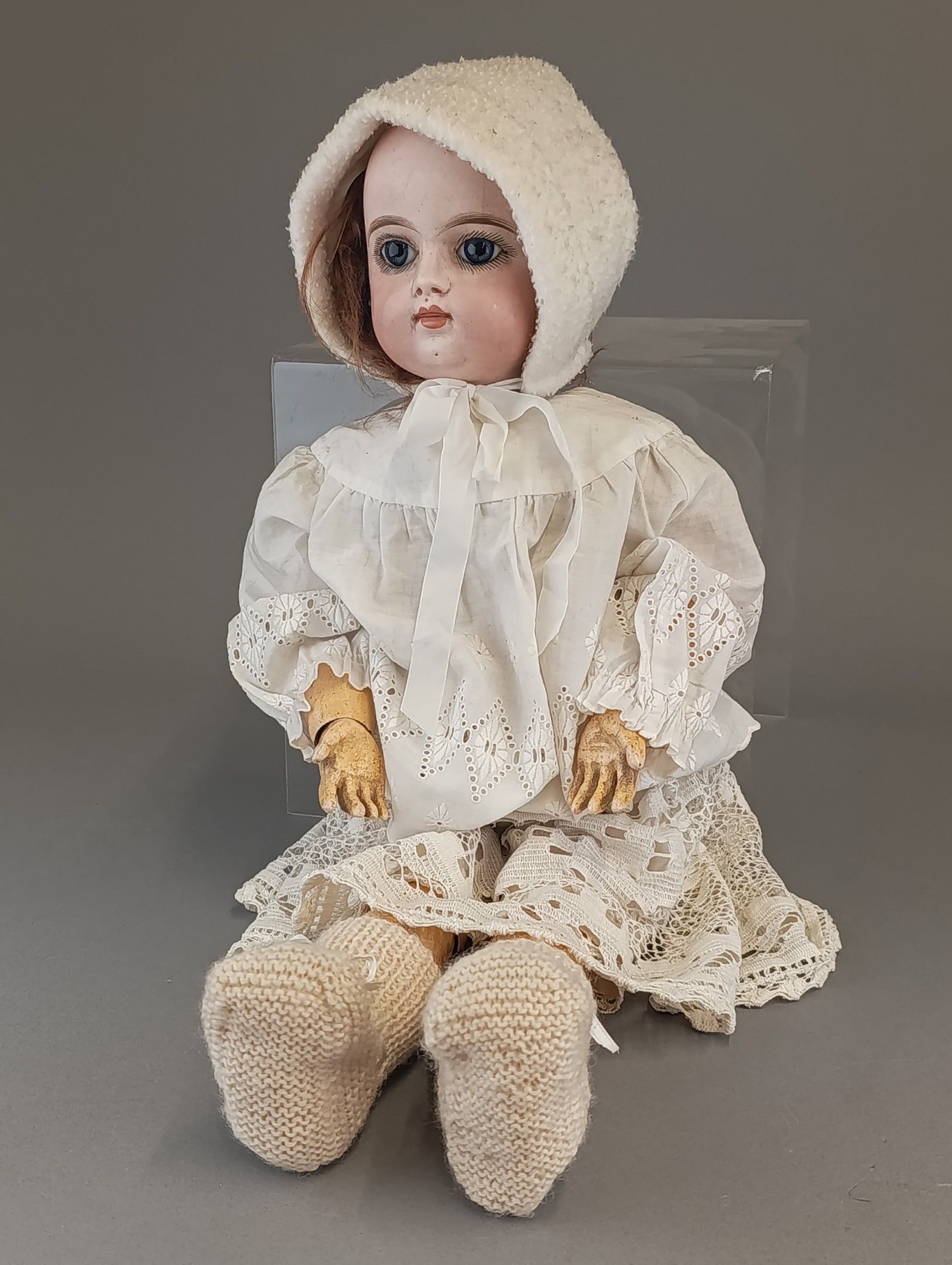 FRANCOIS GAULTIER (active between 1860-1895). Porcelain head doll, blue eyes, closed mouth, pierced ears, neck marked FG, size 9 on painted wooden body with ball joints. Dressed in old clothes and attached clothes. Height 60 cm. Large through crack from the forehead to the right eye, paint wear, wear and tear on the surface of the eyes.