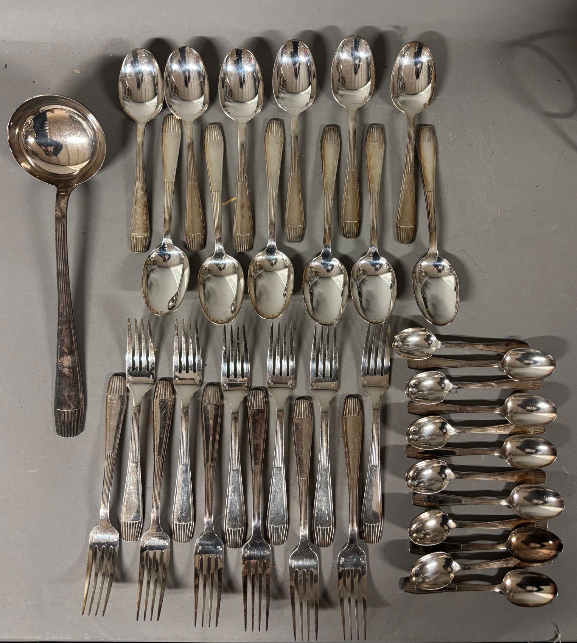 CHRISTOFLE. Set of cutlery including : Ladle 32.5 cm - 12 forks L 20.5 cm - 12 large spoons L 20.5 cm - 12 small spoons. Worn, unsilvered.