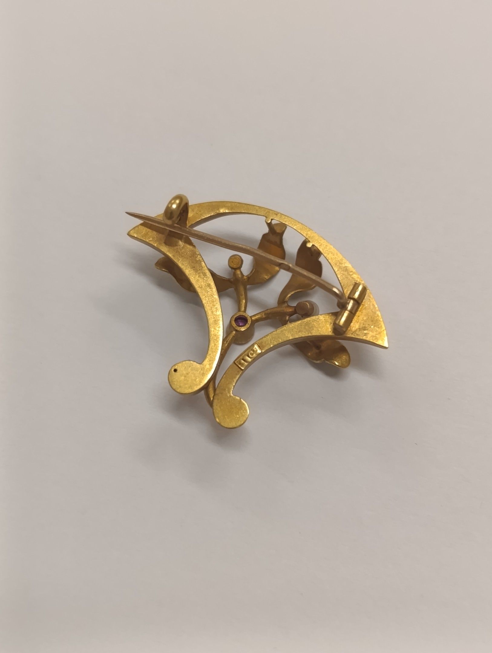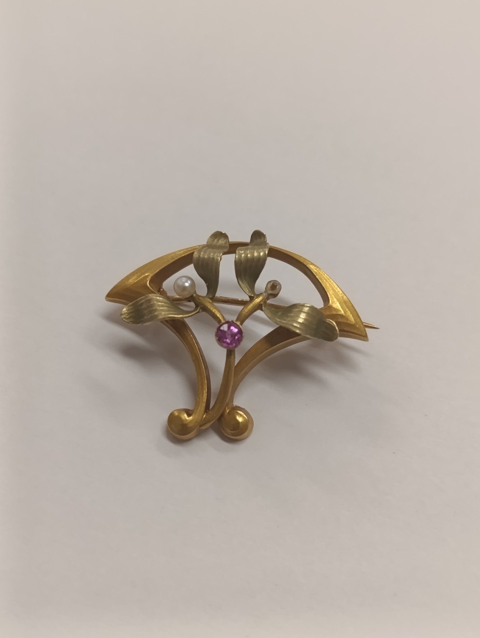 NEW ART BROCHURE in yellow and green gold 750 thousandths with a mistletoe branch set with a pink sapphire and a pearl. Foreign 18 ct hallmark and weevil hallmark. 3.77 g. D. 6 x 4 cm. One pearl missing.