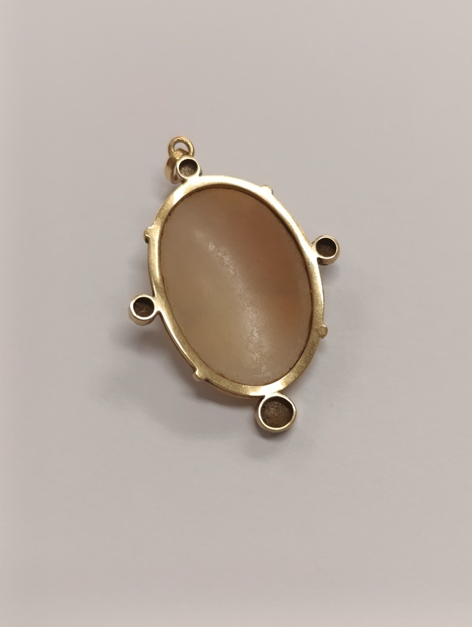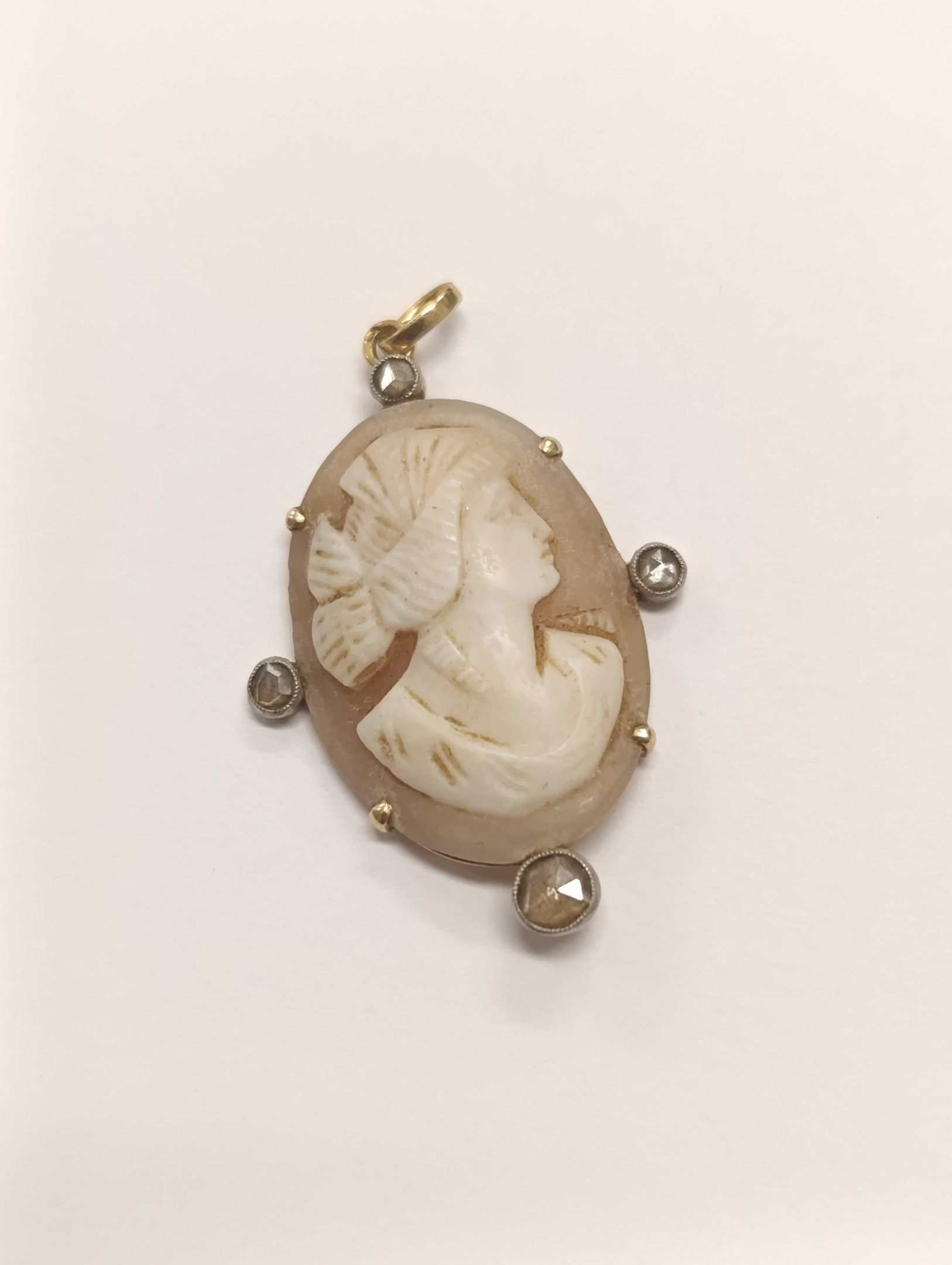 Cameo pendant with female profile in 750 thousandths yellow gold set with four rose-cut diamonds. Marked with an eagle's head. Height 3.5 cm. Gross weight. 3.37 g.