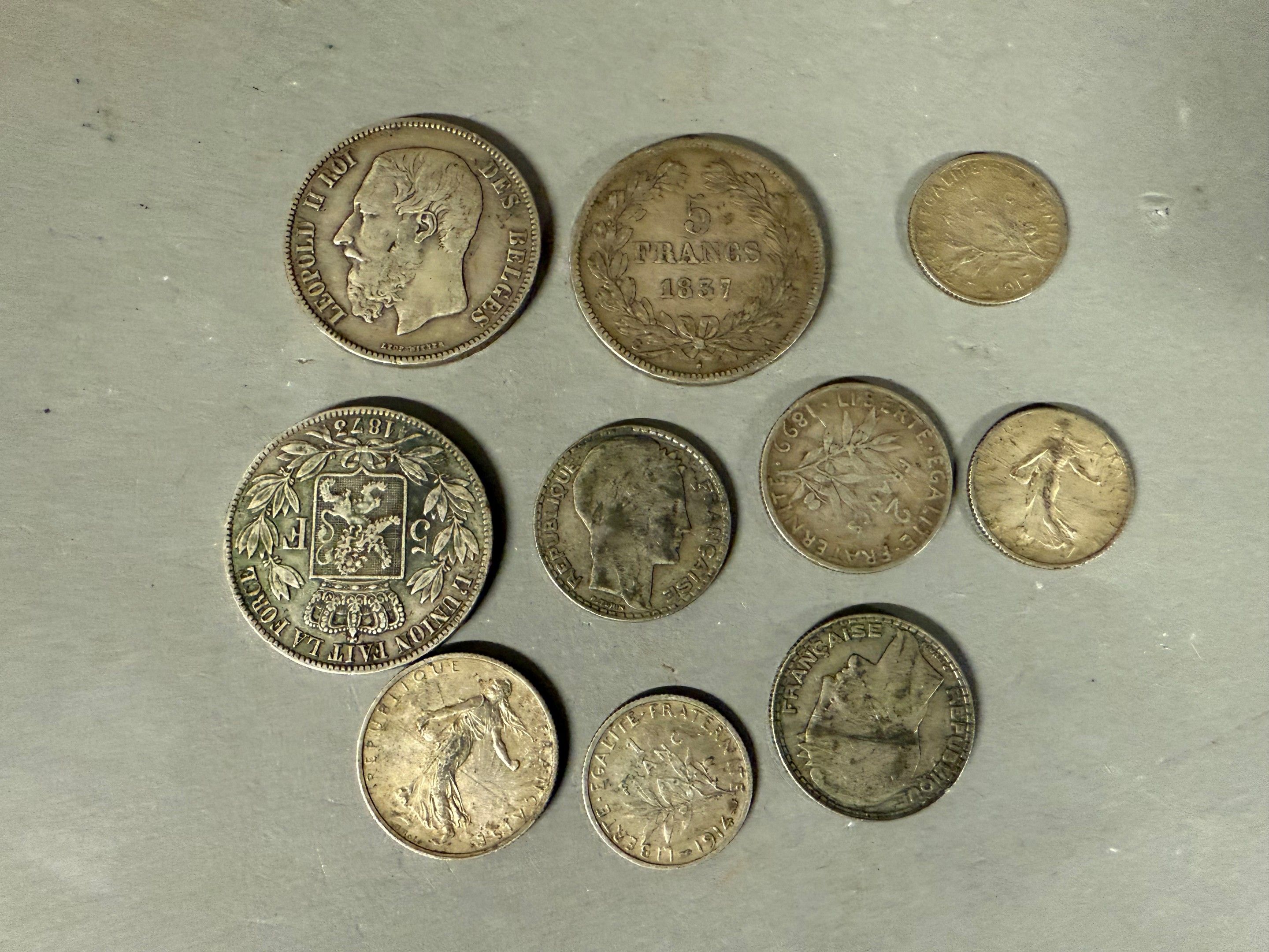 SILVER, including: 5 francs Belge, Léopold II roi des Belges 1871, weight 24 grammes - 5 francs Belge, Léopold II roi des Belges, 1873, weight : 25 grammes - 5 francs Louis Philippe, 1857, weight : 25 grammes - 10 francs, 1933, weight : 9 grams - 10 francs, 1932, weight: 10 grams - 2 francs, semeuse, 1899, weight: 10 grams - 2 francs semeuse, 1917, weight: 10 grams - 1 franc semeuse 1917, weight: 5 g - 1 franc semeuse, 1916, weight: 5 grams- 1 franc semeuse, 1914, weight 5 grams.