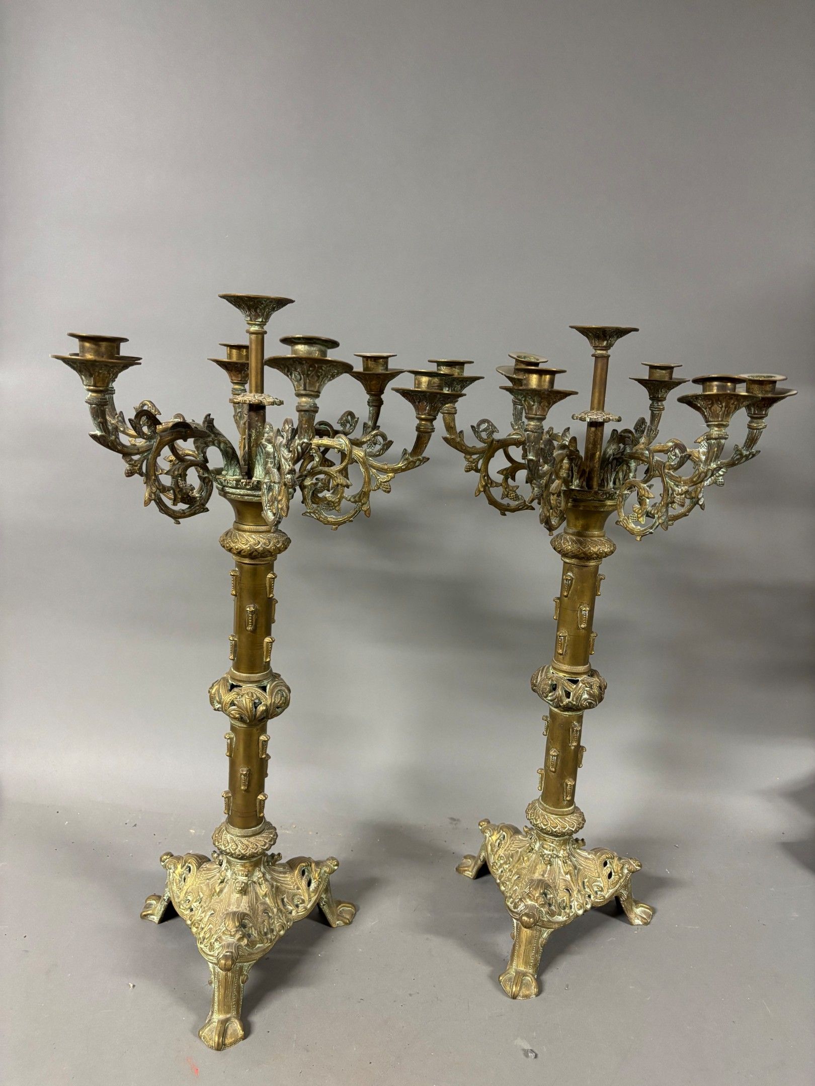Pair of 7-light brass candelabra on three feet. Height 64 cm. Wear and tear.