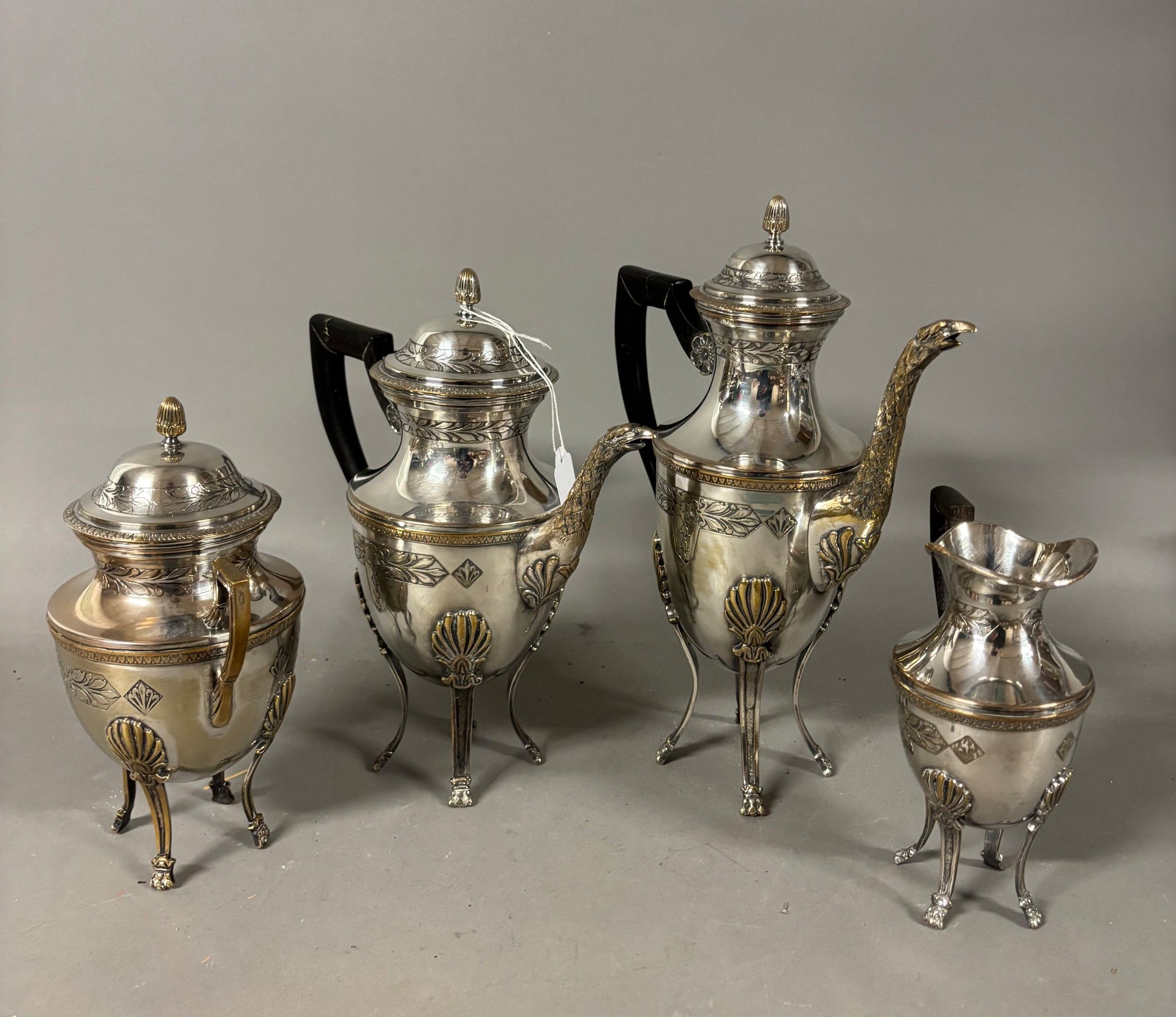 SILVER METAL. Coffee pot, tea pot, milk pot and sugar pot. Wear and tear. EMpire style.