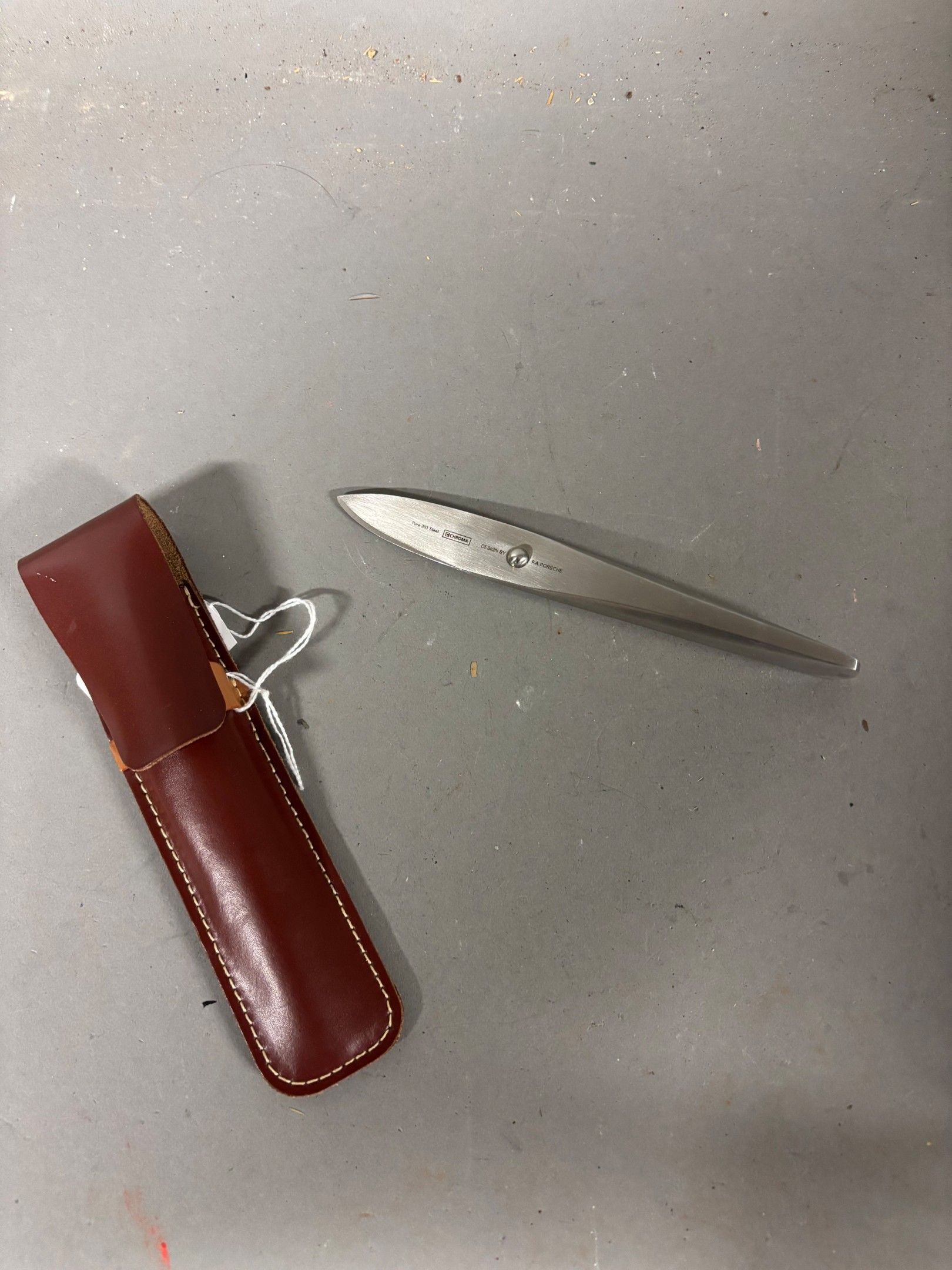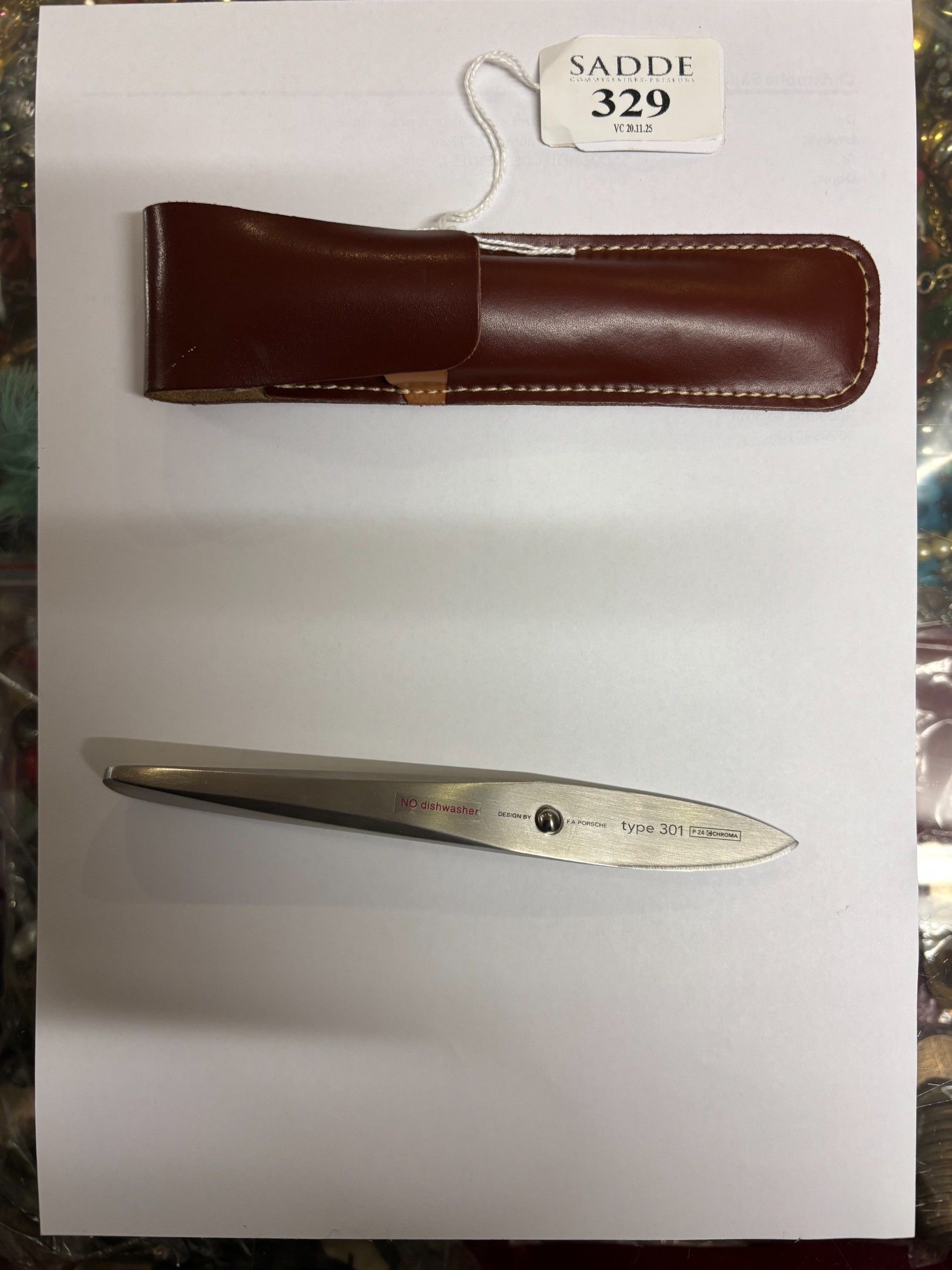 DESIGN BY F.A PORSCHE. Type 301 Japanese knife - P24 Chroma. L. 16 cm. A stitched leather case is included. Blade slightly bent.