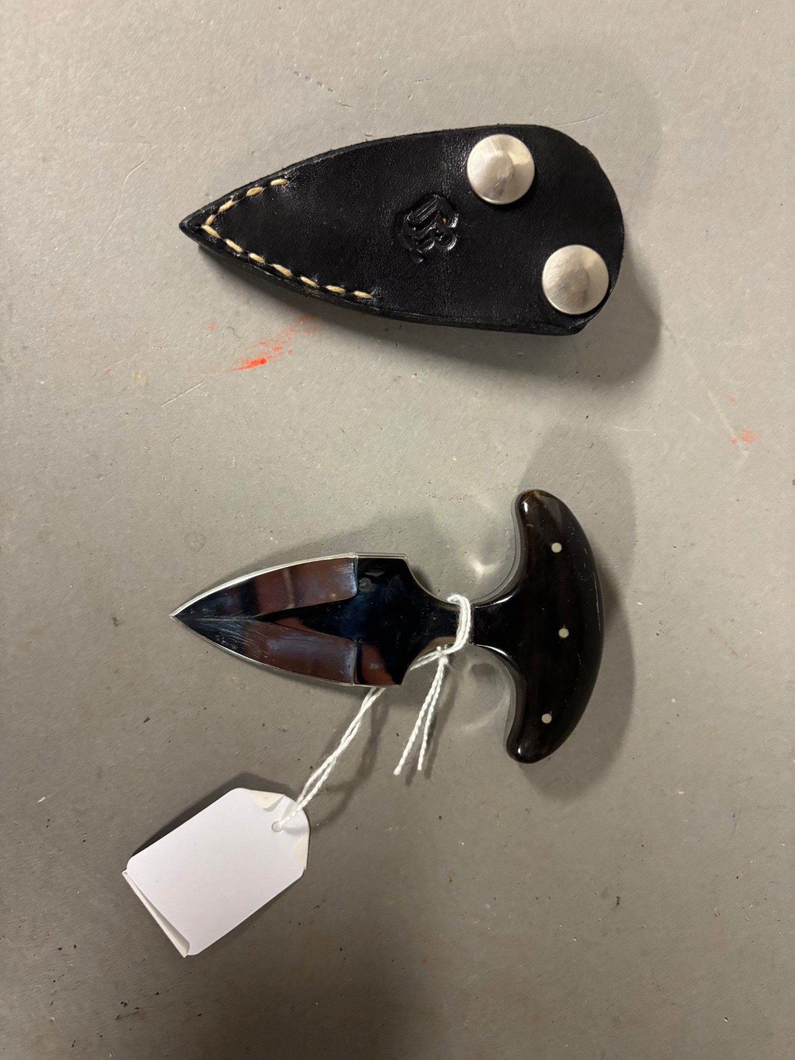 FINGER DAGGER or "push dagger", horn handle, blade signed MAISON DES COUTELIERS. Total length 10 cm, two-tone RB leather sheath.
