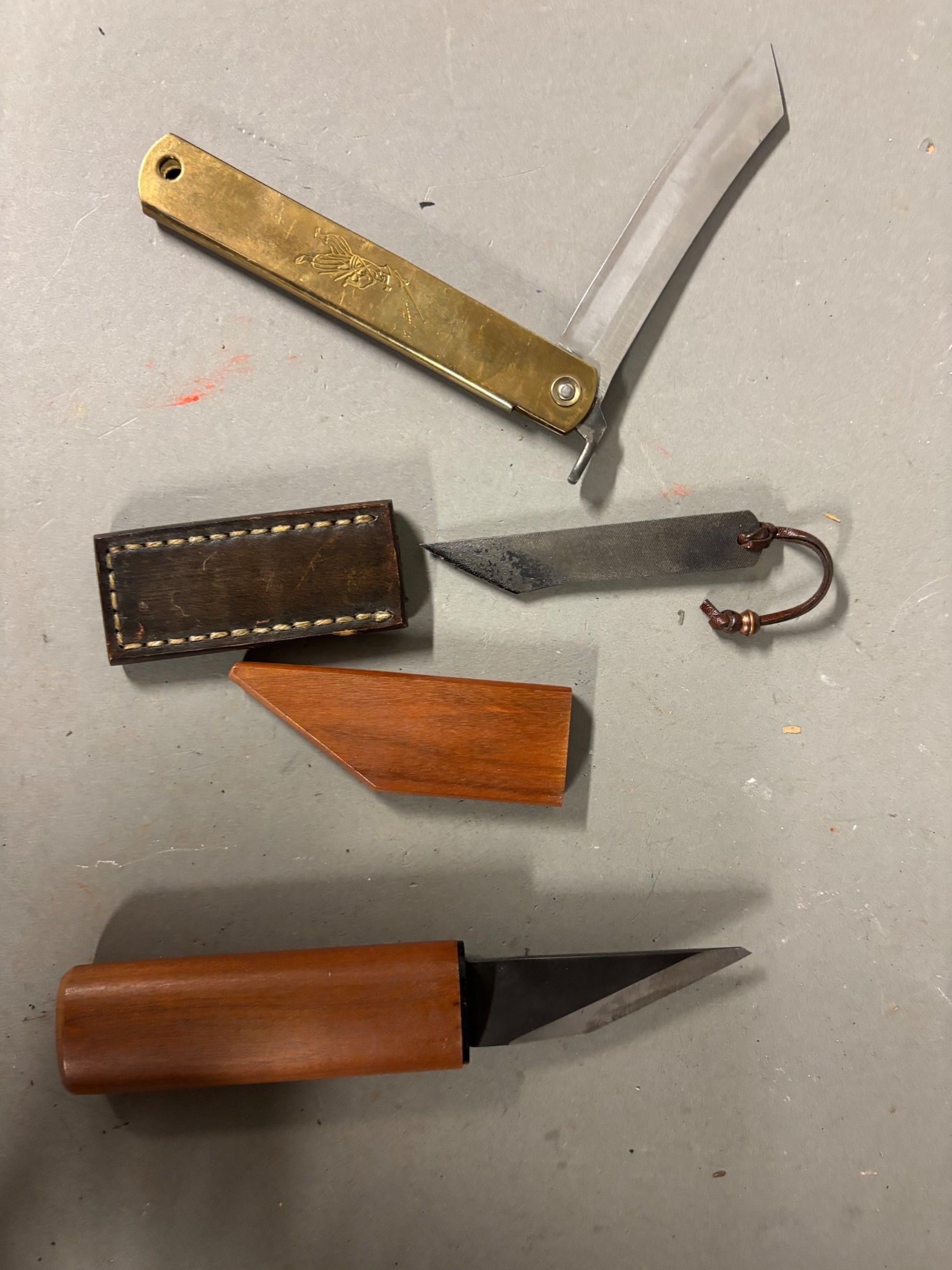 LOT OF THREE KNIVES: JAPANESE KNIFE known as Kridashi and "Higonokami", inscribed in Japanese script L. 8.5 cm to 18 cm.