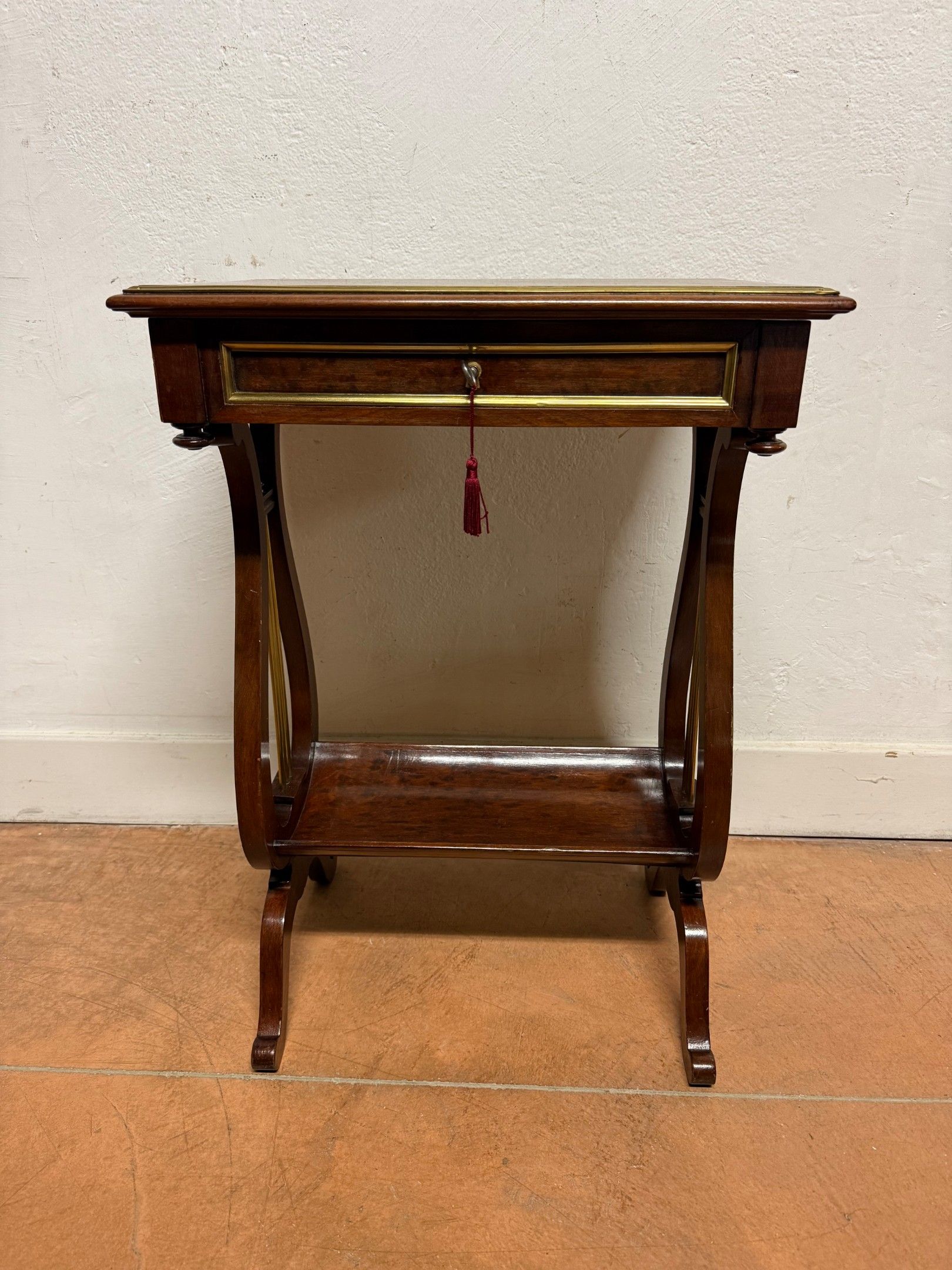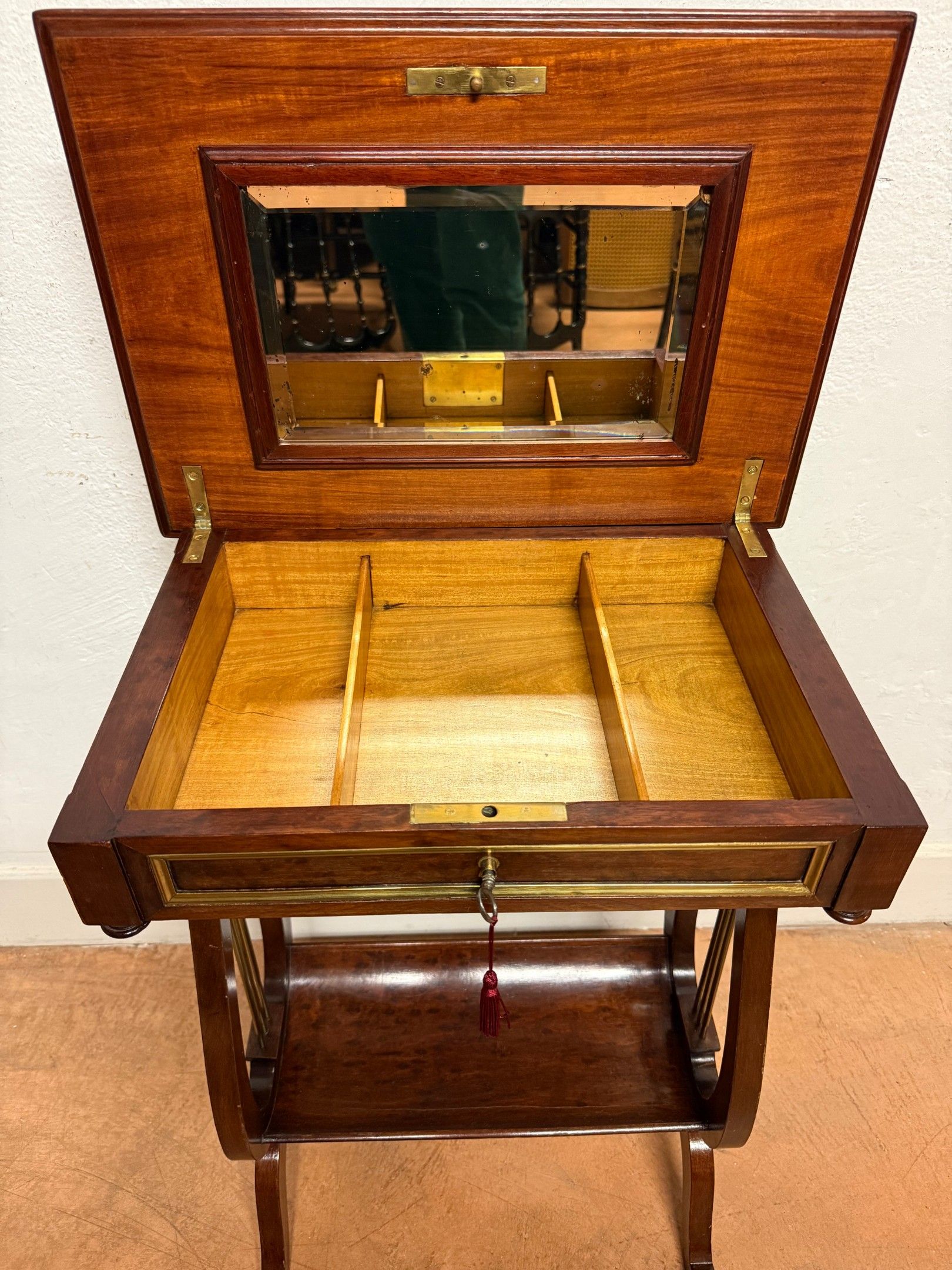 Wood veneer TRAVAILLEUSE, opening with a flap with a mirror and compartments. Lyre base and curved crotch shelf. H 71 cm 50 x 35 cm. good condition.