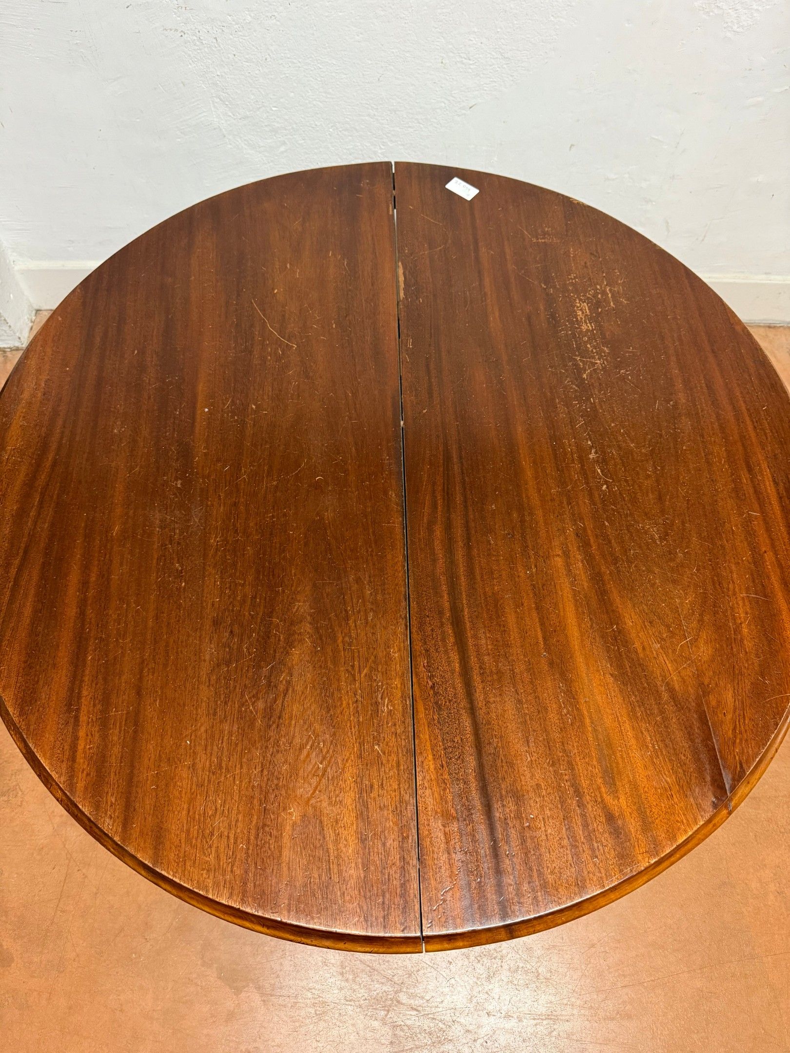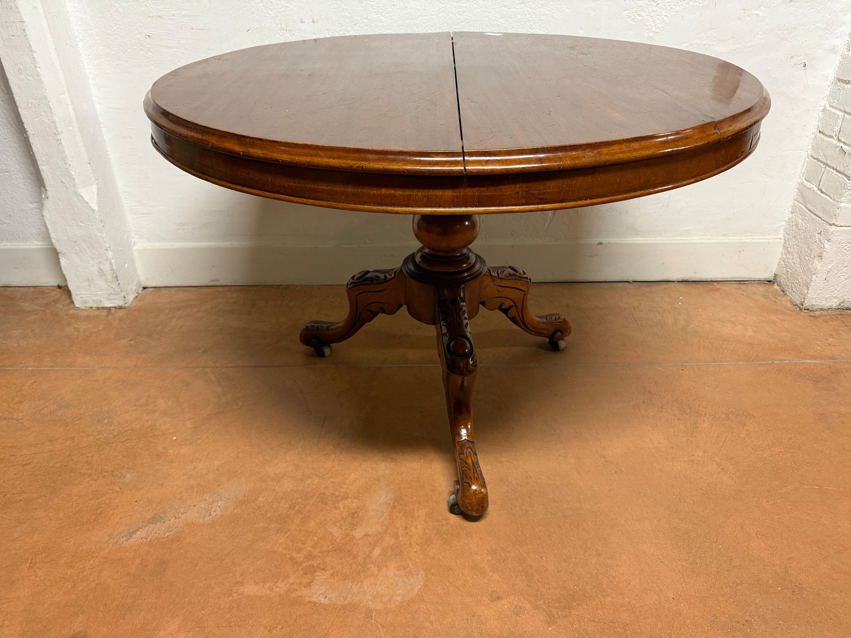 GUERIDON TABLE in wood veneer on a tripod base. Victorian period. Restorations. h. 72 cm. D. 101 cm