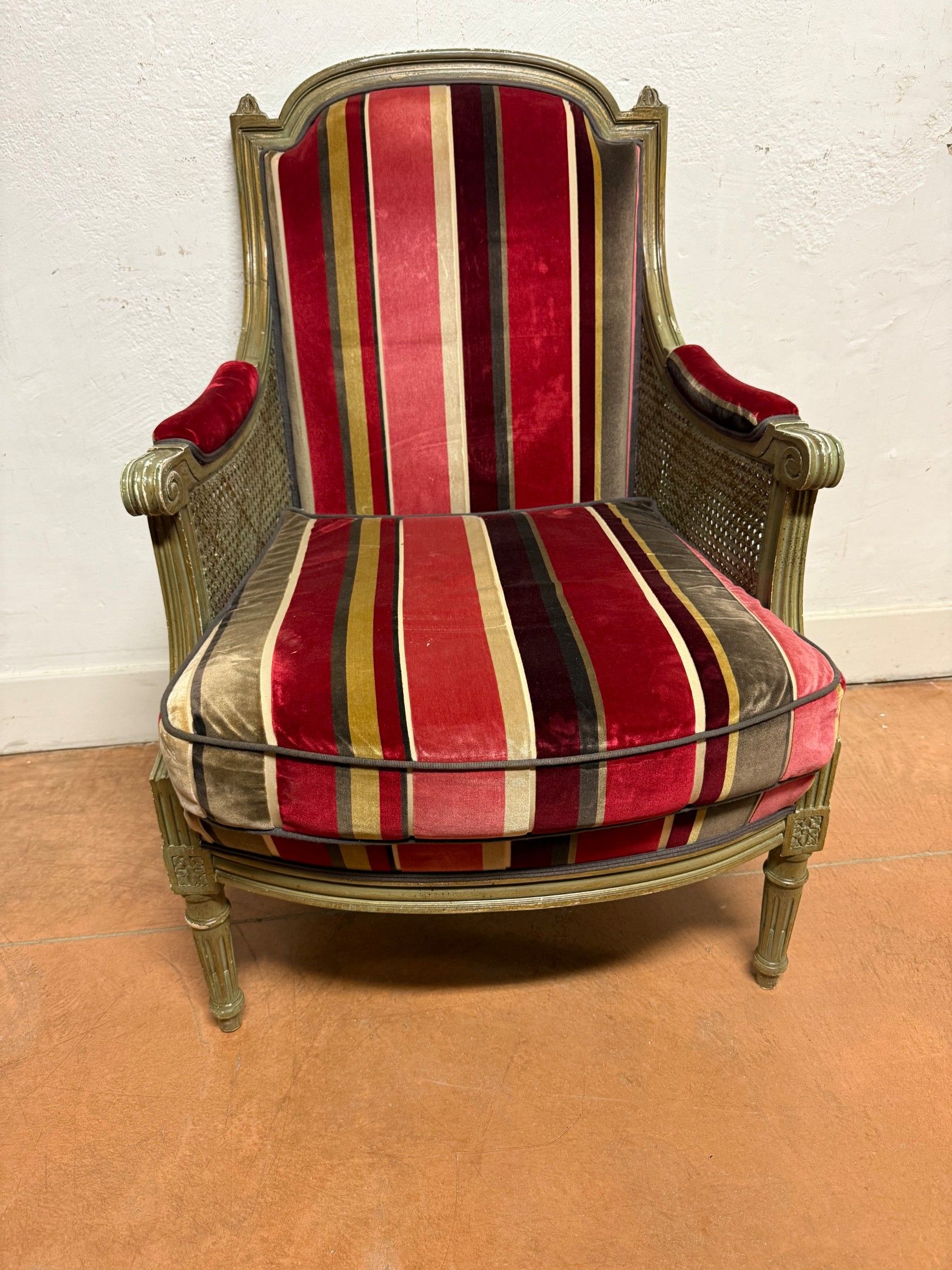 Shepherd's chair in grey lacquered wood. Caned cheeks.