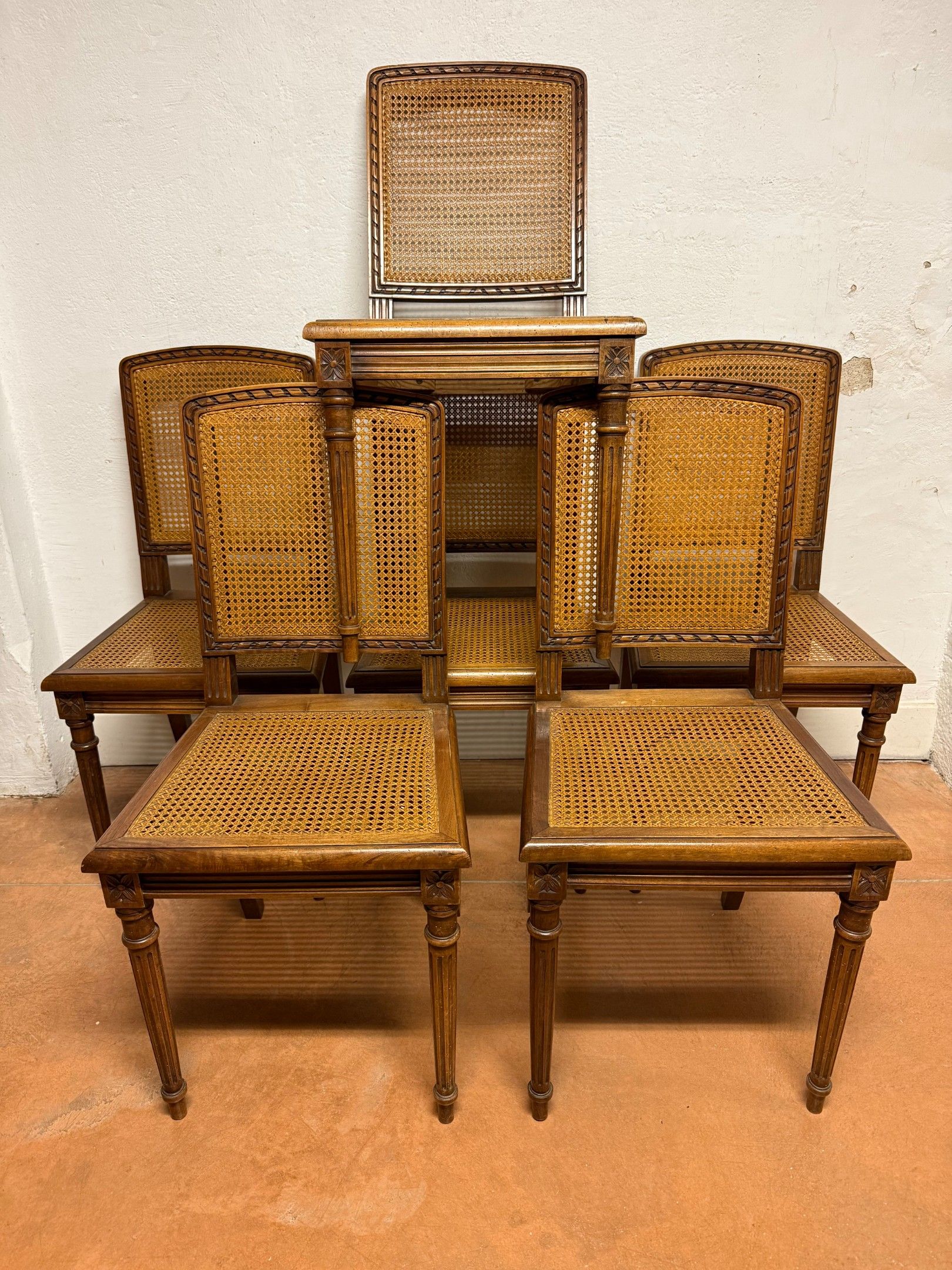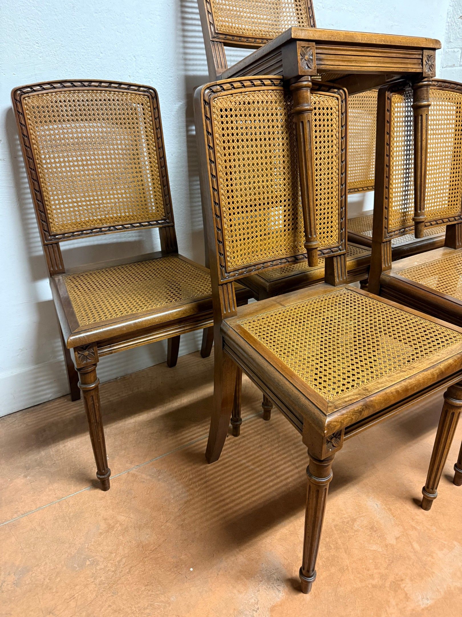 SERIES of 5 moulded and carved wooden chairs. Wicker seat and back. Louis XVI style, 20th century. Height 91 cm. One damaged-restored chair.