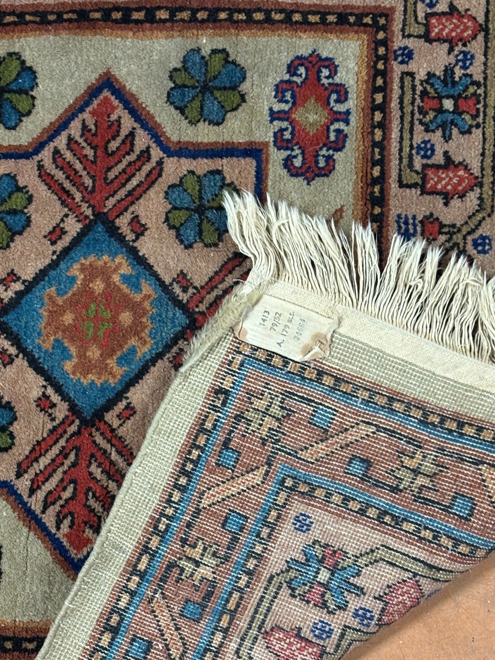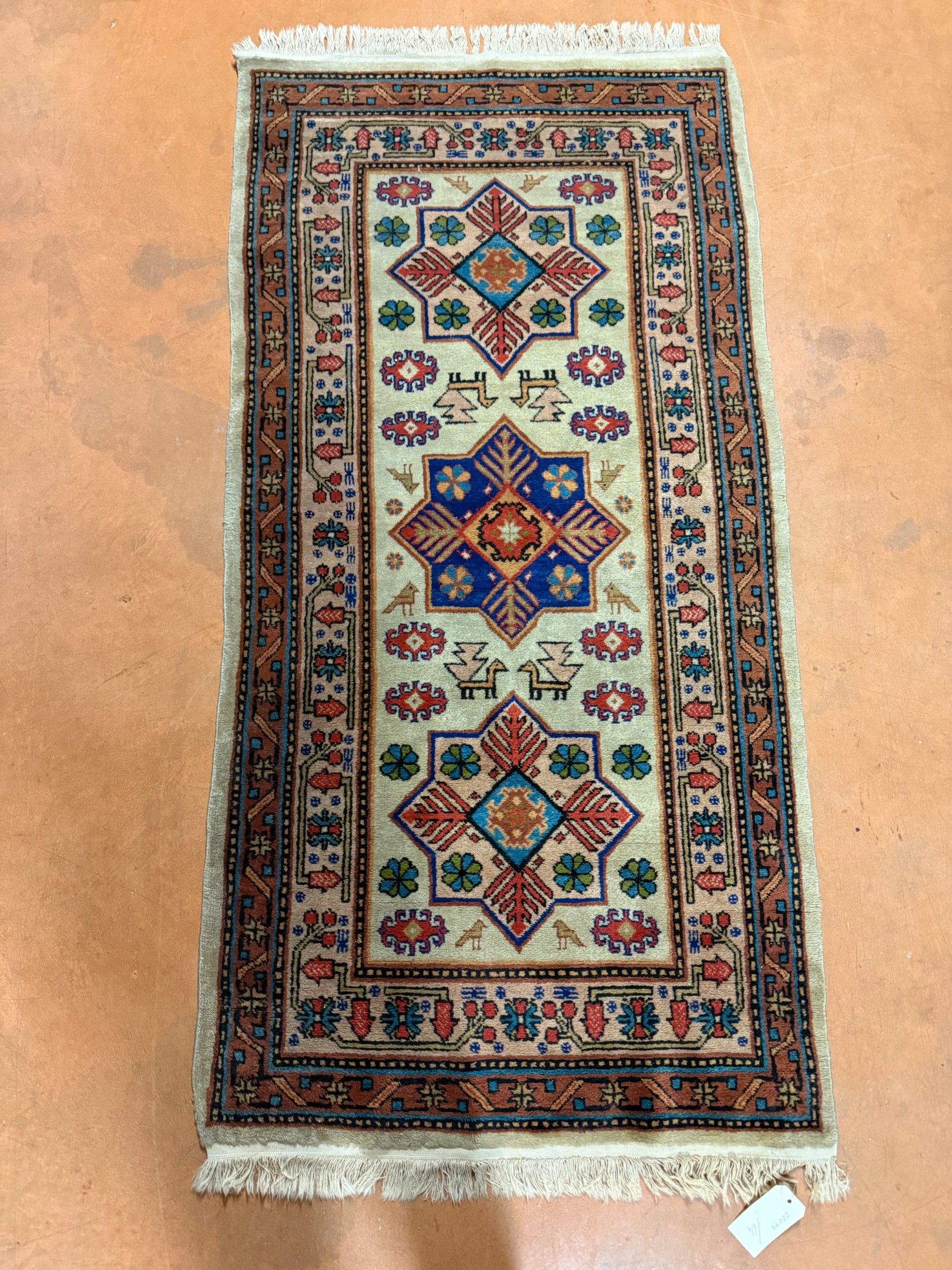 SAMARKAND. Carpet decorated with three starry medallions and birds. 178 x 88 cm. Label: entirely handmade.