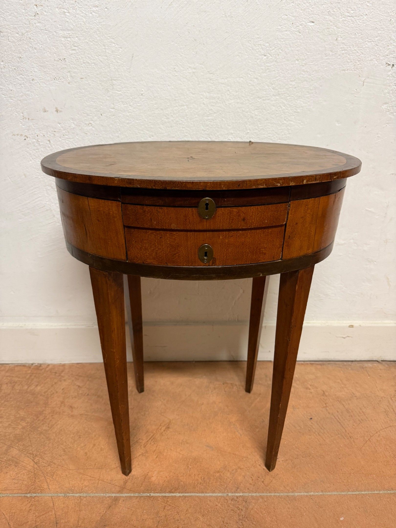 Veneered tambour table opening with two drawers. Wear and tear to the veneer. 68 x 55 x 41 cm.