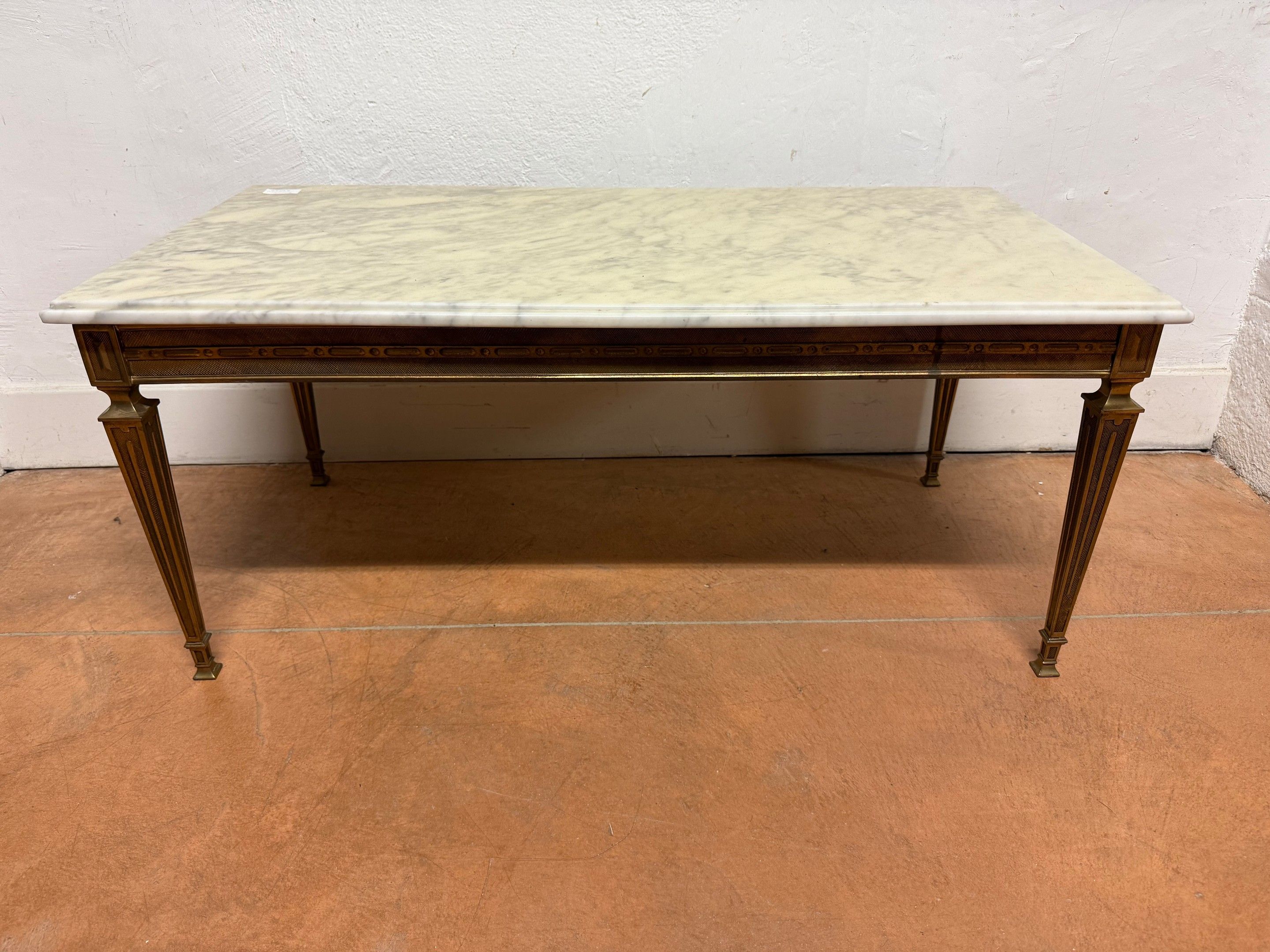 A bronze LOW TABLE with a white marble top. Louis XVI style. 44 x 99 x 50 cm