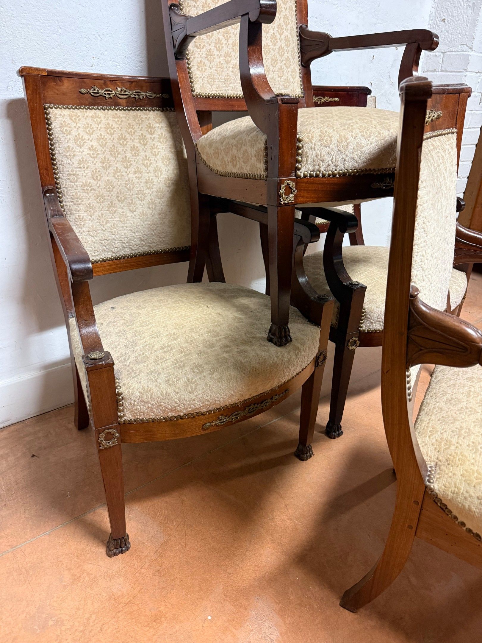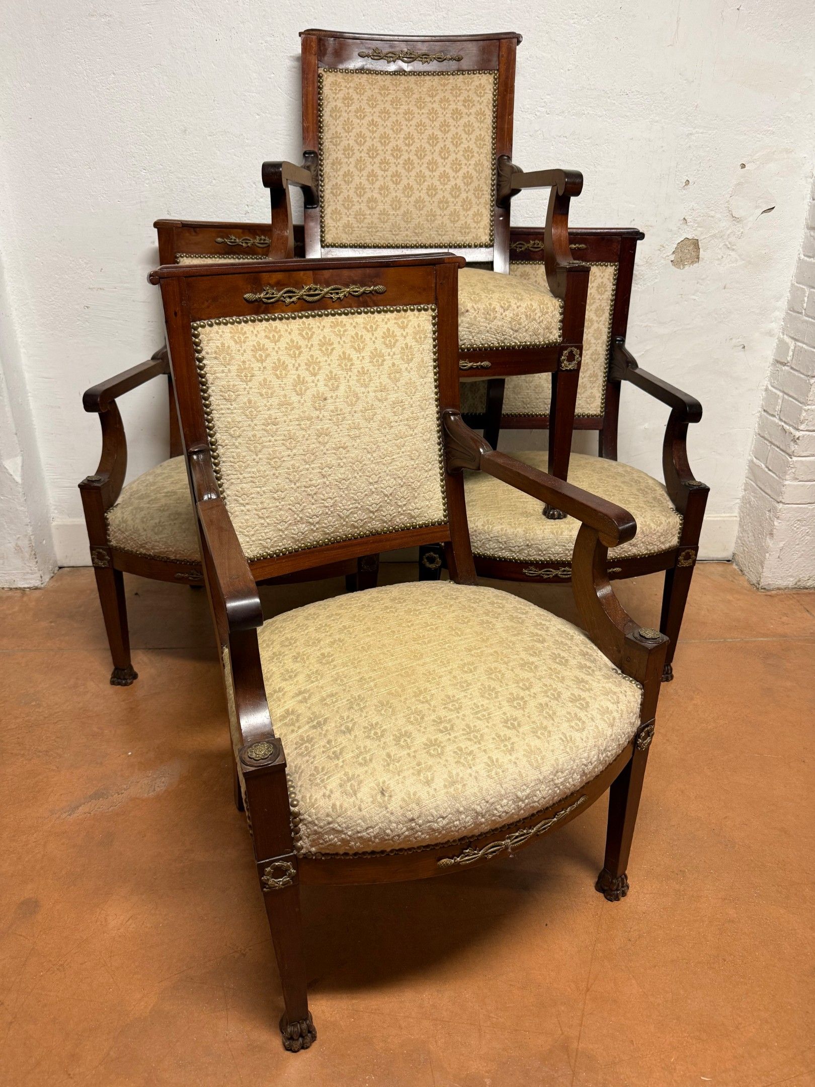 FOUR wooden armchairs with cream velvet upholstery, sheath legs and lion paw front legs. 90 x 50 cm. Wear from use