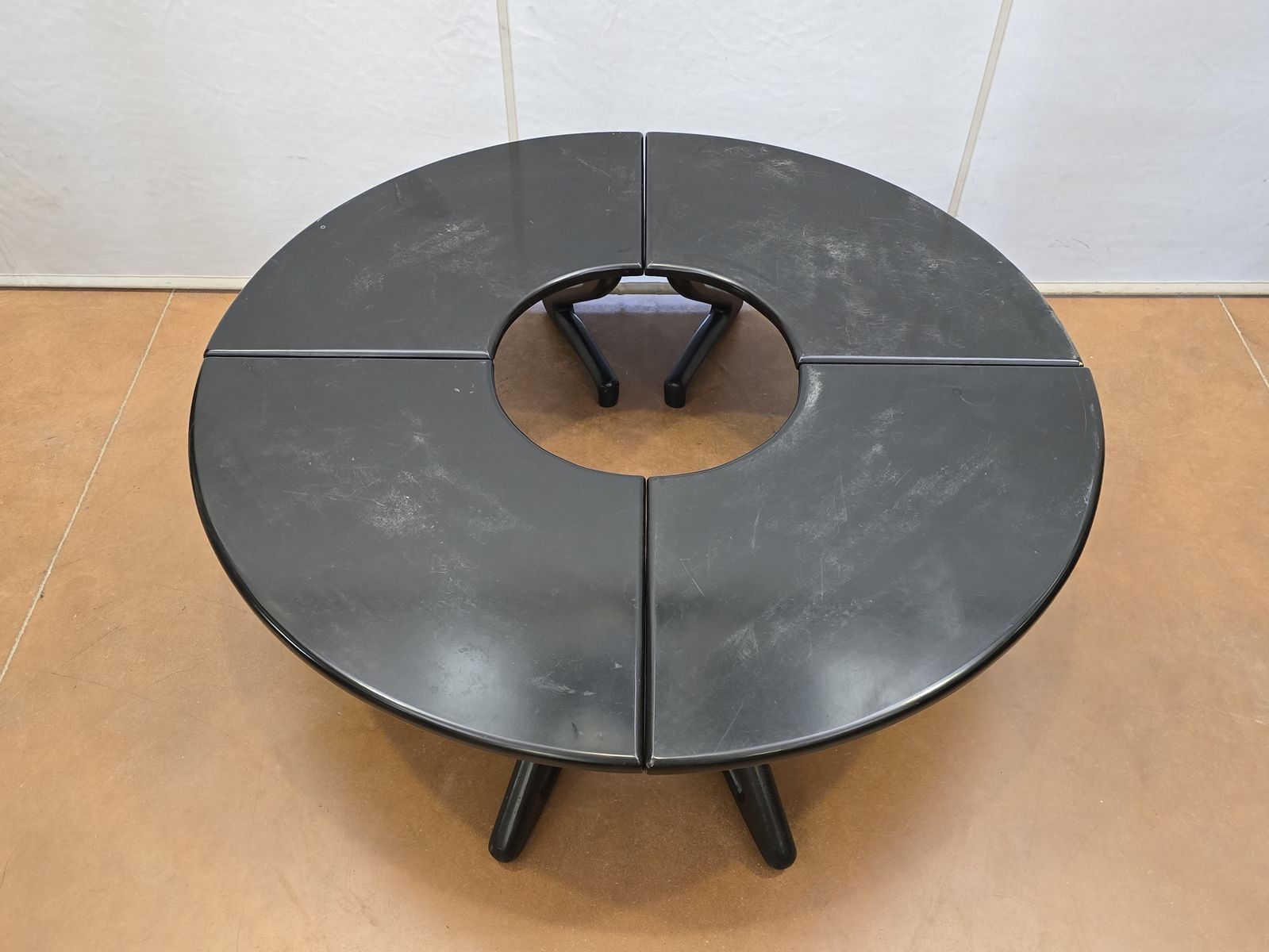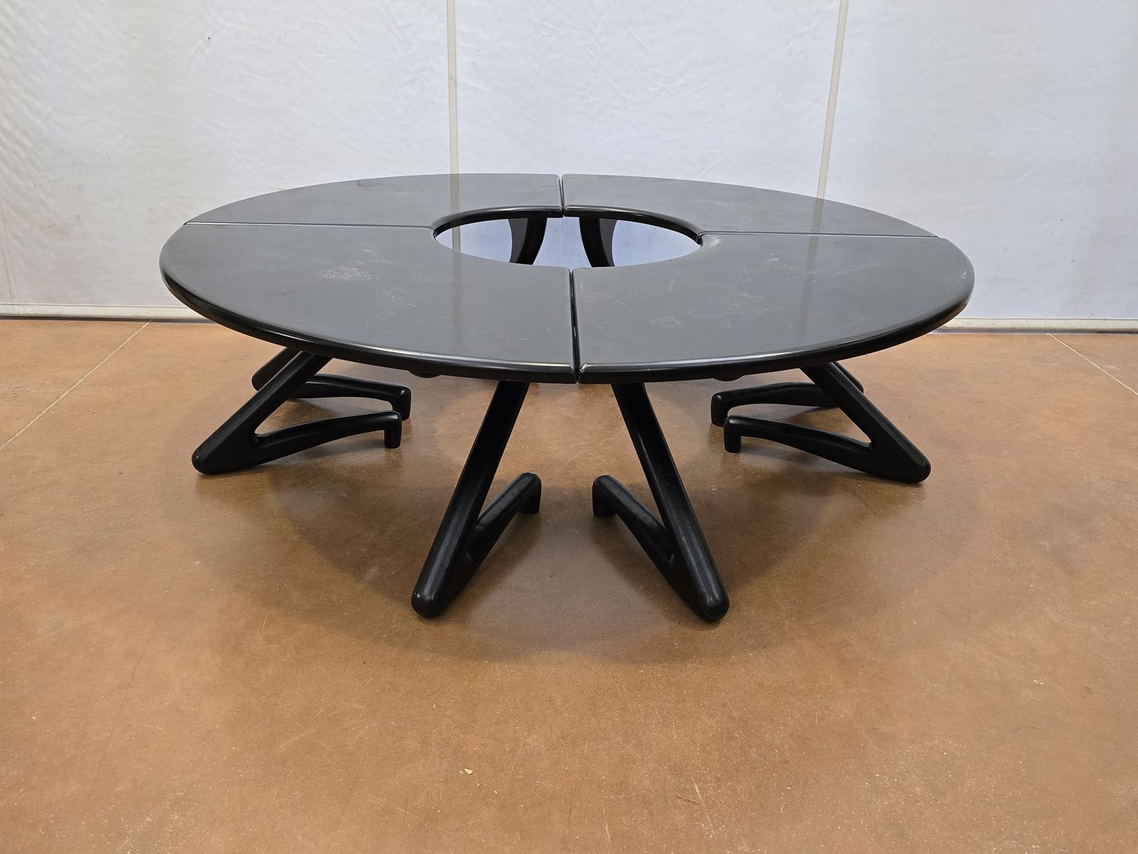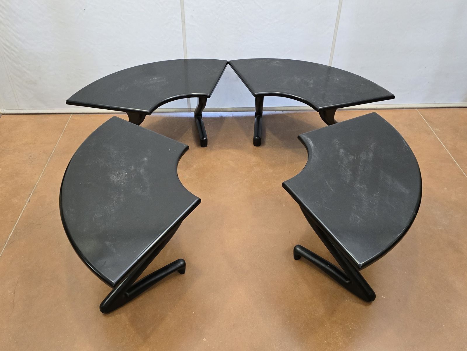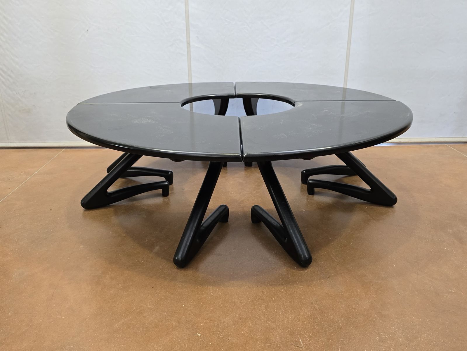 Low wooden TABLE made up of four interlocking elements. Curved legs. Height 44 cm
