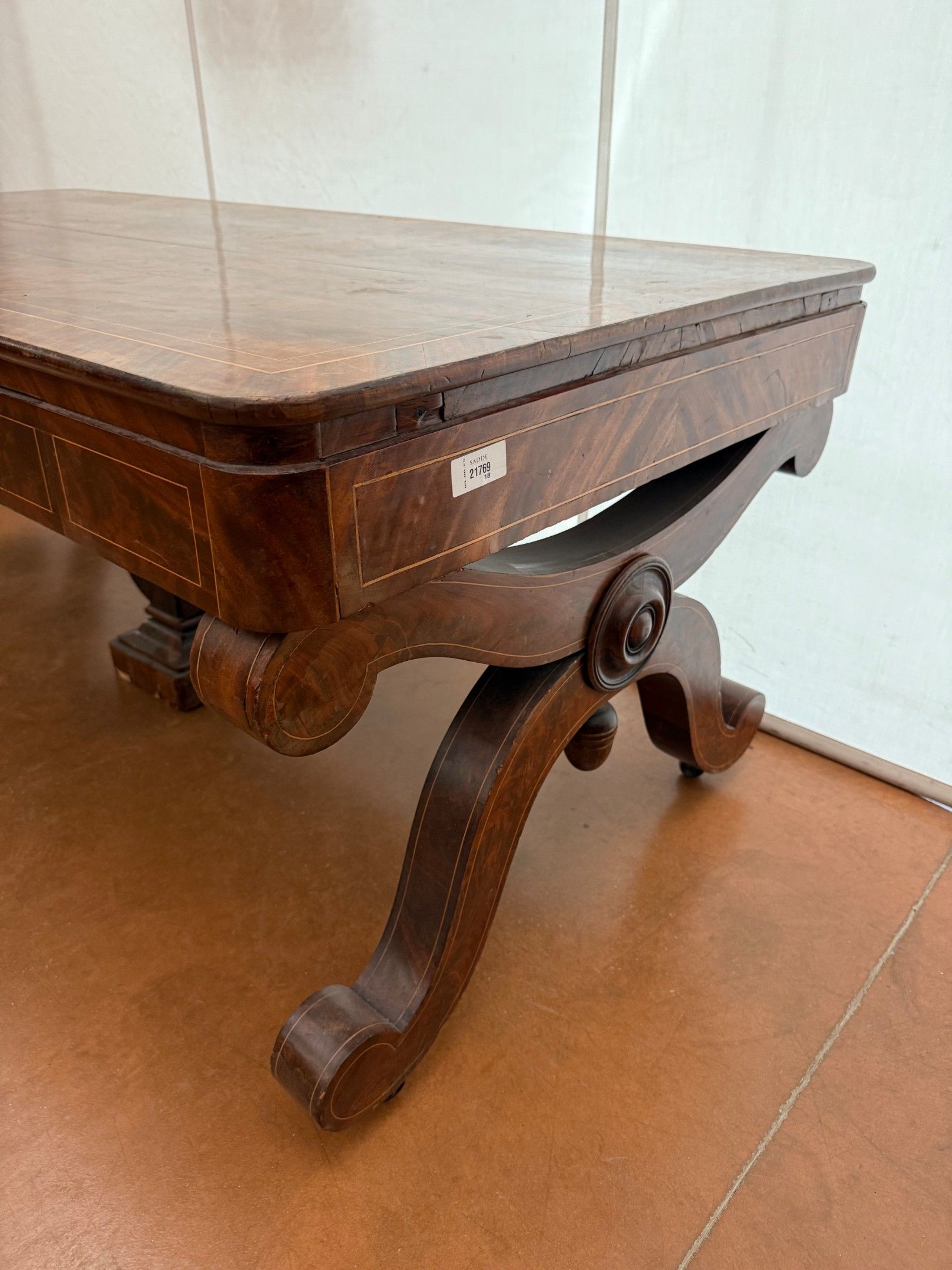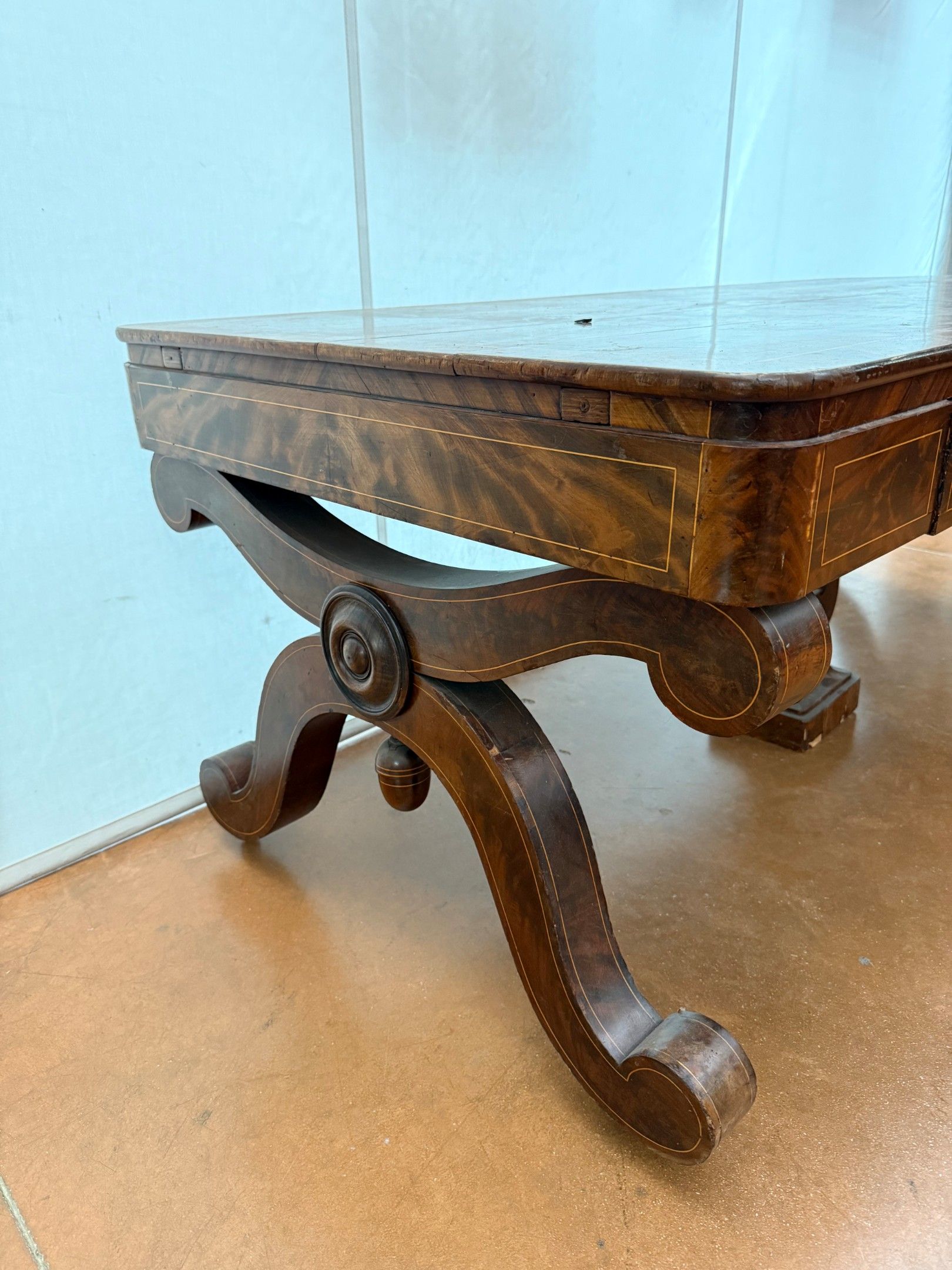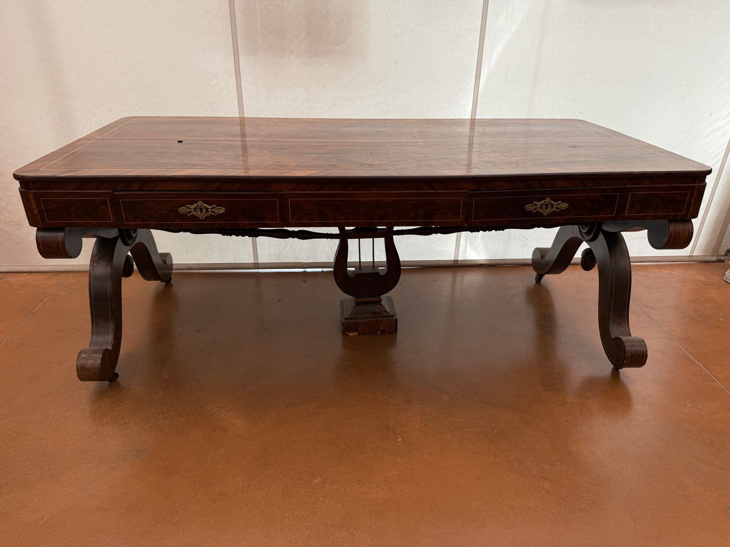 Flamed mahogany veneered DESKTOP. 3 drawers in the belt. Louis PHILIPPE period. Old piano forte. 73 x 187 x 87 cm. Restoration.