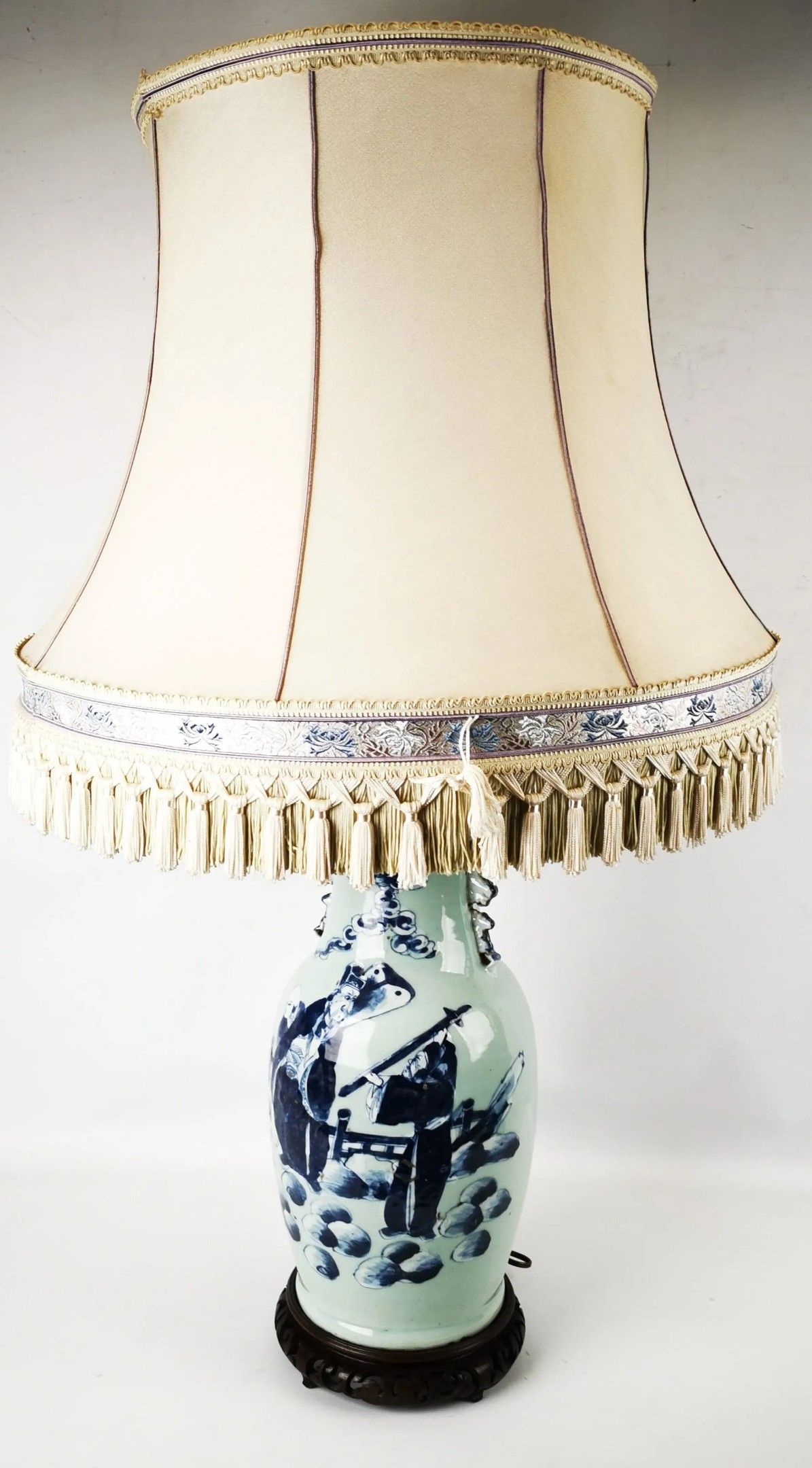 CHINA. A lamp-mounted porcelain vase with blue figures. H .53 cm.