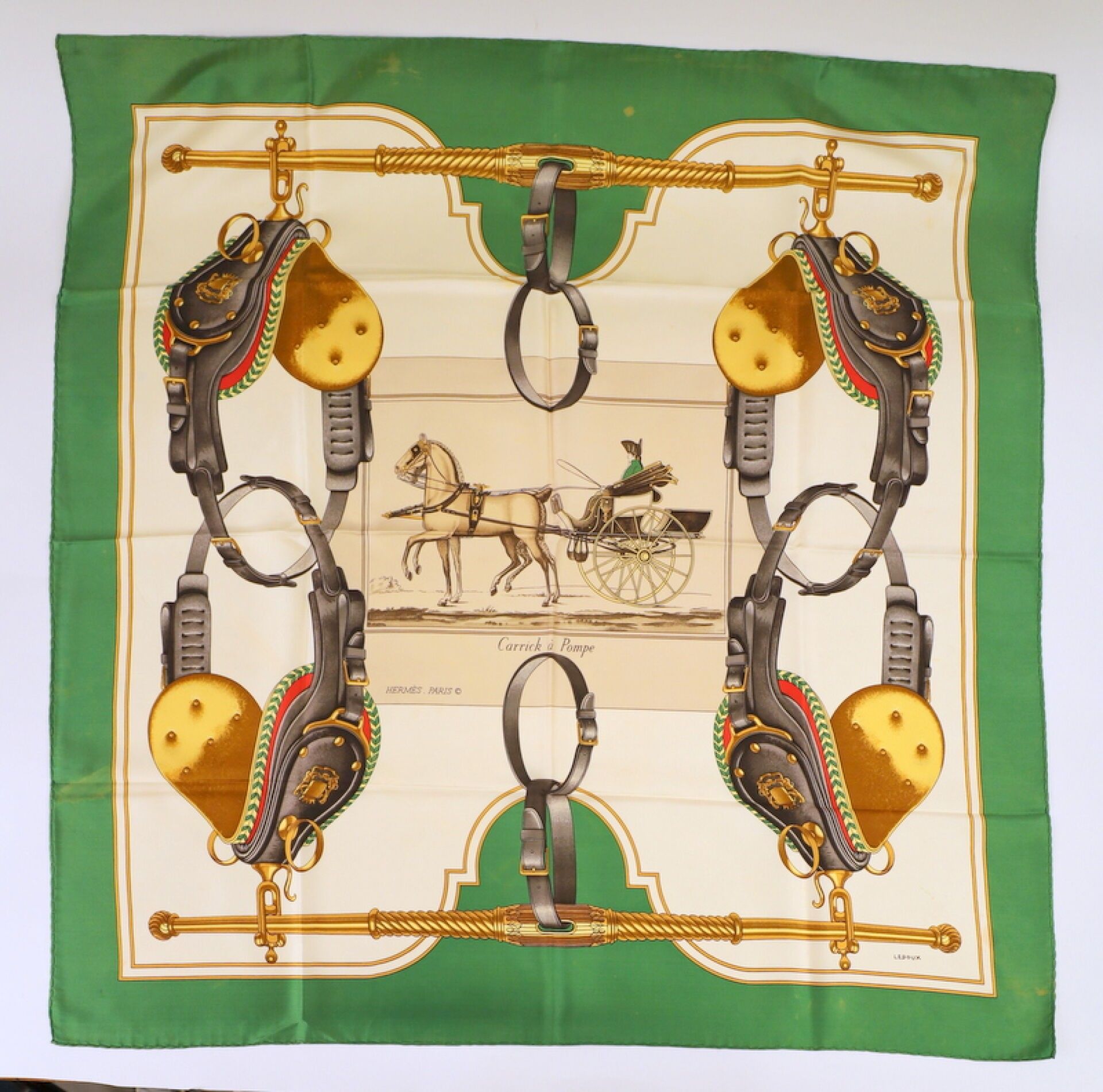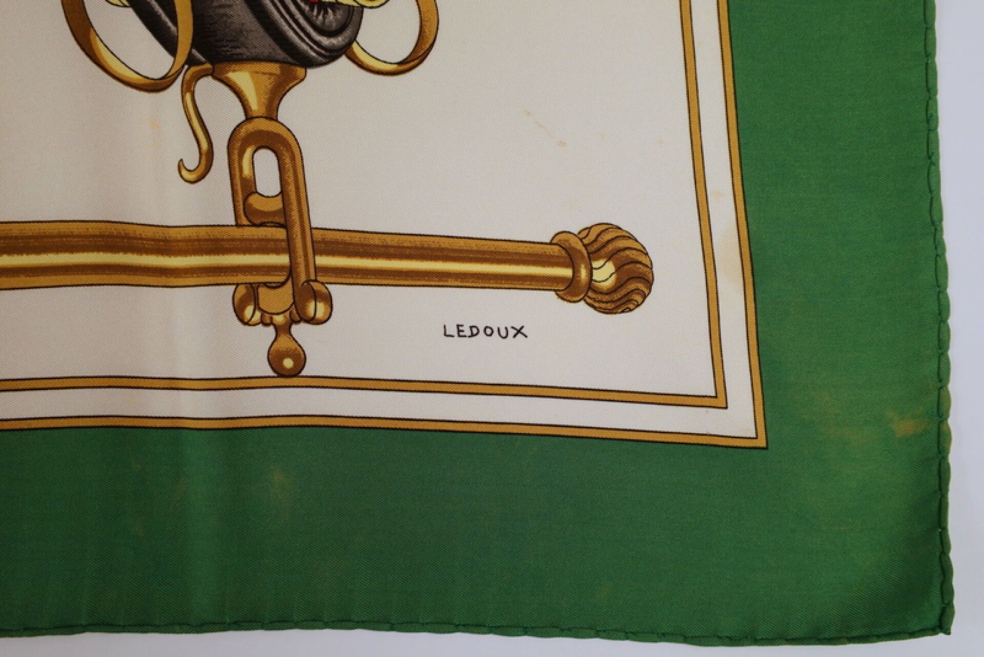 HERMES Paris - Silk square printed and titled "Carrick à pompe" Designed by Ledoux. Ivory background and green border.