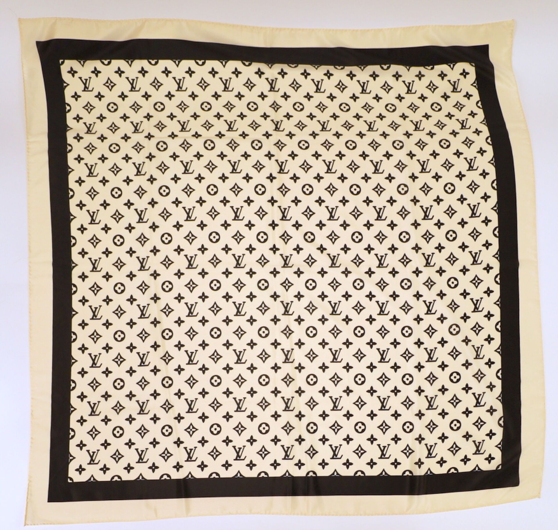 Louis VUITTON Paris Made in France - Silk square printed with black Monogram motifs on an ecru background (used condition)