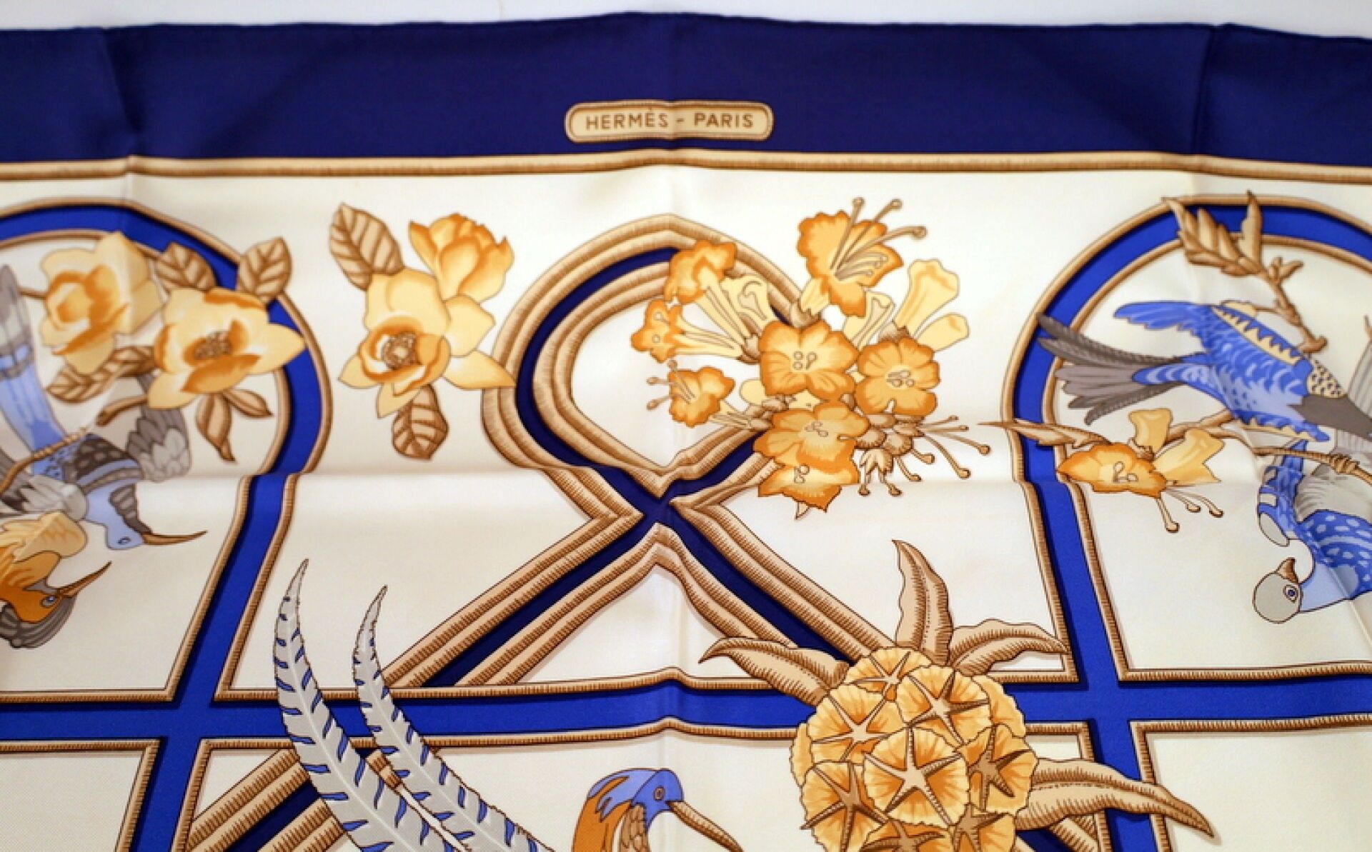 HERMES Paris : Silk square printed and titled "Caraïbes". Designed by C. VAUZELLE, in shades of blue, ivory and camel. Size: 90 x 90 cm.