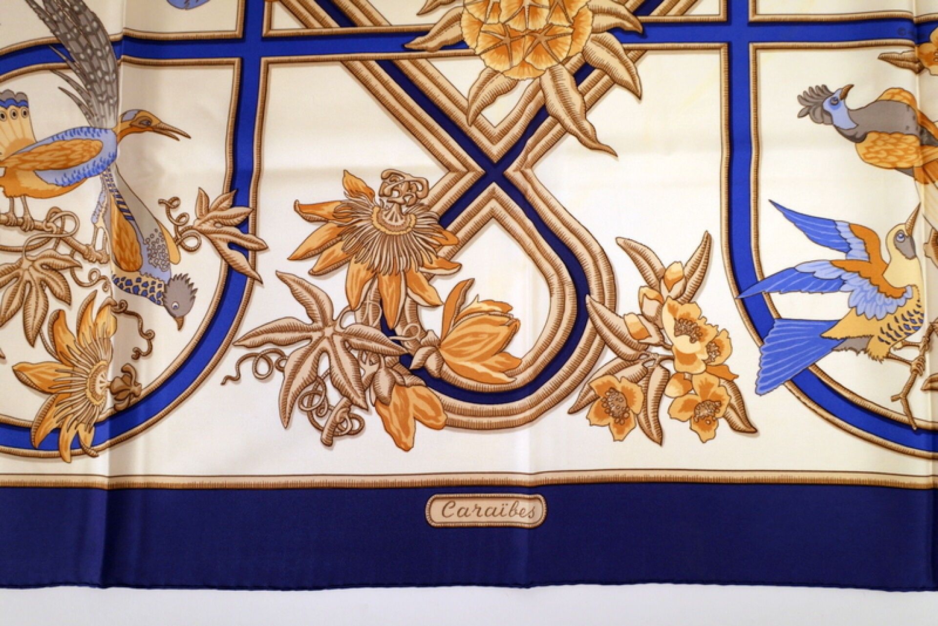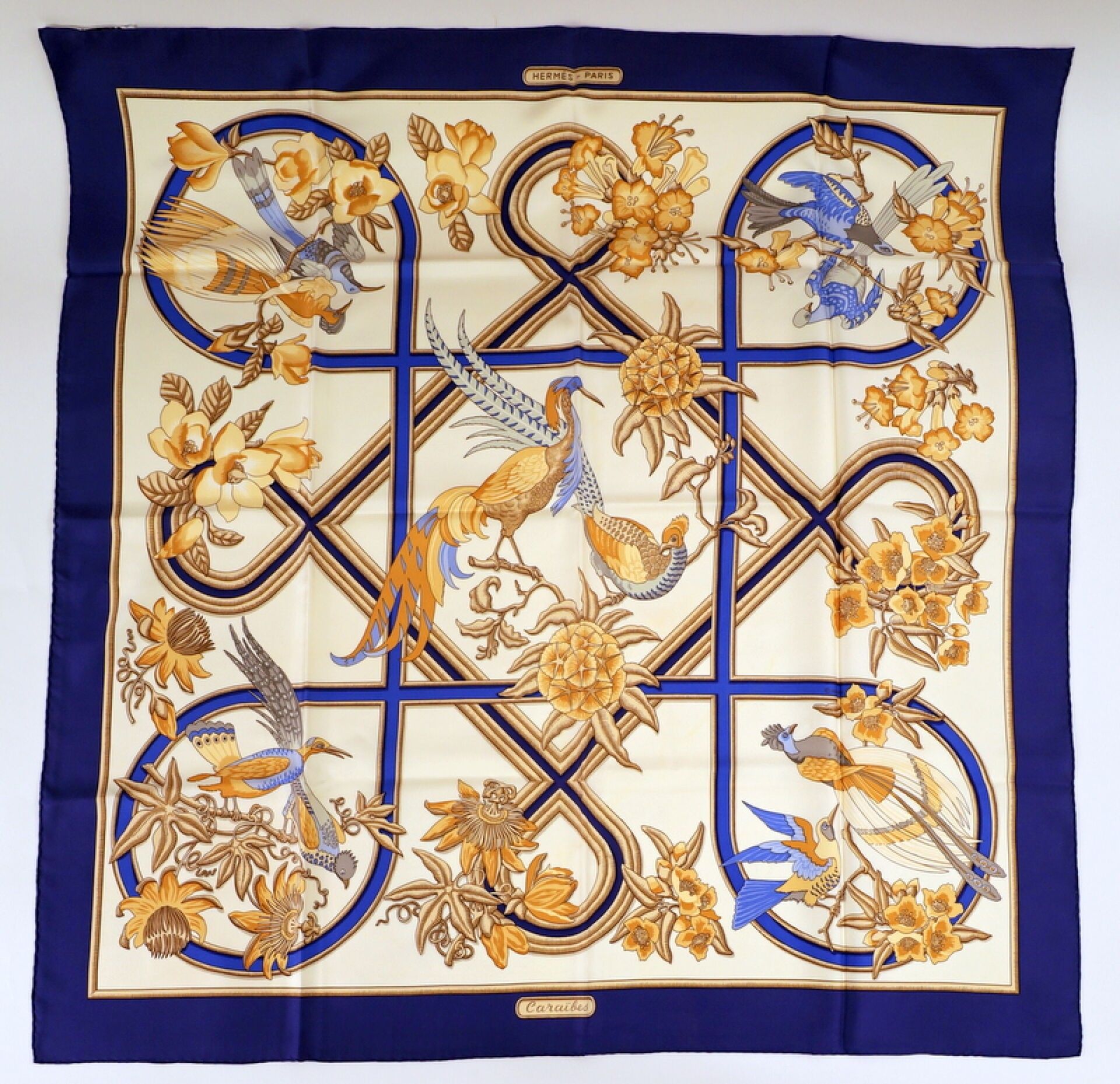 HERMES Paris : Silk square printed and titled "Caraïbes".