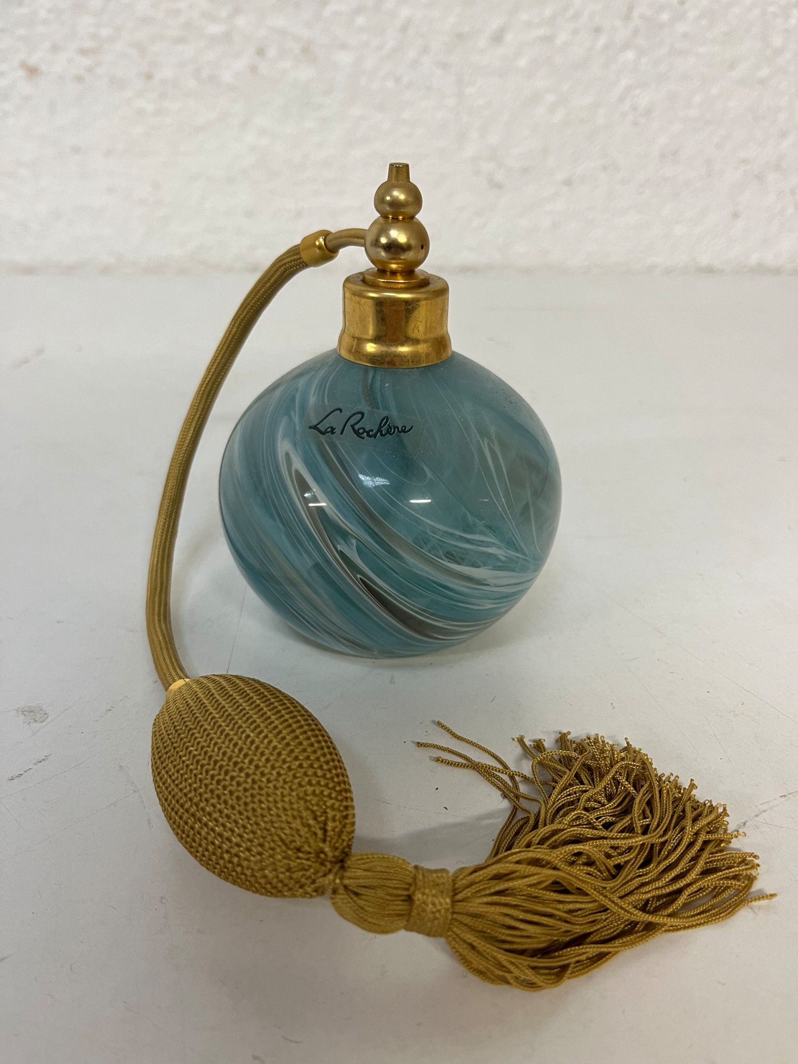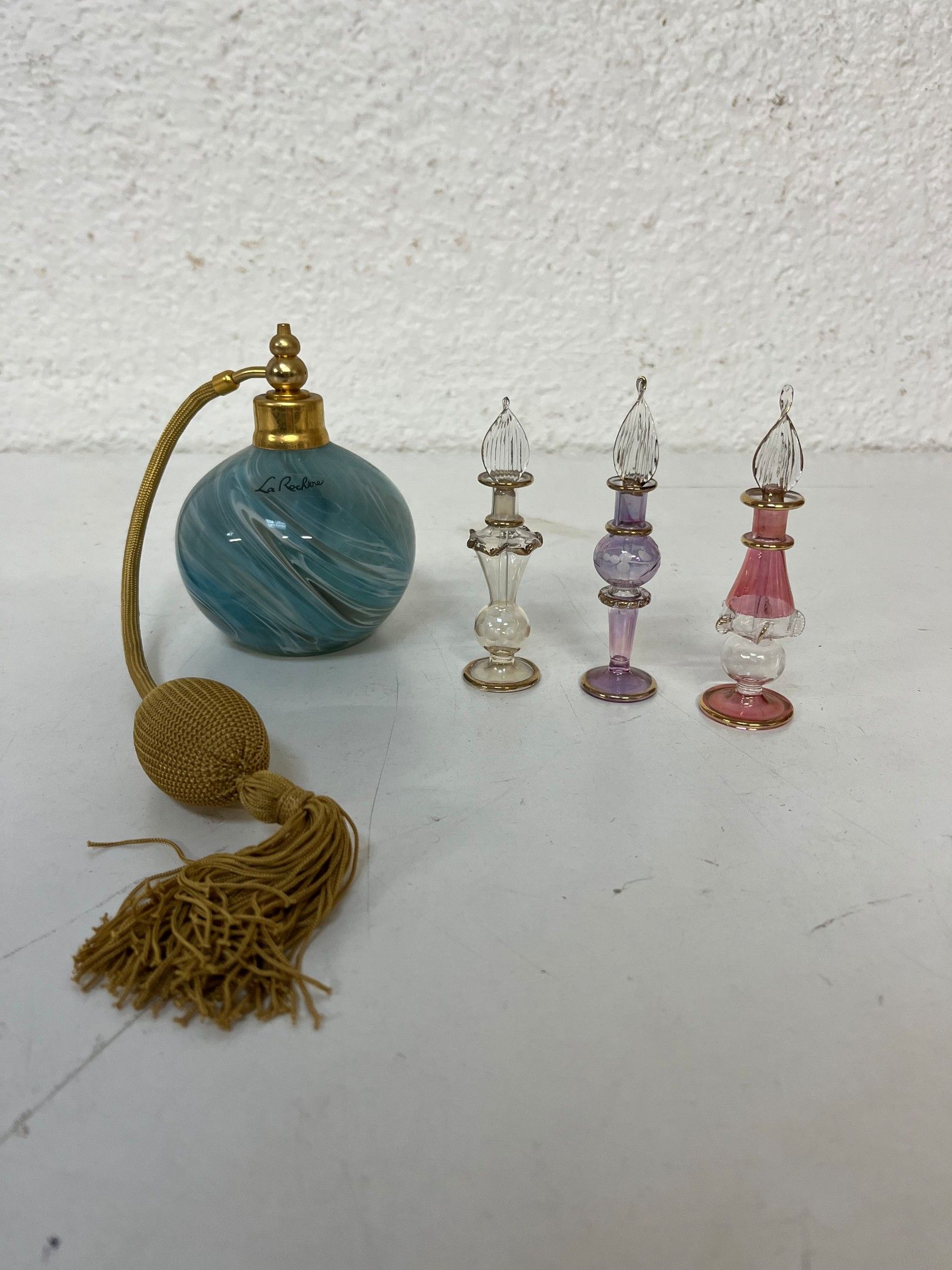 J / Set of glass perfume bottles: three "Egyptian" bottles and a glass spray bottle labelled "La Rochère".