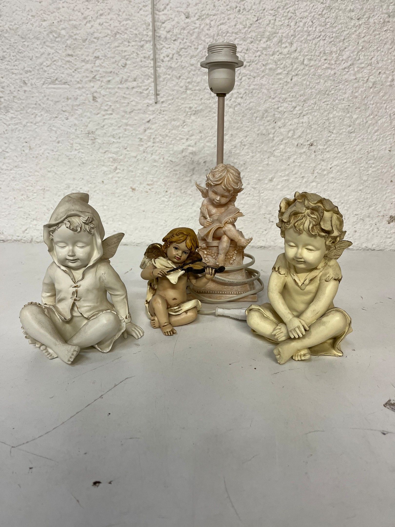J / Three resin and plastic figures of seated cherubs, and a lamp with the figure of a seated cherub
