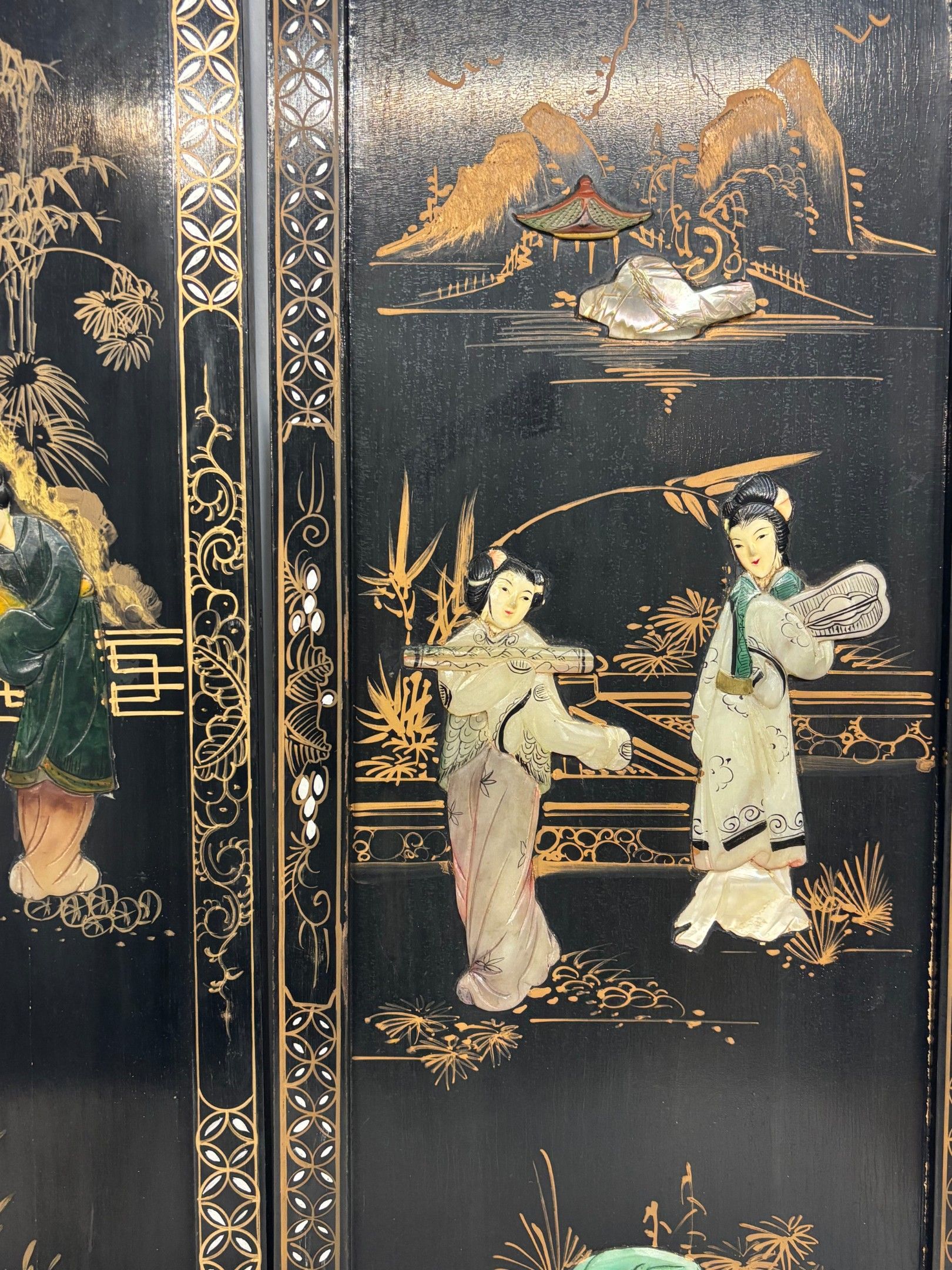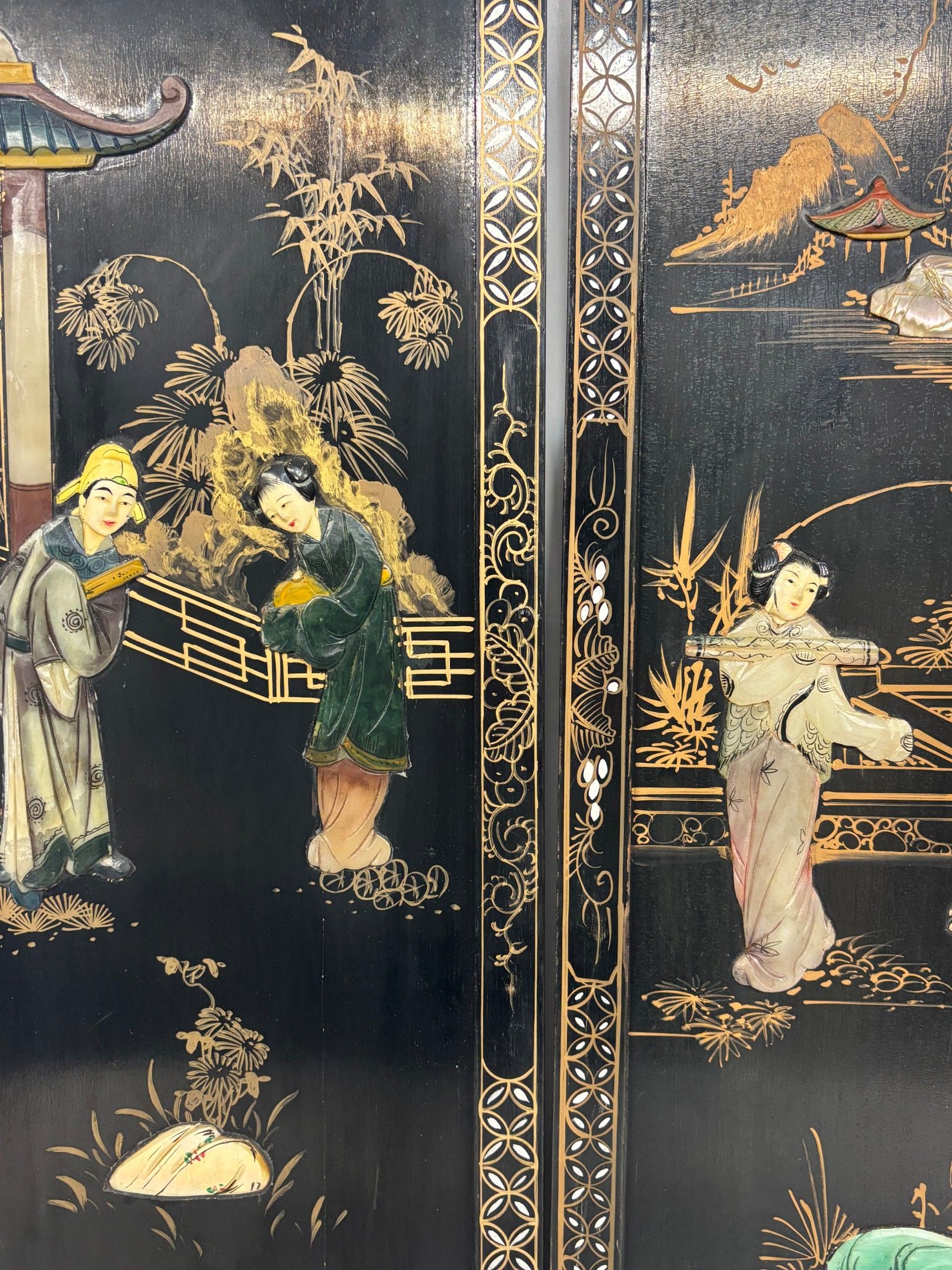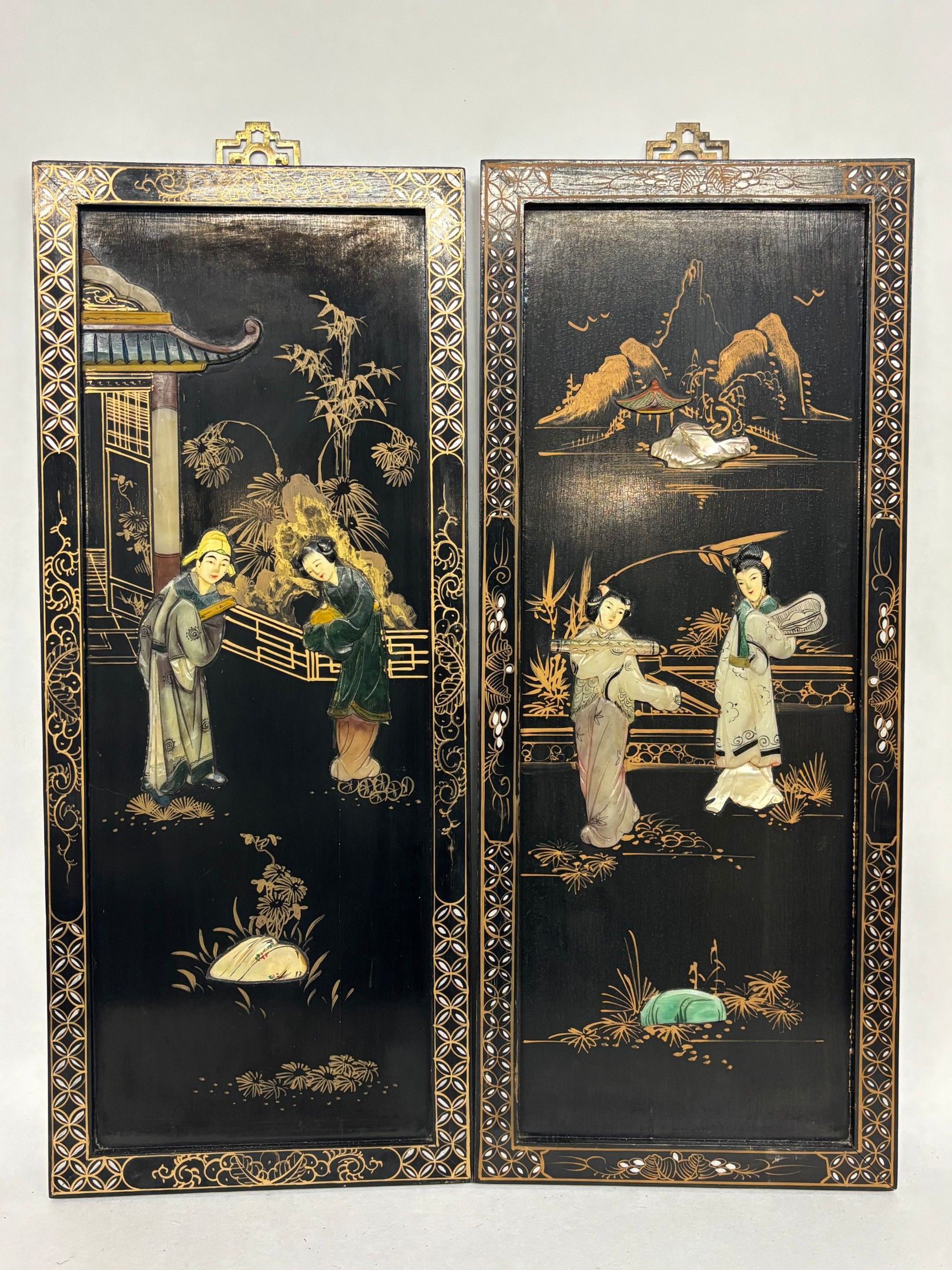 J/Pair of panels in the Chinese style with painted and applied decoration in resin